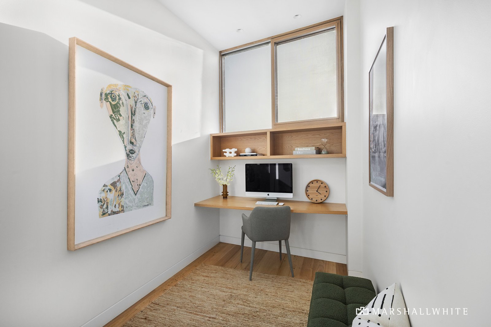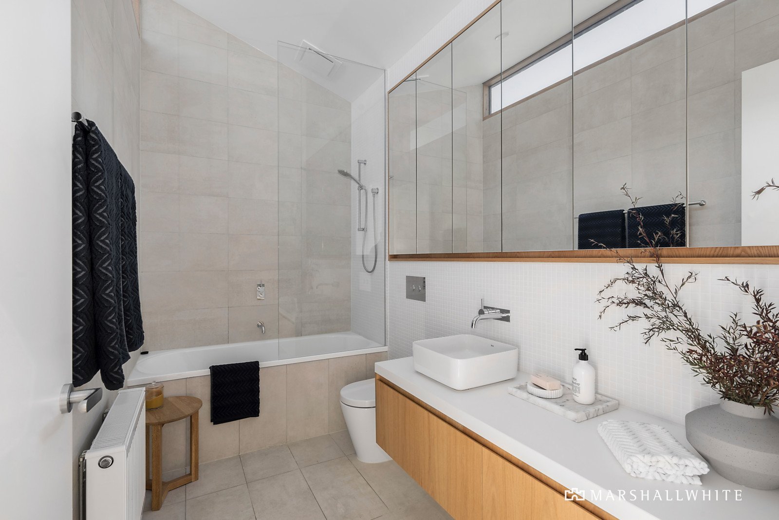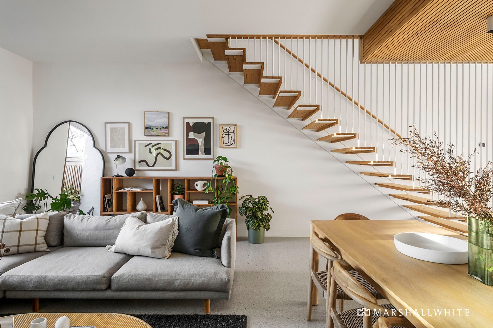 Beyond a handsome Hawthorn Brick facade, the architectural transformation of this 3-bedroom, 2-bathroom Victorian residence delivers a state-of-the-art family domain, with a symphony of artisan finishes, glorious natural light and durable designer luxury. Retained period features within the arched entrance pay homage to the home's origins, whilst the contemporary extension delivers a haven of refuge with its refined raw elements and flawless finish. Conceived and crafted without compromise, polished concrete floors unite with soft timber and full-height glass sliders, extending the open-plan living and dining zone to the private terrace. Matte porcelain benchtops and soft-close storage continue the soothing tone within the state-of-the-art kitchen, showcasing a range of Fisher & Paykel appliances, including an integrated fridge/freezer, induction cooktop, and an integrated Bosch dishwasher. A naturally-lit cantilever staircase ascends to two double bedrooms with bespoke robes, a central designer bathroom, and a spacious retreat with a built-in study nook. An indulgent main bedroom features custom-designed robes and a lavish en suite and boasts a tranquil ground-floor setting with the warmth of an original OFP. Situated within a tightly-held enclave just a short stroll from MSAC, city-bound trams, Albert Park Village and the beach, an endless list of features includes nest controlled hydronic heating panels and underfloor heating (living room), Euro laundry, 5kW solar, auto irrigation, grey water and abundant storage.