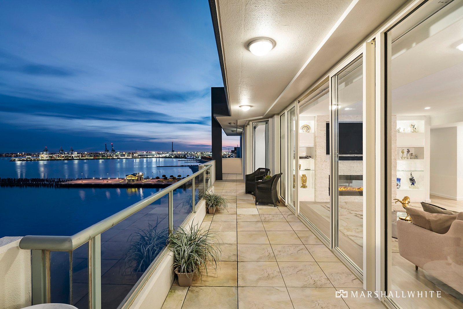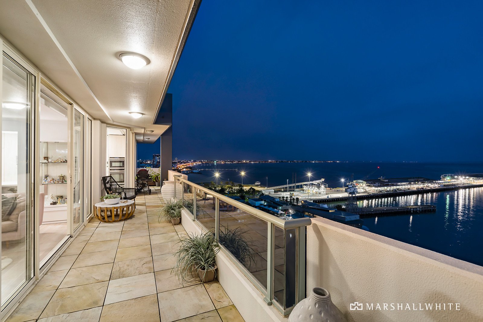 Entertainers will celebrate a bold stone kitchen with high-end European appliances, a wine fridge, and an integrated Liebherr fridge/freezer, providing a seamless connection to the open-plan domain with a gas fireplace and sliding doors to the terrace. The lights of the coast and Station Pier provide an unforgettable backdrop to everyday living and entertaining, reflecting off the mirrored wall within the dining area and enriched by the soft glow of red-hued sunsets over the water. All three robed bedrooms offer the added luxury of terrace access, including the private main with a bespoke marble ensuite and fitted walk-in robes. Marble surfaces continue to the family bathroom with a feature freestanding bath and dual shower, whilst a powder room adds further function and ease.