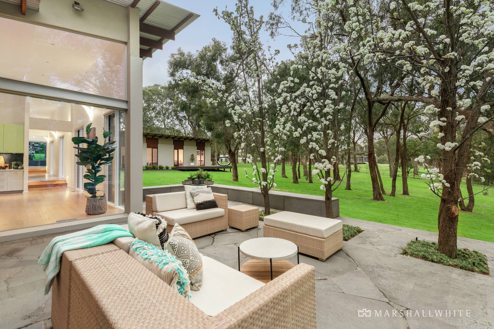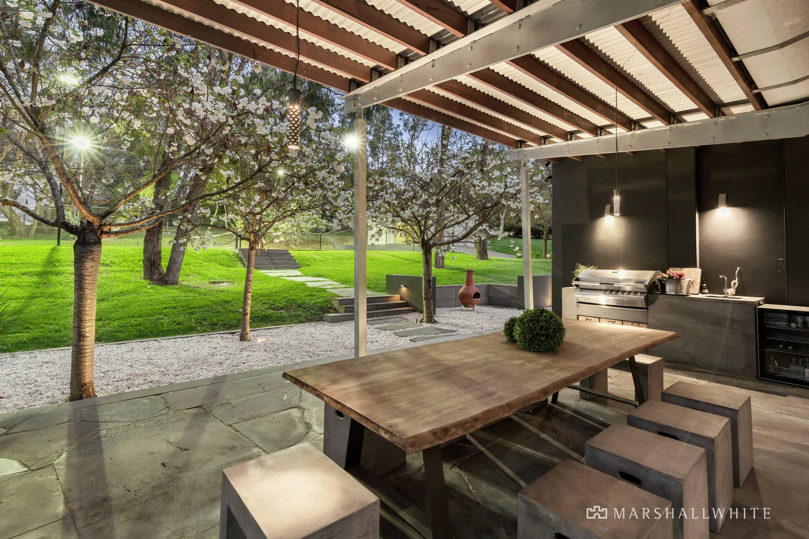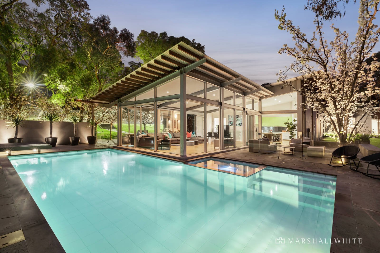 A landmark, architect-designed masterpiece, this sprawling five-bedroom residence brilliantly merges Jack Merlo-designed gardens, poolside alfresco living and a tennis court, all against the backdrop of lightly scattered trees. Incredible floor-to-ceiling windows create an indoor-outdoor connection most can only dream about in this remarkable, state-of-the-art home situated on two flat acres (approx.) where you can watch kangaroos gather by your back fence.