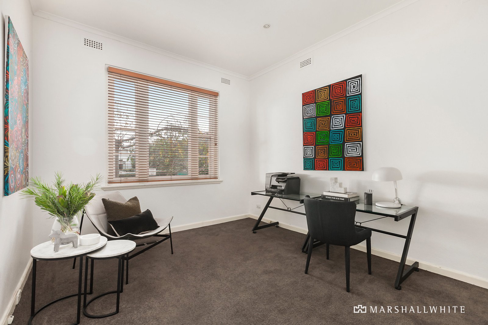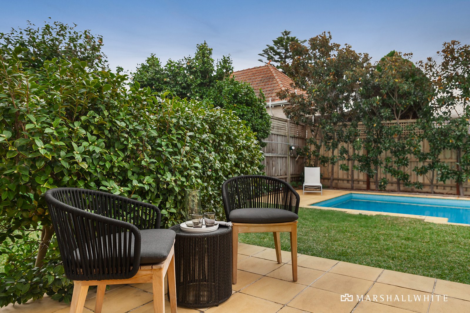 Tall ceilings and wide oak floors create a welcoming ambience in the generous entrance hall which flows through to a home office, media room/retreat and expansive living room with an open fire. The superb granite kitchen appointed with a 90cm Ilve oven and Miele dishwasher capably serves the spacious sun-drenched dining room. Two sets of French doors open the living to the deep north-facing garden with a pool and entertaining terrace, privately set behind a row of Magnolia trees. An extra-broad staircase leads up to the impressively spacious main bedroom with open fire, large walk in robe and bright en suite, a second bedroom with built in robe and a fully tiled bathroom. There is also a third double bedroom with an equally large study or 4th bedroom, both with robes.