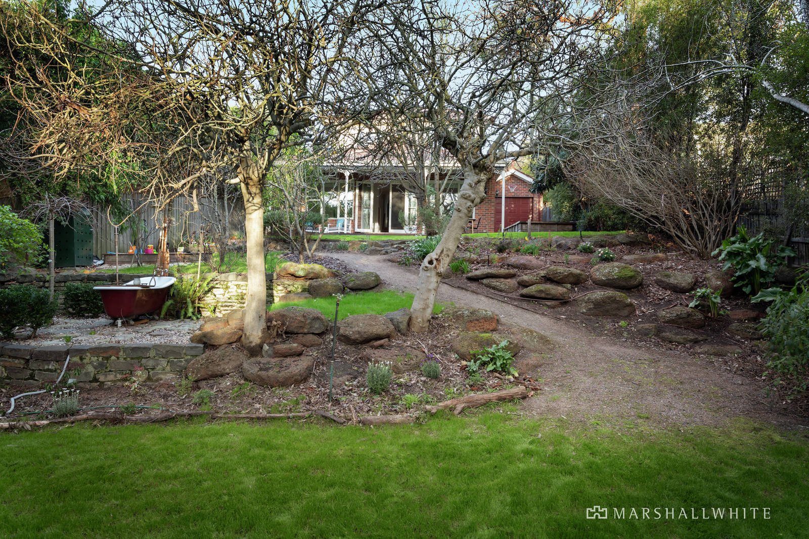 Steps down to an airy open-plan living area featuring a classic Farmers kitchen complete with Falcon oven, oversized timber island bench, Caesarstone bench tops and walk-in pantry. A sizeable laundry with outdoor access sits to the side. French doors open out from light-filled casual living/dining to a lovely undercover alfresco entertaining deck with views to the magnificent garden comprising abundant established trees, cubby house, kid's sand pit and delightful clawfoot bathtub.