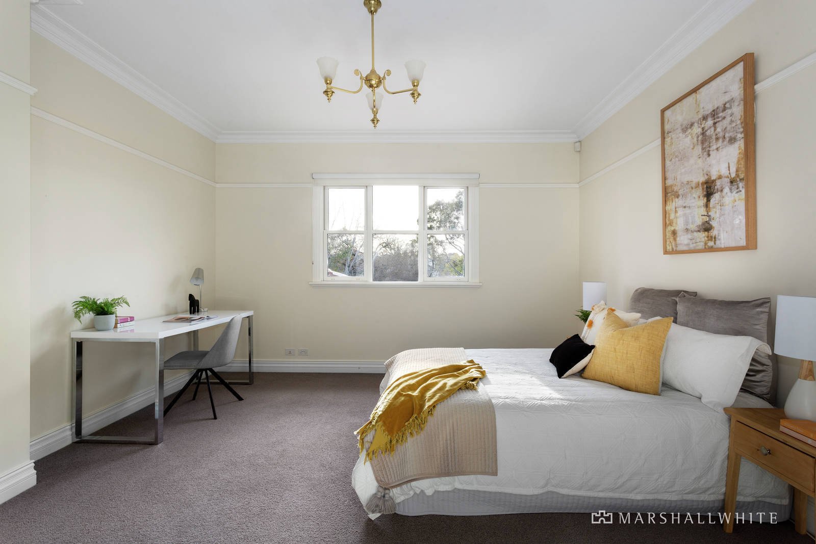 Opening to a wide entrance, timber floors and decorative archway, enter through stained glass doors into the refined formal living area with open fireplace. A pristine ensuite and walk-in robe sit adjacent to a stunning, spacious bedroom overlooking the manicured front garden, while generous formal dining leads to a study, further bedroom and bathroom with feature tiled floor and clawfoot bathtub.