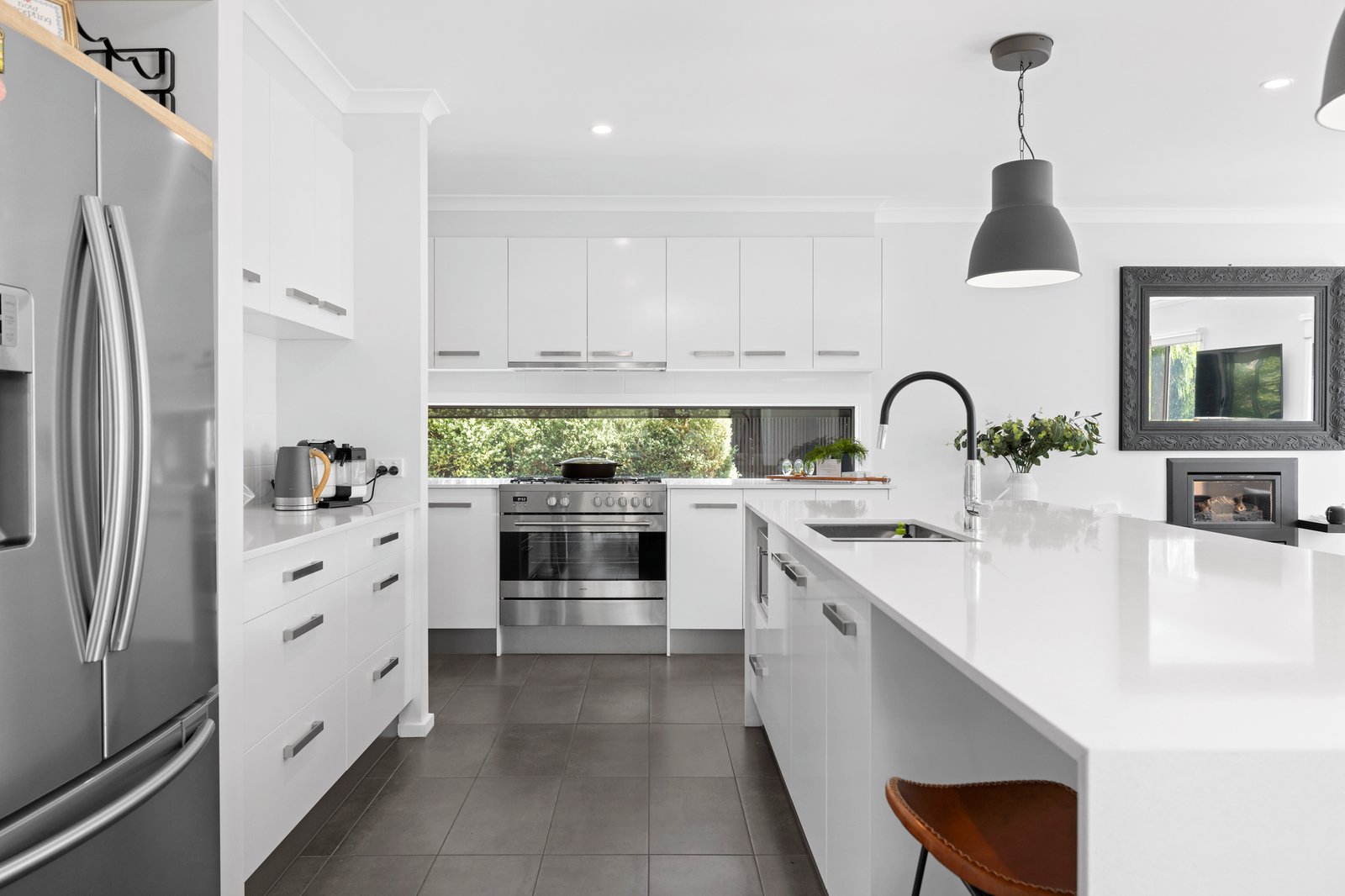 An interconnected living and dining zone with ceramic tiled flooring is flanked by kitchens on both sides. From grilling steaks in the covered barbecue kitchen (complete with built-in bar fridge) or preparing a full family feast in the culinary kitchen with cascading stone benchtops, a butler’s pantry, gas cooktop and premium appliances, the home is divinely appointed for all seasons and occasions.