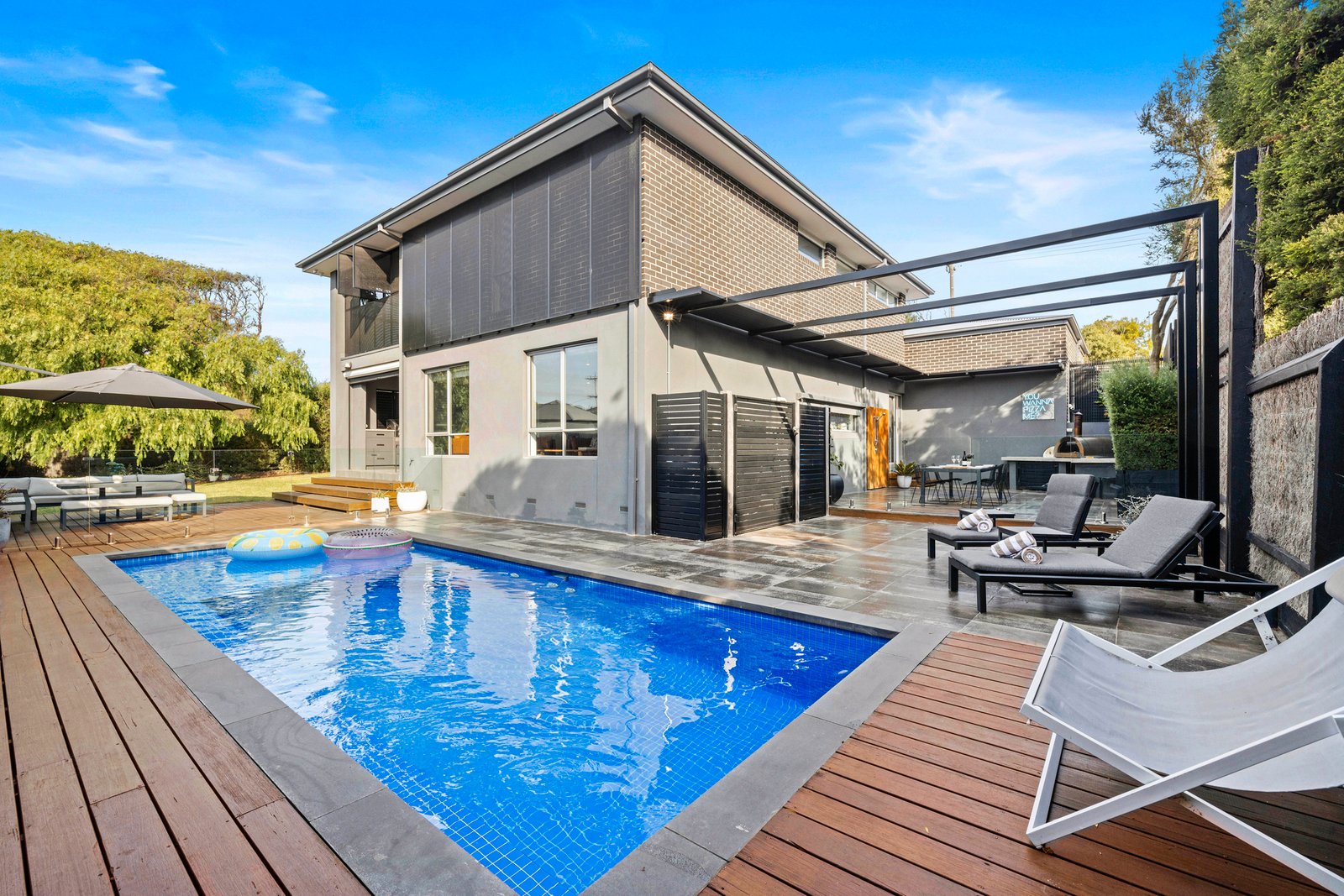 Whether curling up with a book before the gas log fireplace, lounging by the swimming pool or sipping sunset cocktails as dinner cooks in the outdoor pizza oven, the dual-storey residence offers an oasis of enviable modern living across an indoor-outdoor flow with a choice of two stunning living areas and an expansive poolside terrace providing an array of inviting spaces to lounge, dine and unwind after sun-soaked days out on the bay or in the surf.