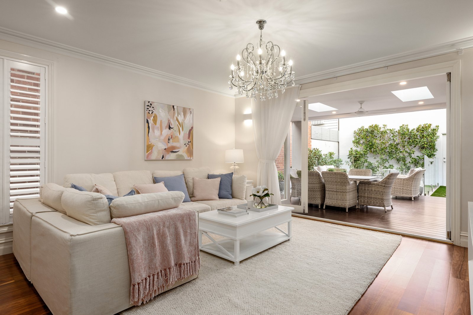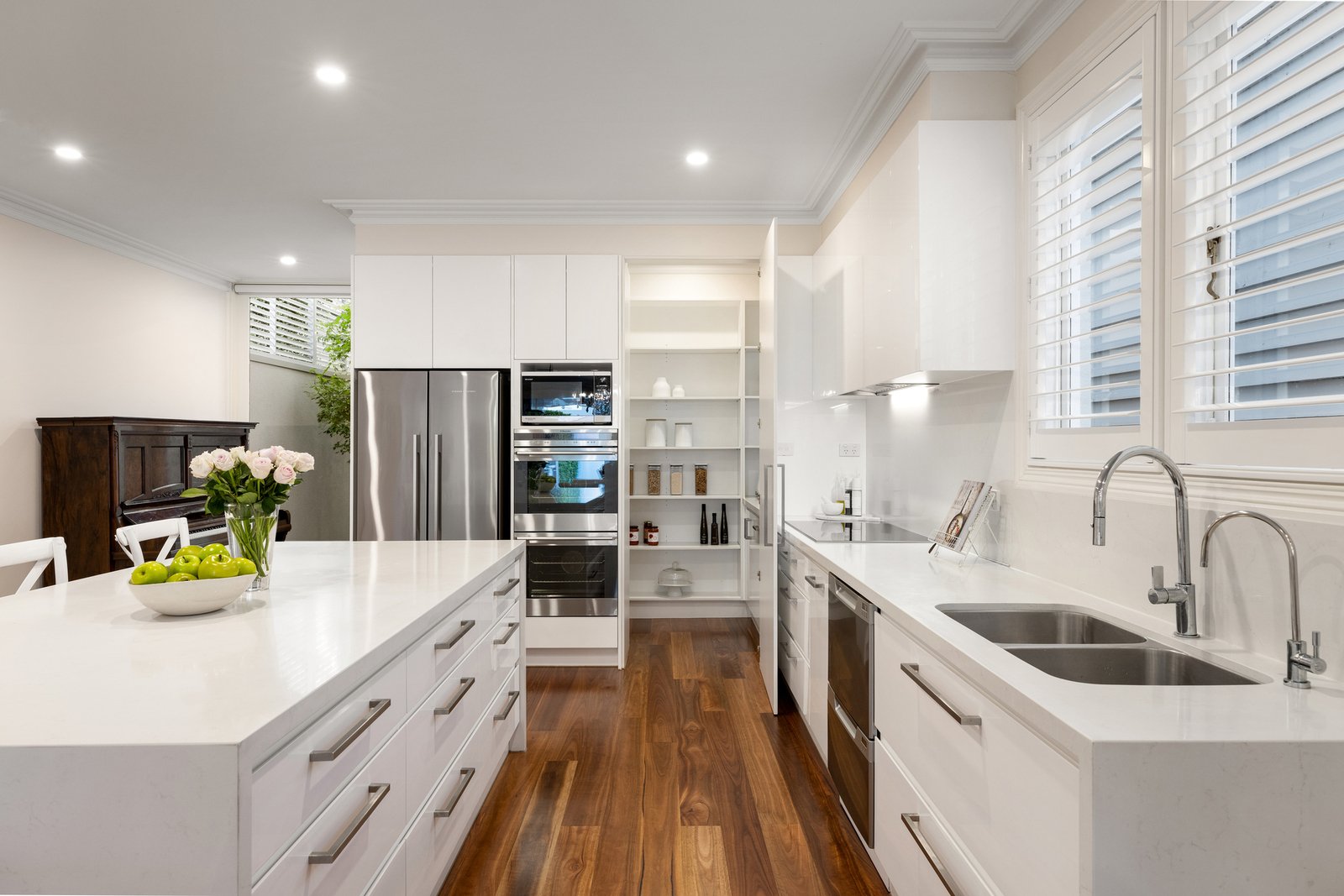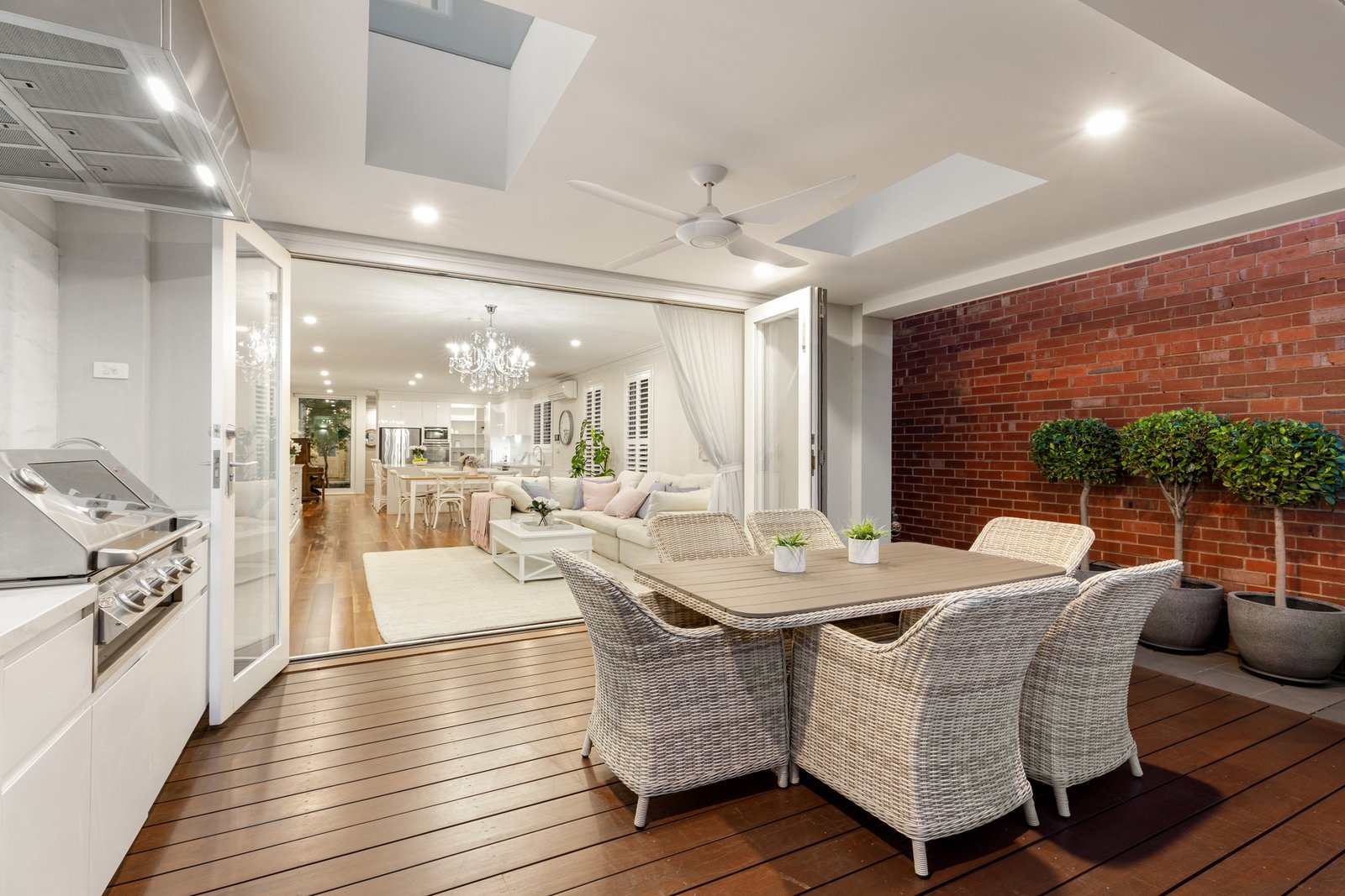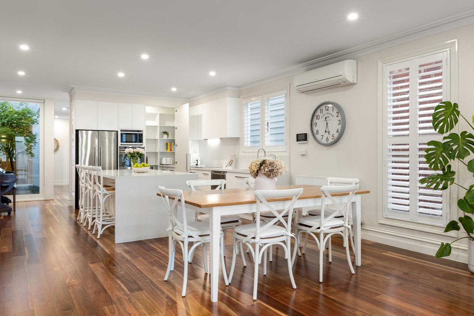 Created to sit harmoniously within the heritage streetscape, the inspired terrace facade unfolds from formal low-maintenance gardens into expansive interiors, defined by high ceilings, bespoke finishes and brilliant natural light. Spotted gum floors add warmth to the entry level, designed to flow from a quiet home office to enormous open-plan living and dining areas for full-scale entertainment and connection. The kitchen showcases sleek stone surfaces, dual ovens and an induction cooktop, connecting to a concealed butler’s pantry that keeps everything beautifully organised. Beyond bi-fold doors, the deep garden extends the living environment to an undercover deck with a built-in barbecue outdoor kitchen and a heated plunge pool, creating a true sense of escape within the city.