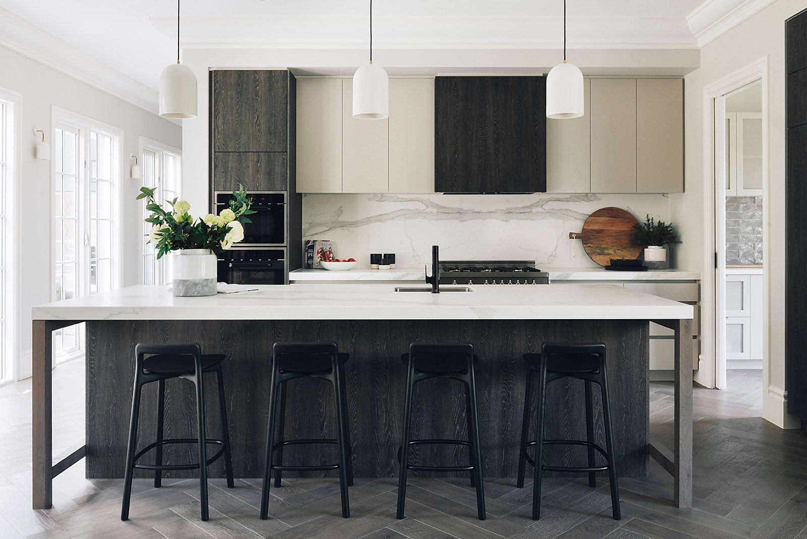 Back in the family area, the kitchen features a stunning porcelain benchtop, underslung sink and modern black sink faucet. The back wall bench features a cool solid porcelain stone splashback, solid porcelain stone bench tops, prestige built-in appliances including a large upright cooker, steam oven, microwave combi oven, rangehood, fully integrated dishwasher and fully integrated refrigerator and freezer provisions with overhead cupboards. The butler's pantry leading directly off the kitchen provides essential back-up storage and preparation facilities, with a second sink and storage.