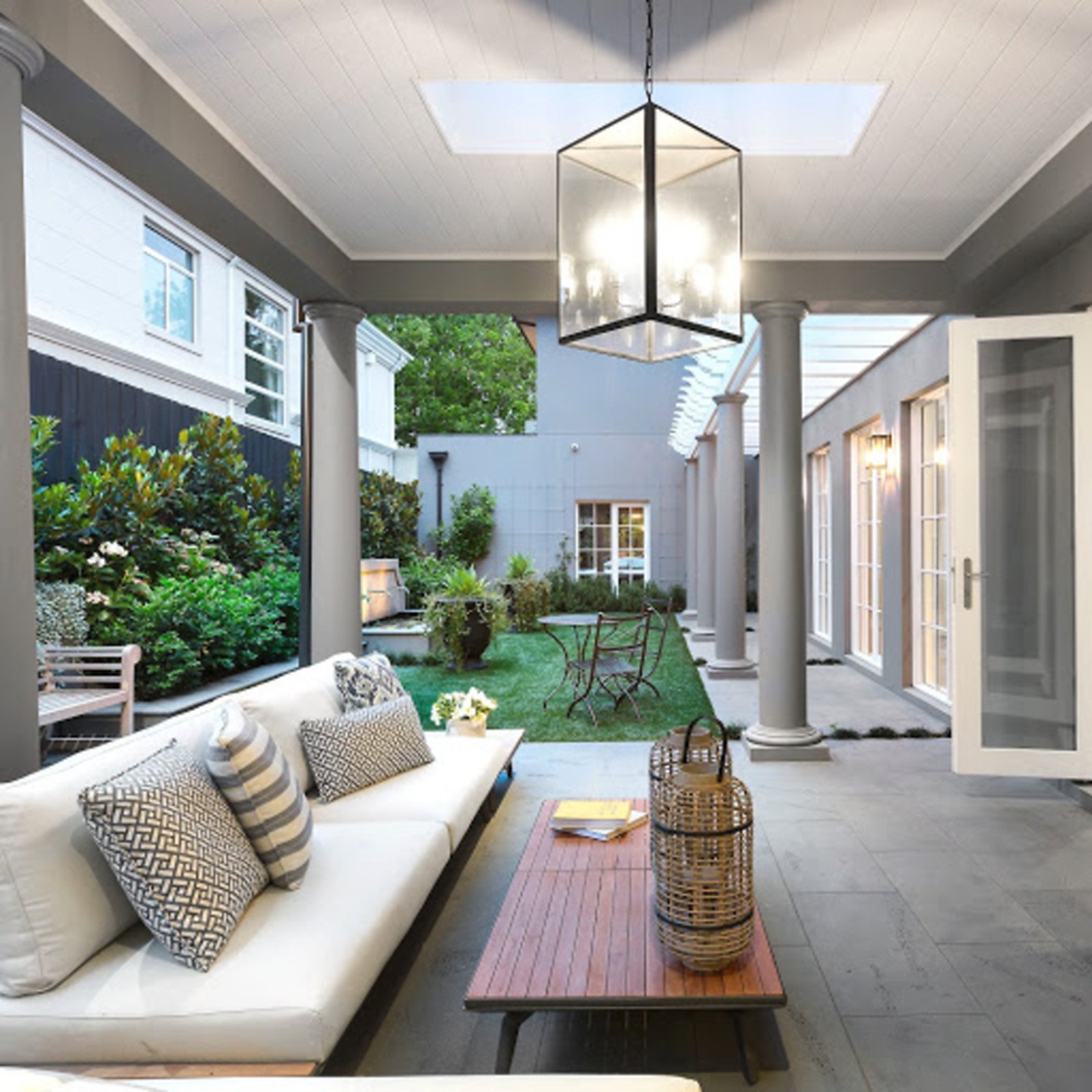 From the entry hall, the gallery leads to the informal part of the home. The gallery is glazed to the north with a series of window sets with pairs of French doors and feature glazing, opening on to the north-facing paved courtyard garden, set with signature tapering columns forming a pergola in the most classical traditional Tuscan style.