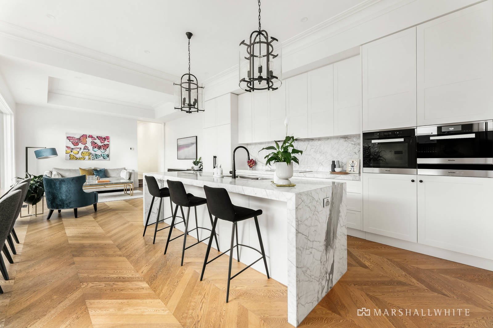 The luxe kitchen presents a statement Statuarietto marble kitchen island, benchtop and splash back, and includes Miele amenities, with a generous butler's pantry revealing plentiful shelving, cupboards, drawers and bench space.