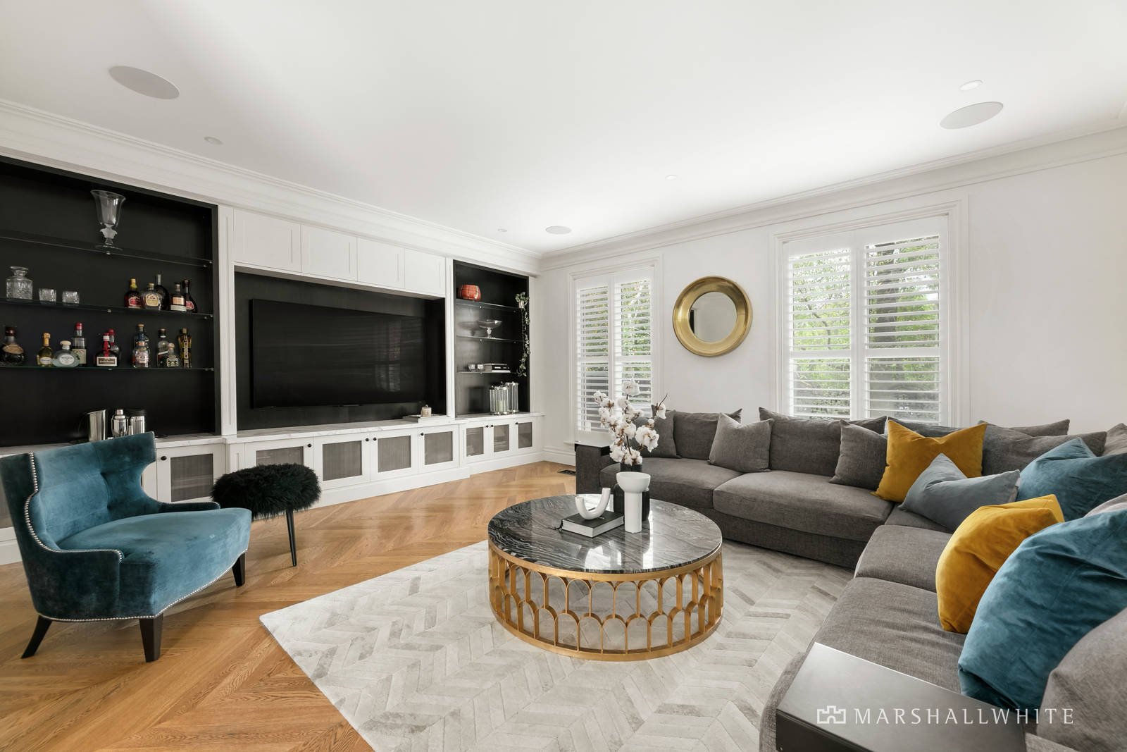 A serene and intimate lounge room at the back of the home delivers plantation shutters, built-in cupboards, shelving and TV.