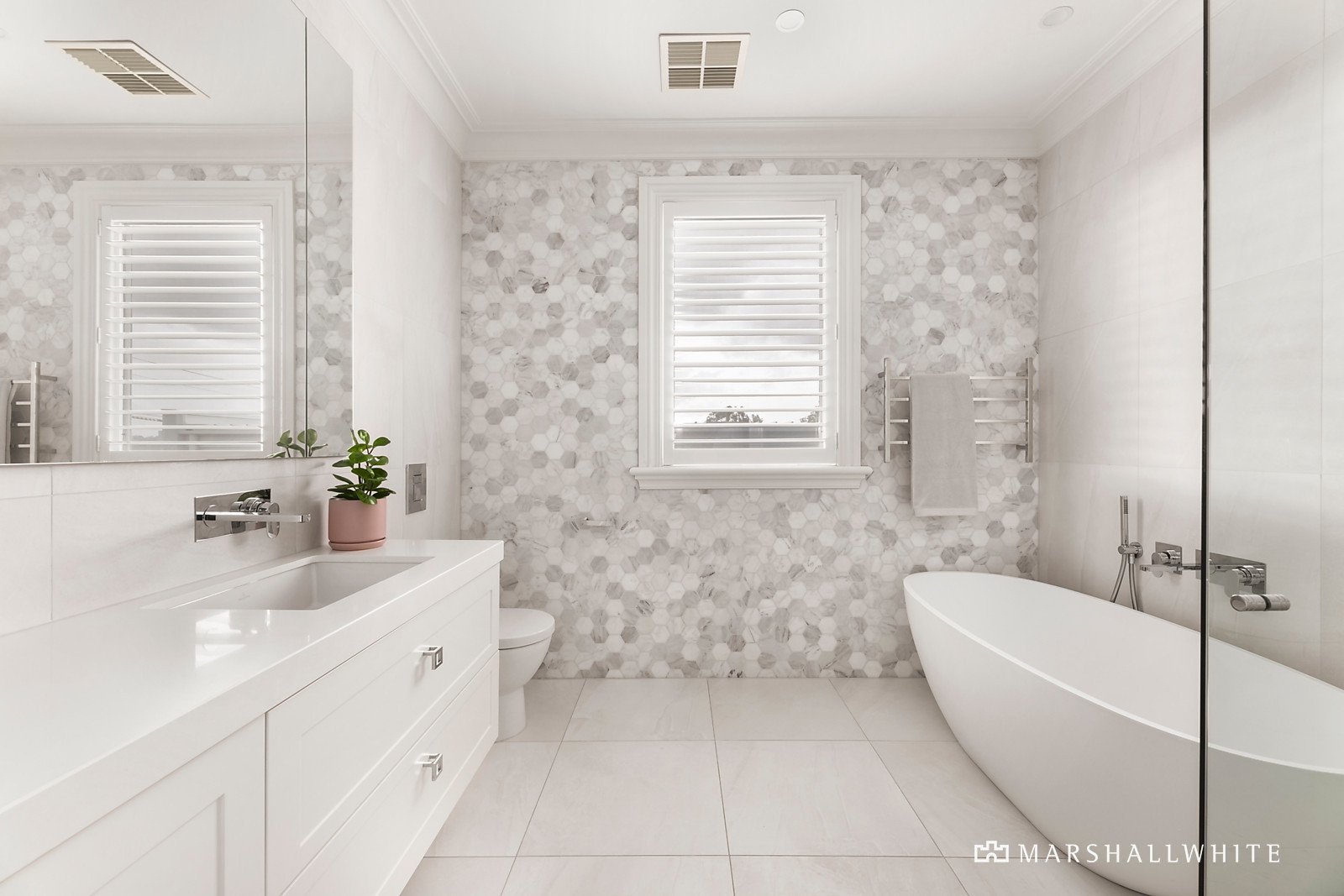 Upstairs, the sophisticated main bedroom is enhanced by a double basin vanity ensuite and walk-in-robe, the second bedroom with a walk-in-robe and built-in desk/shelving, and the third bedroom featuring bult-in-robes. A family bathroom sits between the bedrooms, with double basin vanity, shower and bath.