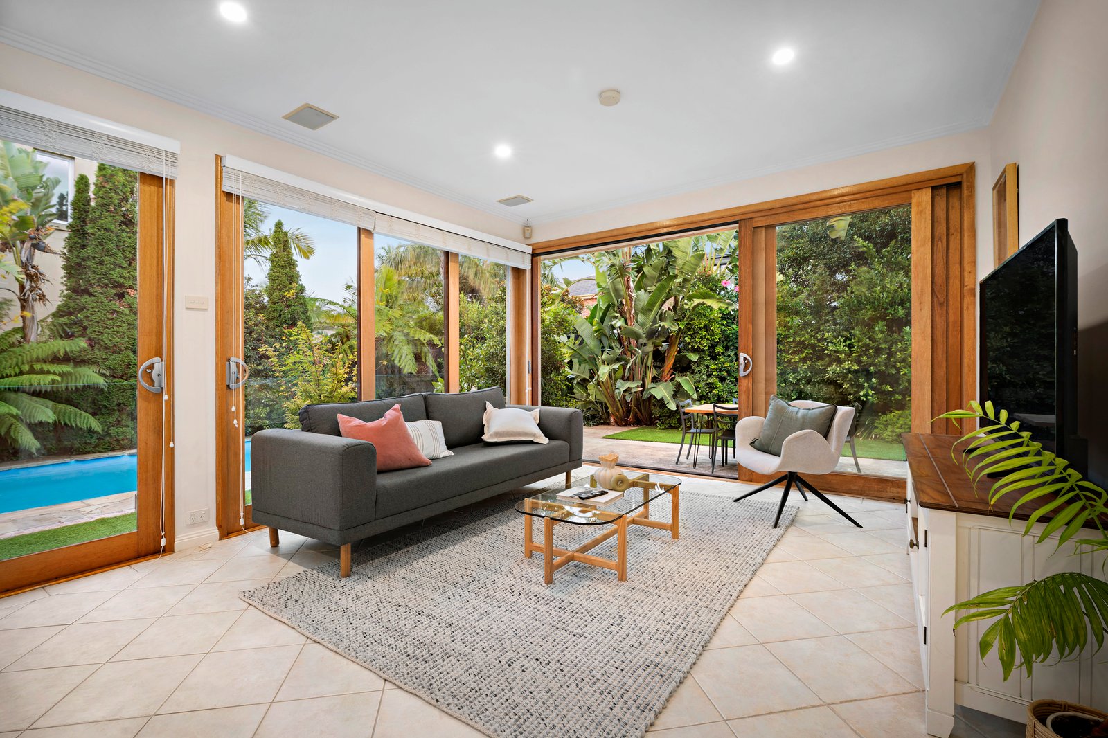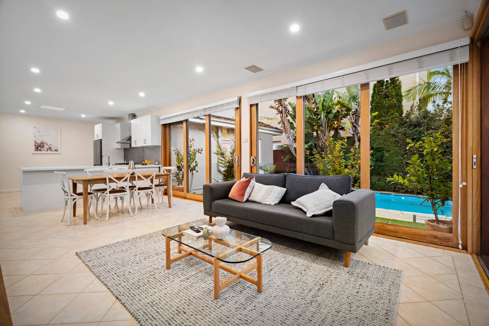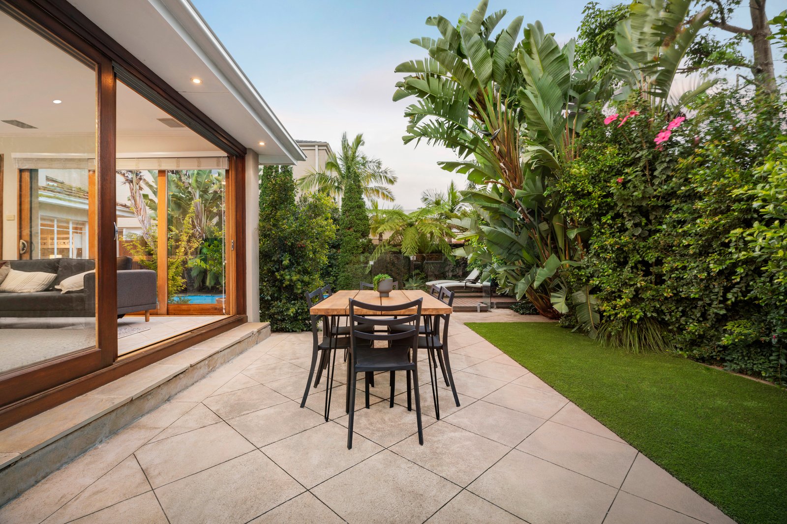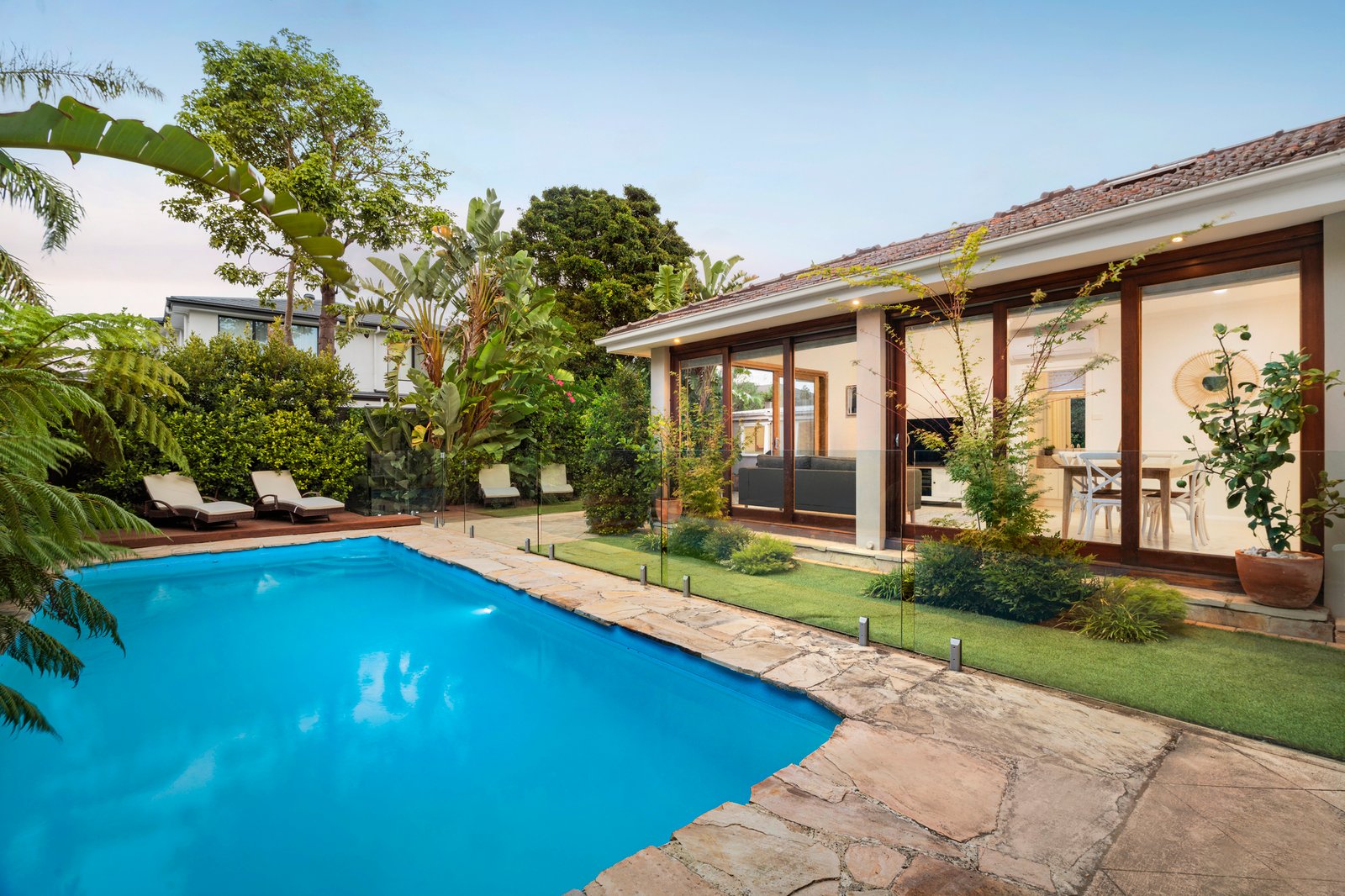 Inside, high ceilings are offset by polished Tasmanian oak floorboards that sweep through the formal rooms including entry hall, dining room and lounge with an electric log fire heater in the original fireplace surrounds. The light-filled dimensions are magnified further in the open plan living/dining and stone/Ilve kitchen with seamless connection to the alfresco area, privately cocooned in lush, verdant borders featuring palms, tree ferns and hibiscus. Surrounded by sandstone, the solar-heated pool has an automated cleaning system, and there is also a converted garage/studio which is currently used as a rumpus and gym, but could be a work-from-home space, or teenager accommodation.