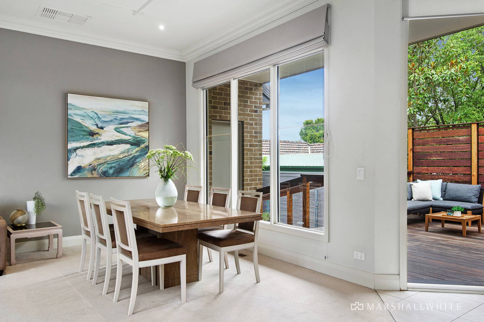 Towering 3.1 metre ceilings and huge garden-framing windows enhance the sense of proportion in a home that flows from the open-plan kitchen/dining/living - with a stunning travertine dining table - through cafe-style windows and huge glass doors to the sanctuary of a private rear deck.