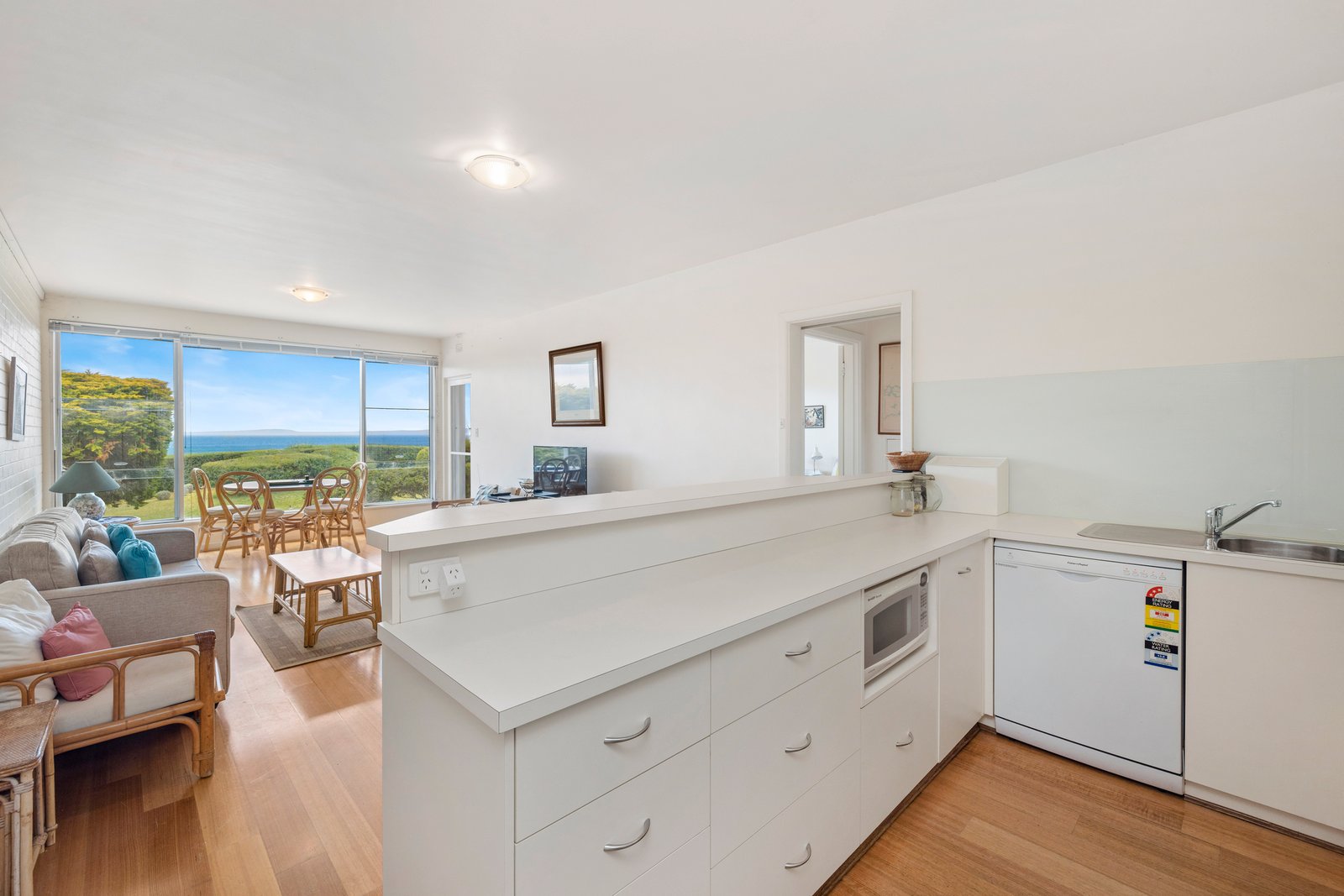 A tidy kitchen is complemented by a stainless-steel Bellissimo oven, electric cooktop and a Fisher & Paykel dishwasher, providing all the essentials for home cooking in between exploring nearby restaurants and boutiques lining Ocean Beach Road, which is just 350m away.