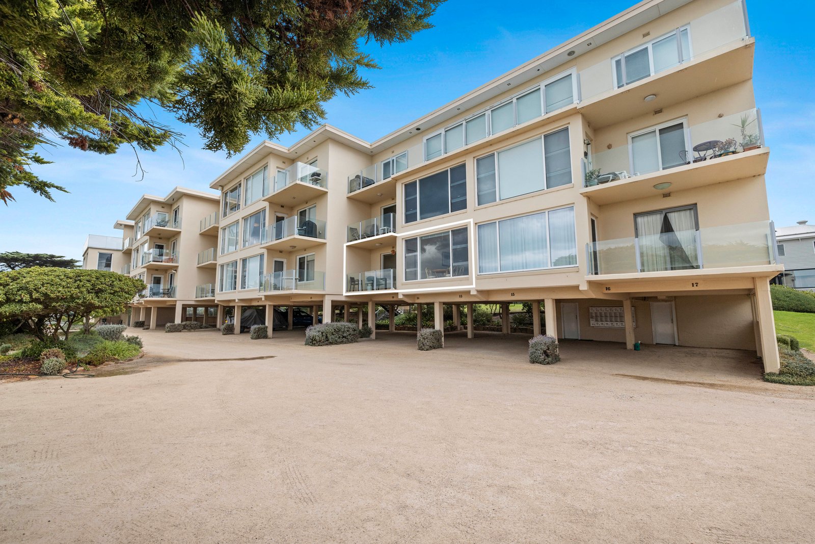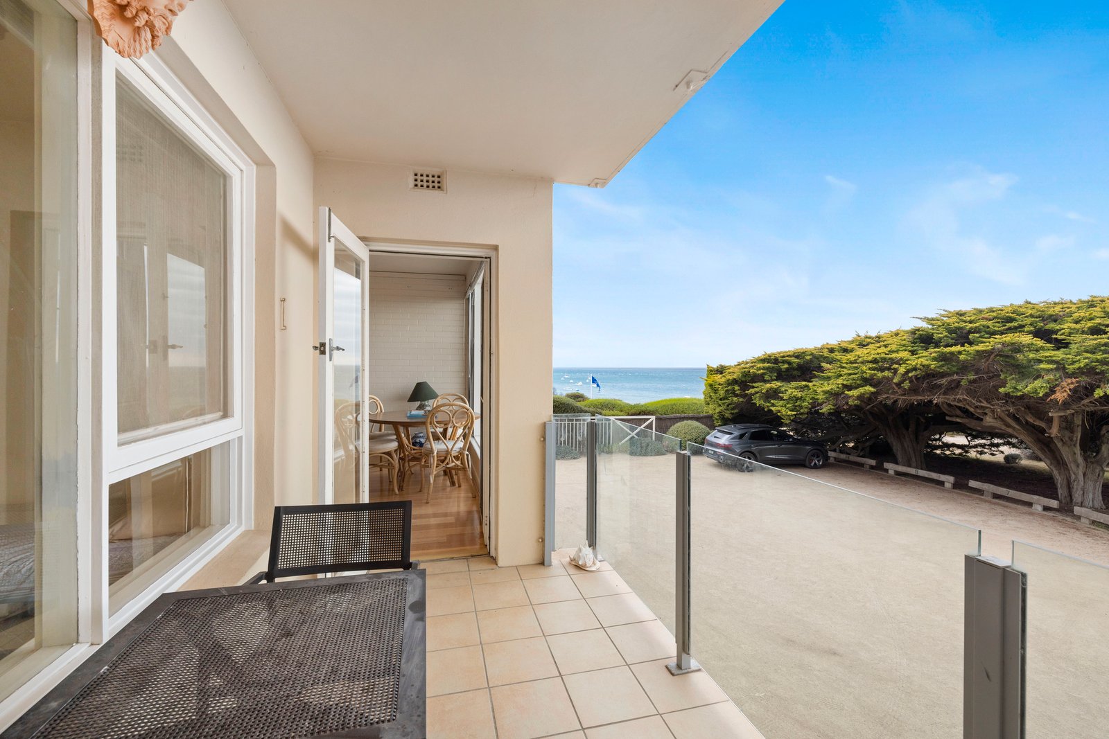 Beyond electronic gates with keypad entry in the exclusive ‘Raffles Court’ complex, the first level unit features north-facing open-concept living and dining with solid timber floors and walls of windows framing Port Phillip Bay and the coastline to the Dandenong Ranges. Opening out to a private terrace, the setting invites a cosy morning cup of coffee as the yachts bob on the bay below and the Queenscliff ferry glides by.
