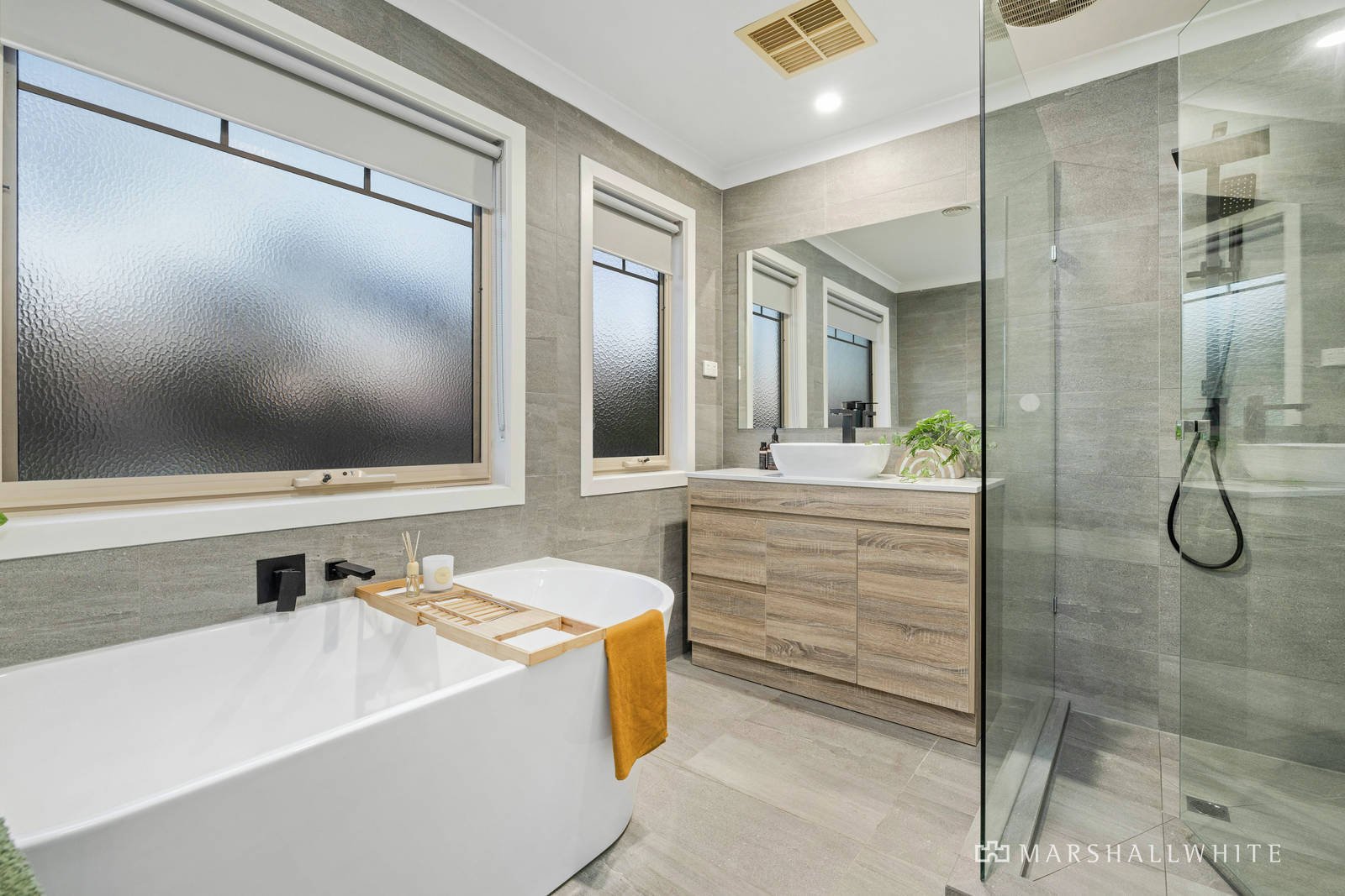 Upstairs, the sleeping quarters offer three bedrooms with fresh carpet in charcoal tones. Two are robed while the master features a walk-in-robe with dual access to the superbly updated bathroom. Here a deep soaker bath sits under the window, floor-to-ceiling tiles continue the cool colour palate, contrasting with the warm feature timber vanity and there is a separate shower.