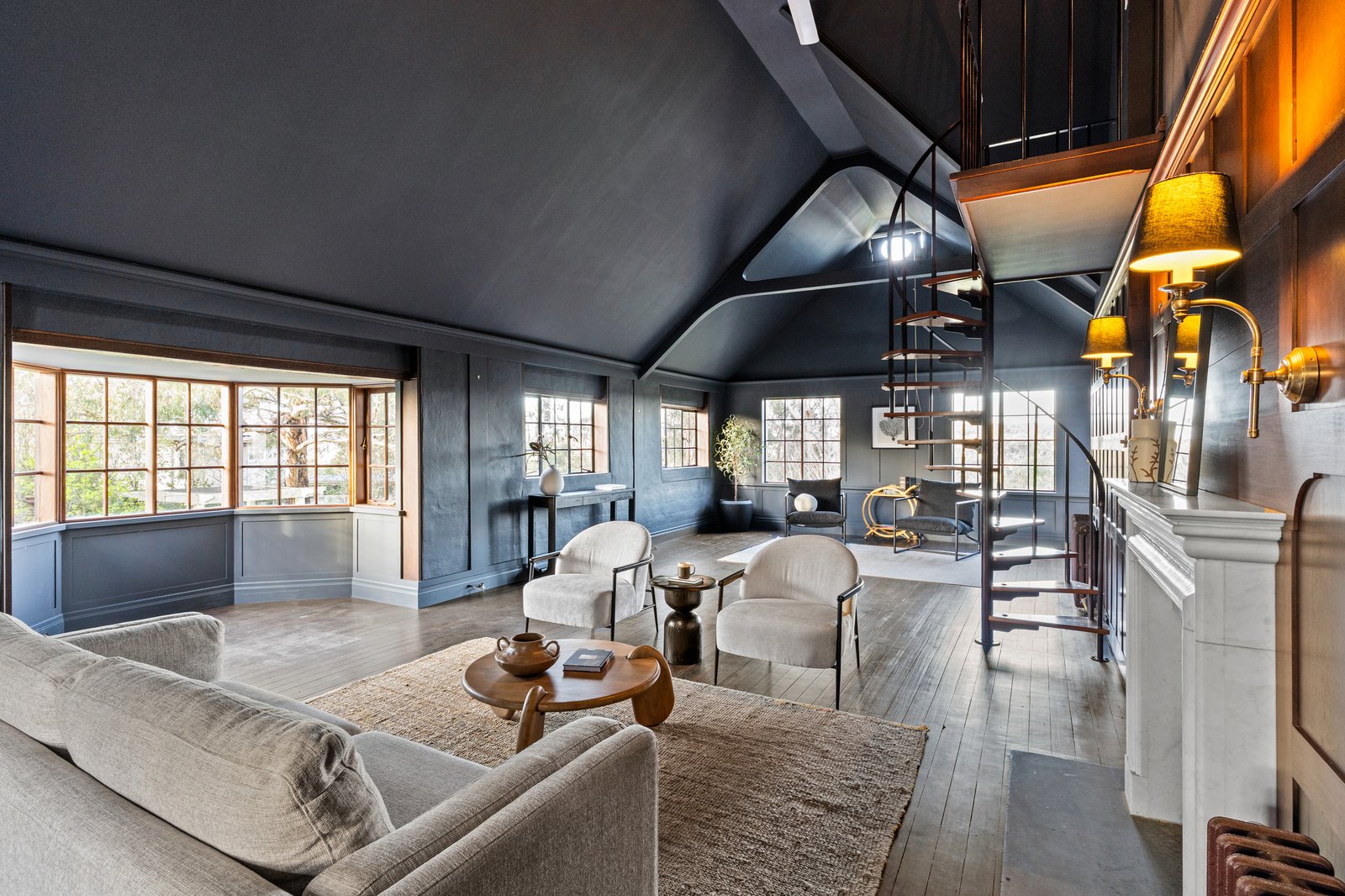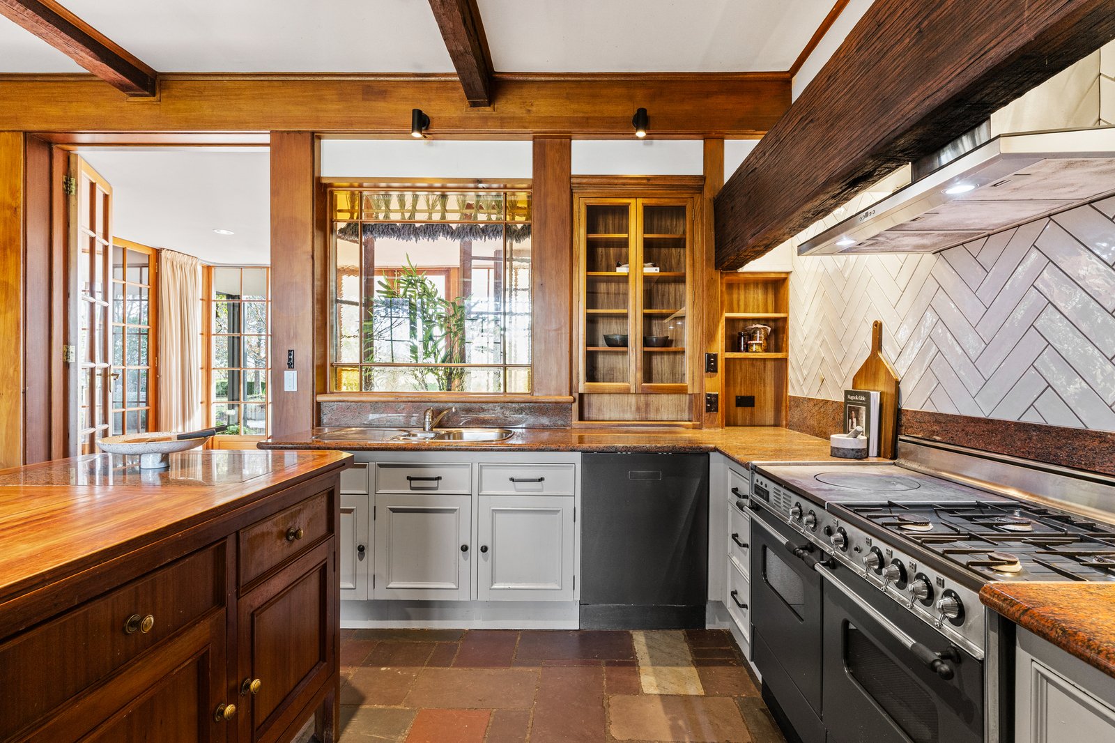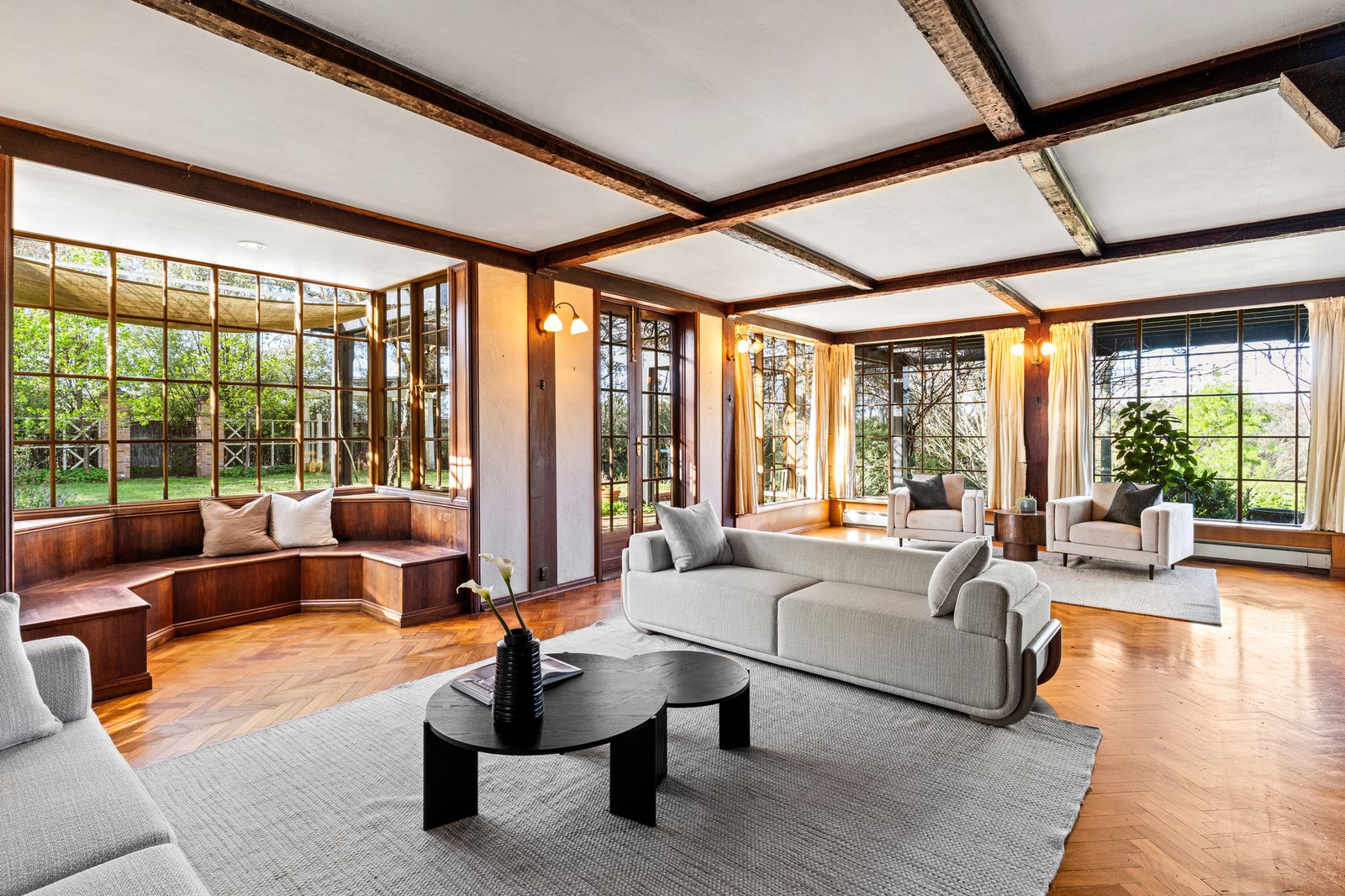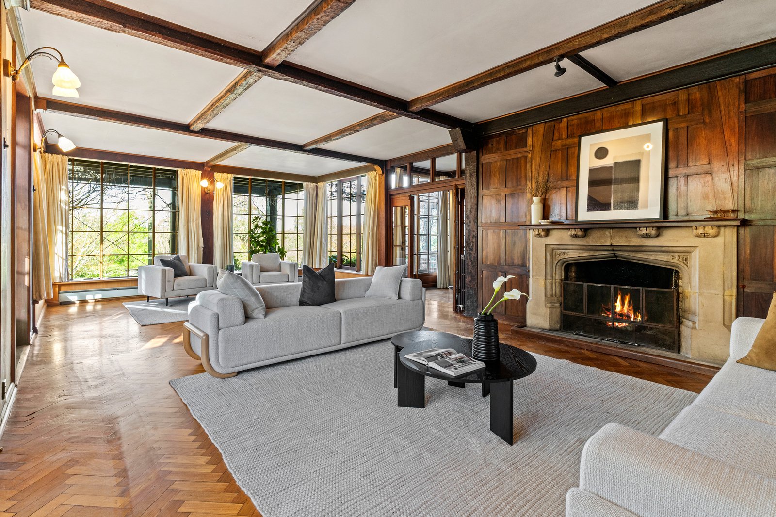 A remarkable fusion of classical elegance and serene country-style living, the three-storey residence is crowned by a slate roof and showcases parquetry and polished timber floors beneath soaring beamed ceilings, beautifully offset by rich blackwood wall panelling.