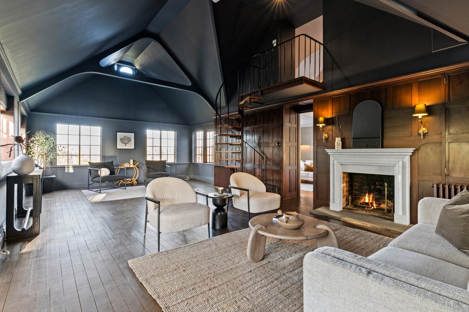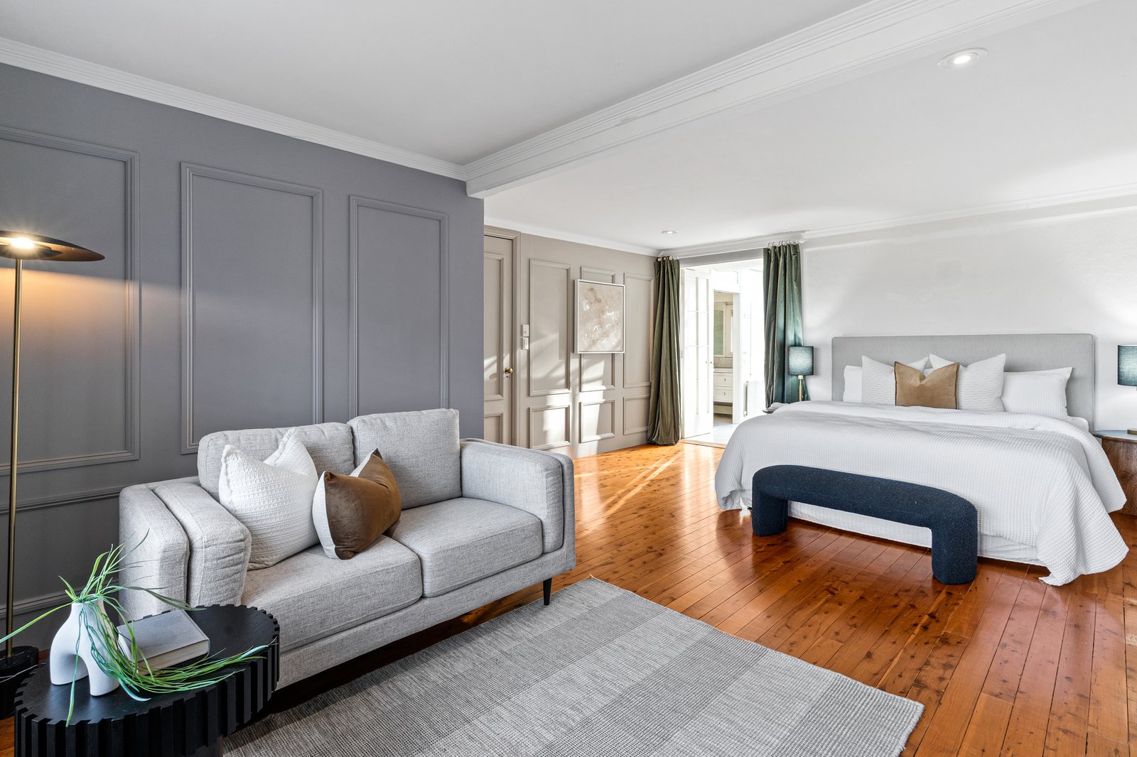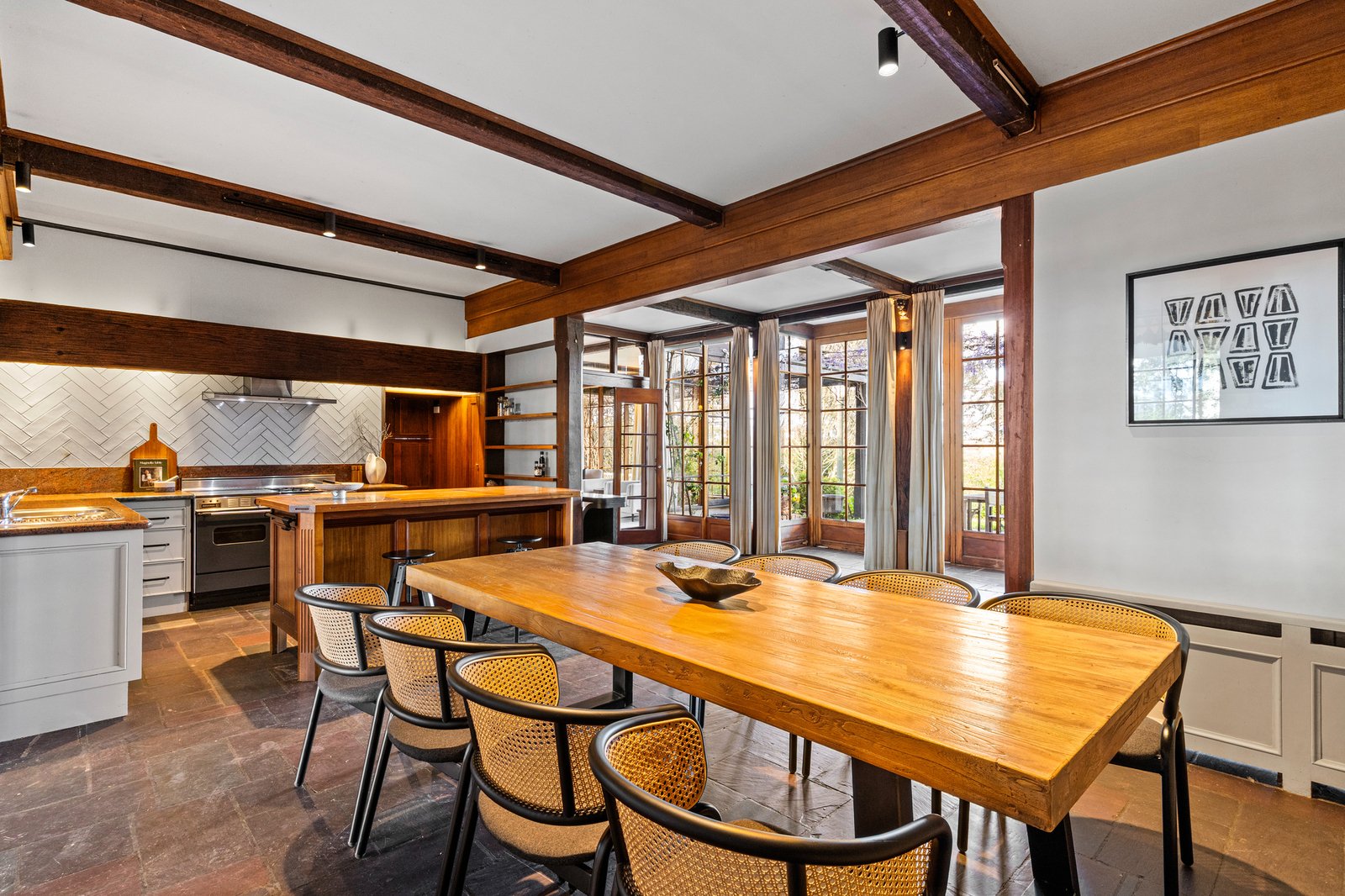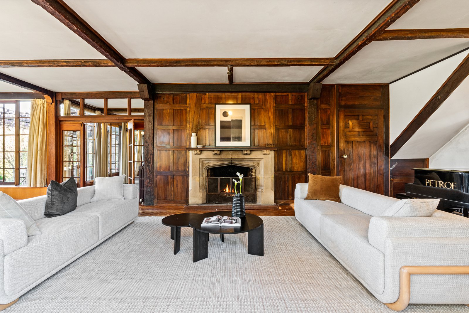 A remarkable fusion of classical elegance and serene country-style living, the three-storey residence is crowned by a slate roof and showcases parquetry and polished timber floors beneath soaring beamed ceilings, beautifully offset by rich blackwood wall panelling.