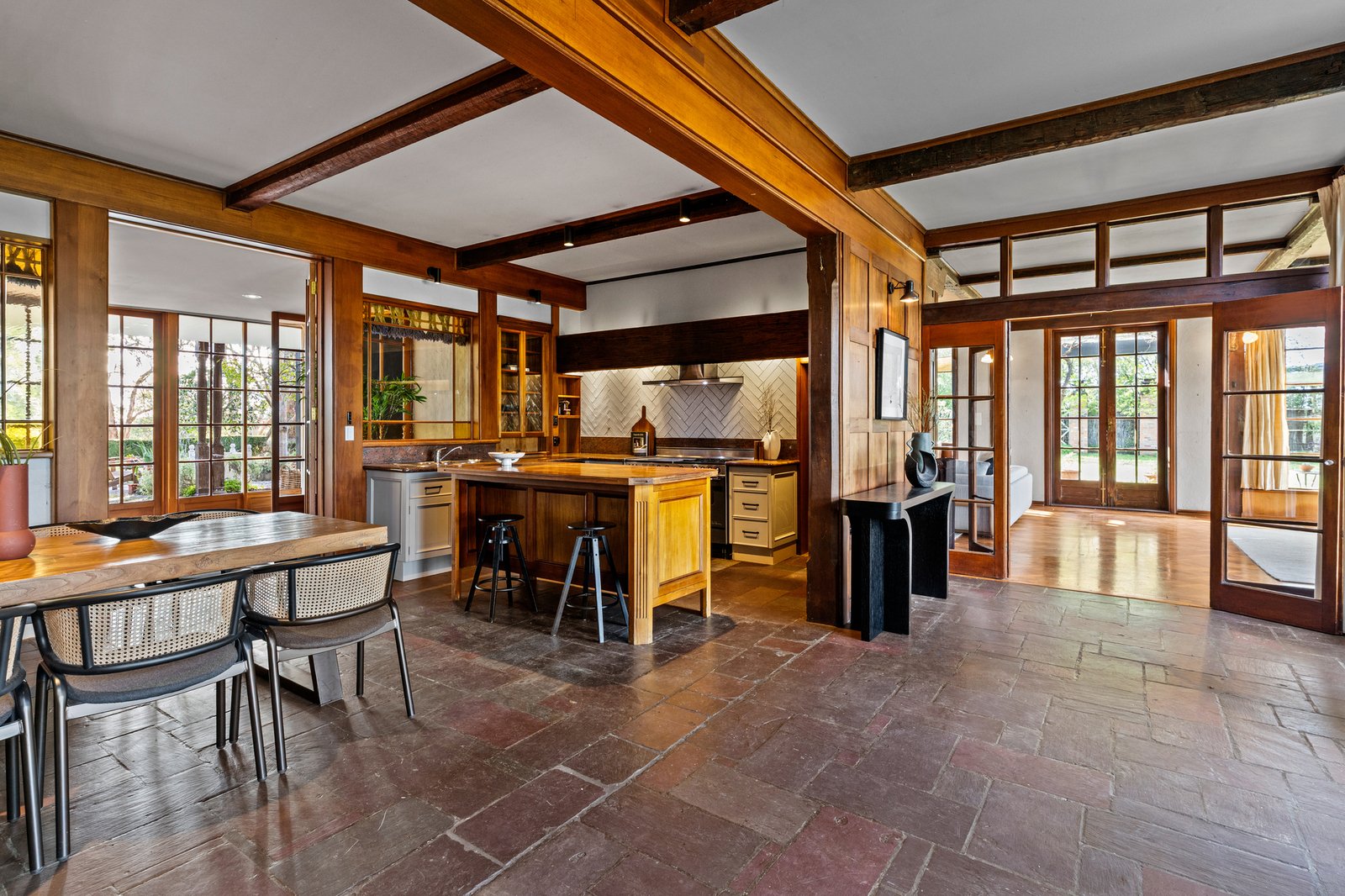 Rich in history and character, reclaimed timber from a grand late-1800s Toorak mansion features in the exquisite parquetry flooring and statement stone fireplace, imbuing the home with timeless craftsmanship and provenance.