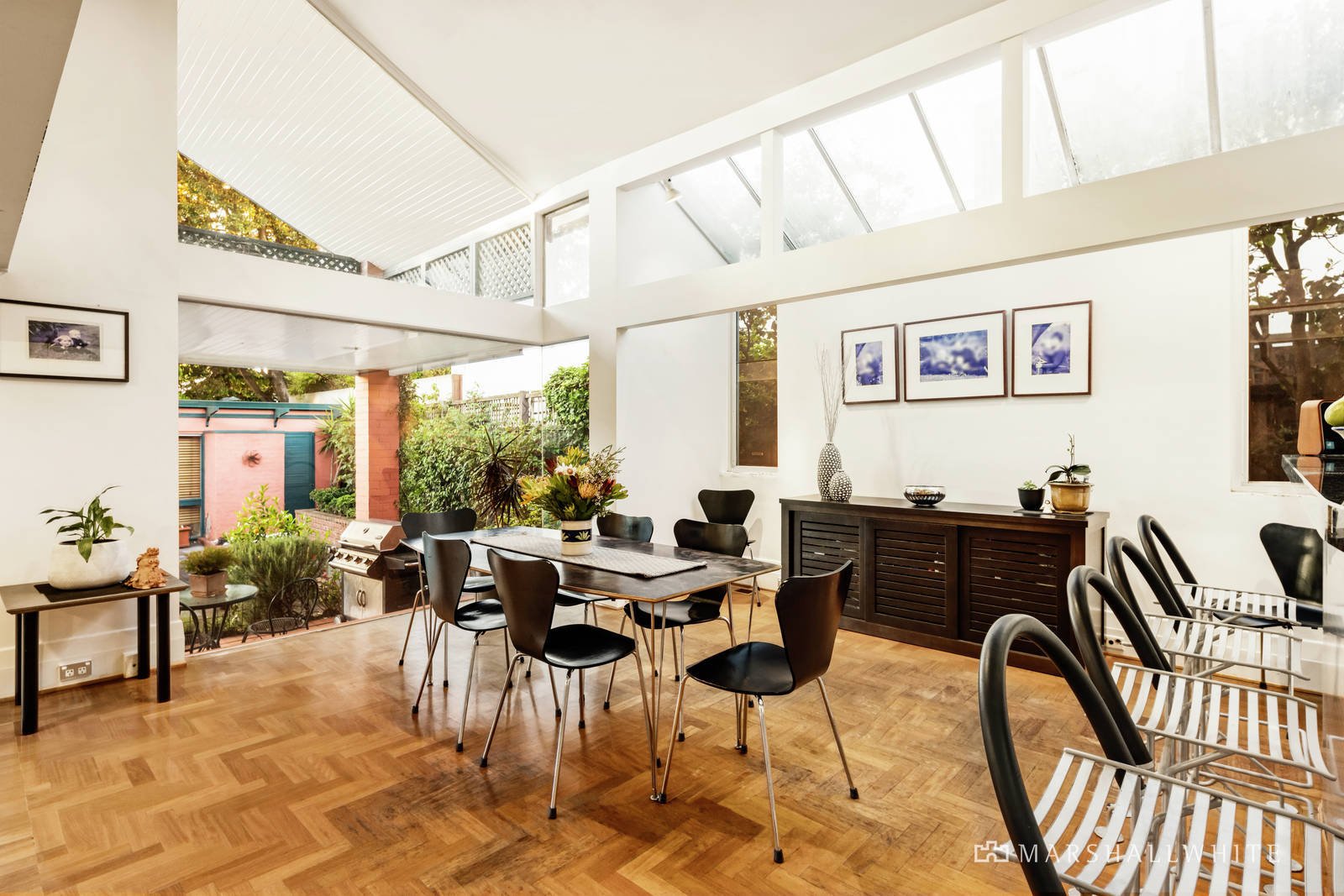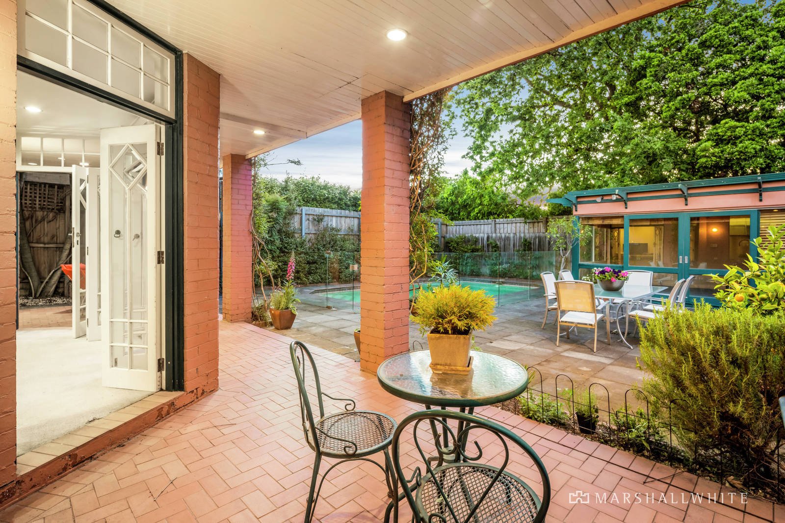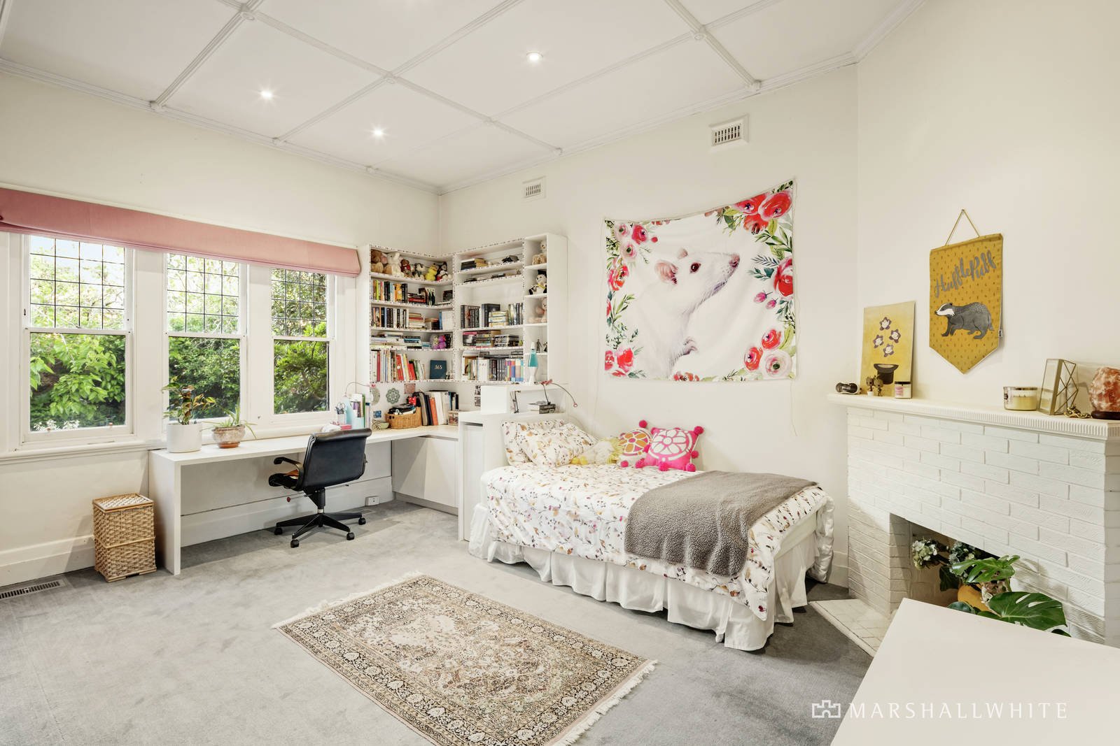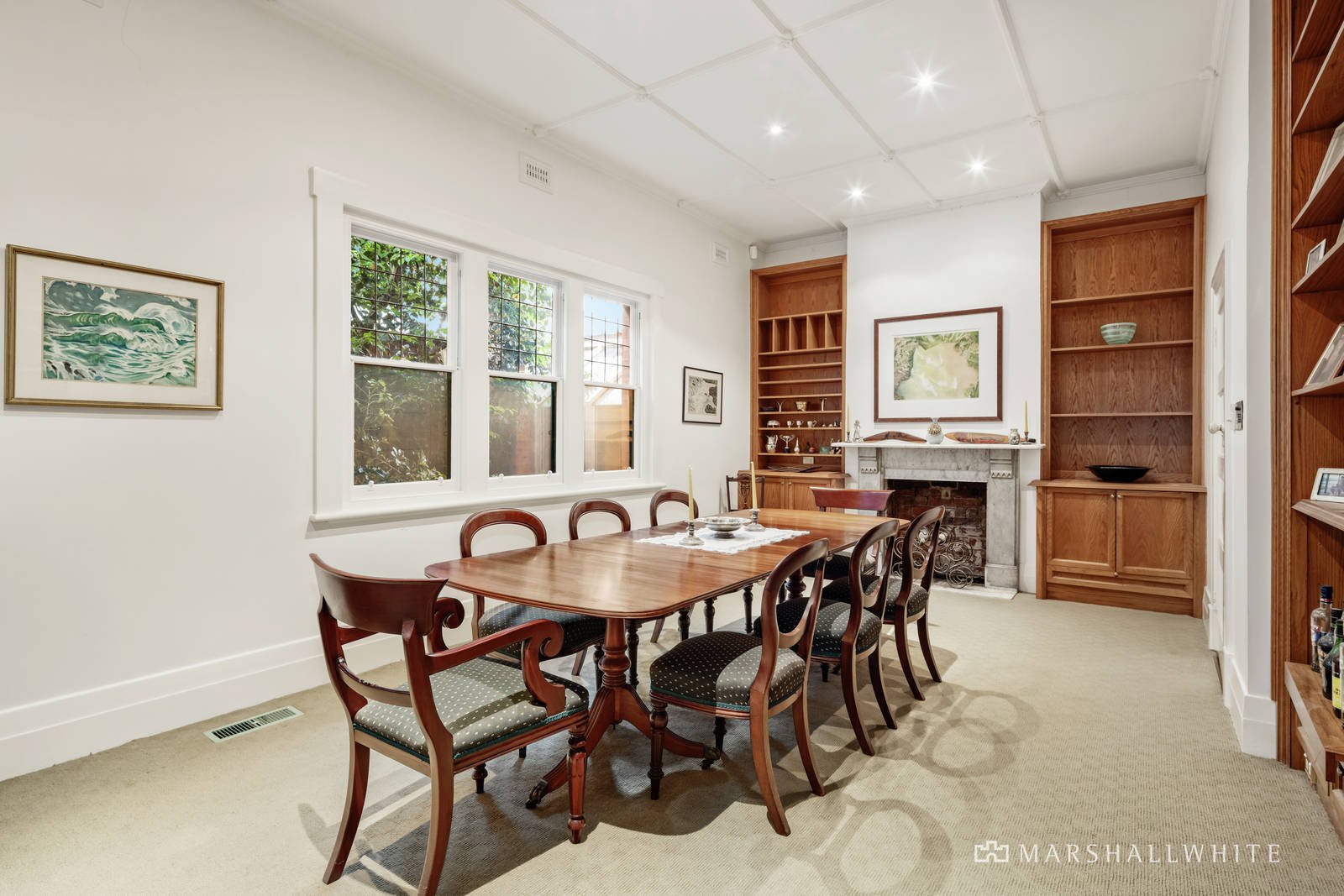 The central hall featuring high ceilings and timber floors flows through to the main bedroom with travertine en suite and built in robe, a second bedroom with fireplace and robe, a third bedroom with robes and a fully tiled family bathroom. An elegant formal dining room with marble fireplace is served by a granite kitchen. Parquetry timber floors flow through the sun-drenched living and dining areas with an open fire while timber stairs lead up to a spacious mezzanine home office. French doors open out to a large covered terrace, private northwest garden, solar heated pool and versatile freestanding rumpus/studio or apartment with kitchenette and bathroom.