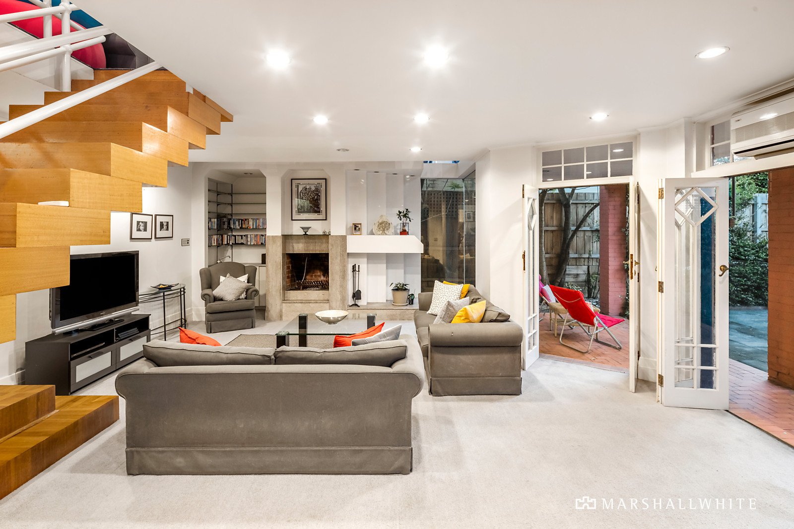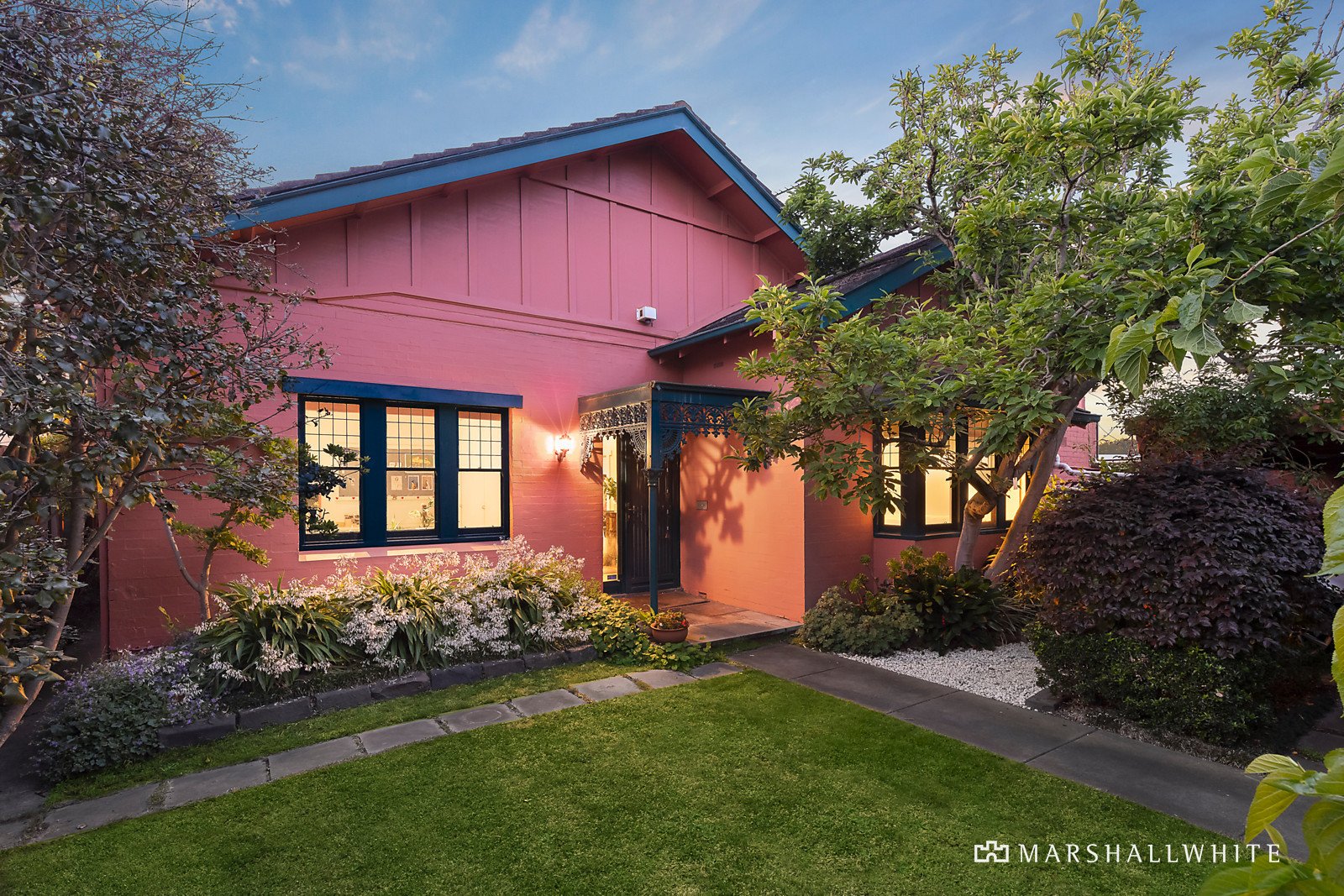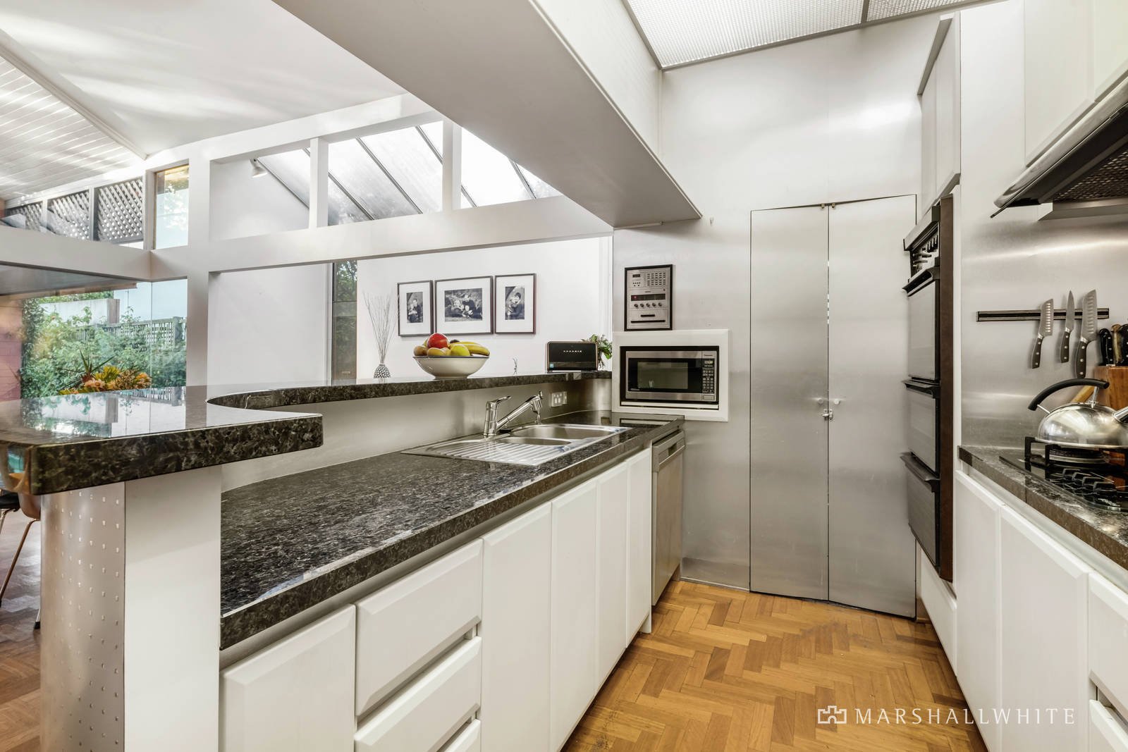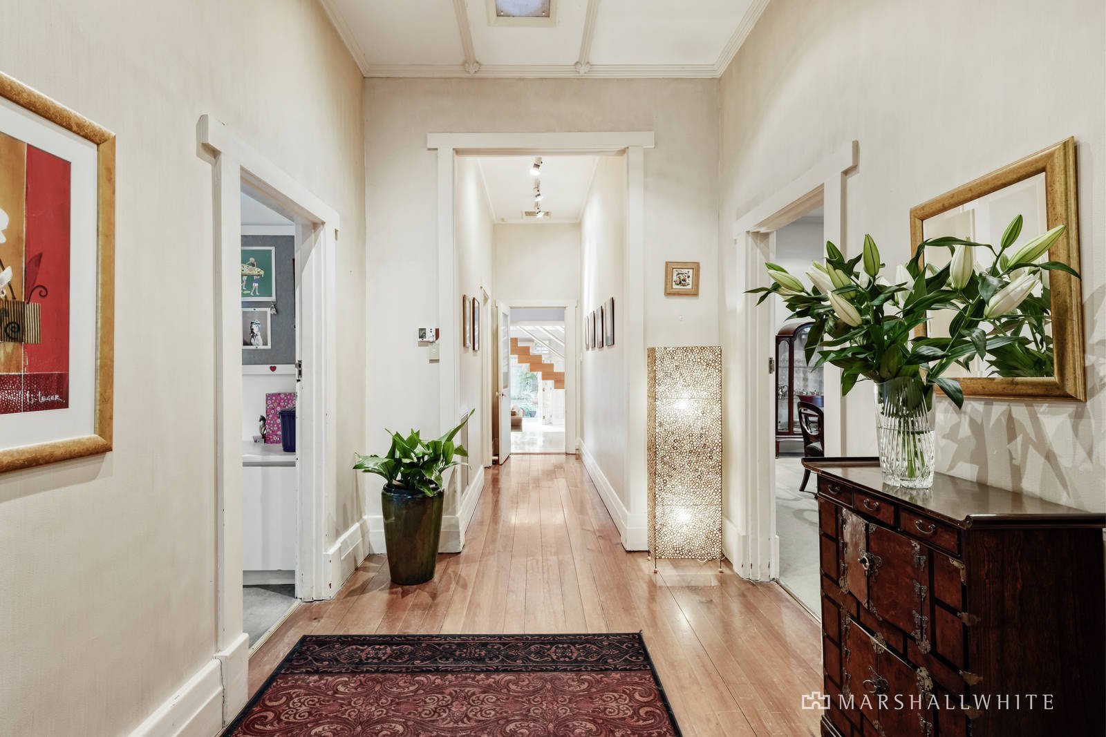 The central hall featuring high ceilings and timber floors flows through to the main bedroom with travertine en suite and built in robe, a second bedroom with fireplace and robe, a third bedroom with robes and a fully tiled family bathroom. An elegant formal dining room with marble fireplace is served by a granite kitchen. Parquetry timber floors flow through the sun-drenched living and dining areas with an open fire while timber stairs lead up to a spacious mezzanine home office. French doors open out to a large covered terrace, private northwest garden, solar heated pool and versatile freestanding rumpus/studio or apartment with kitchenette and bathroom.