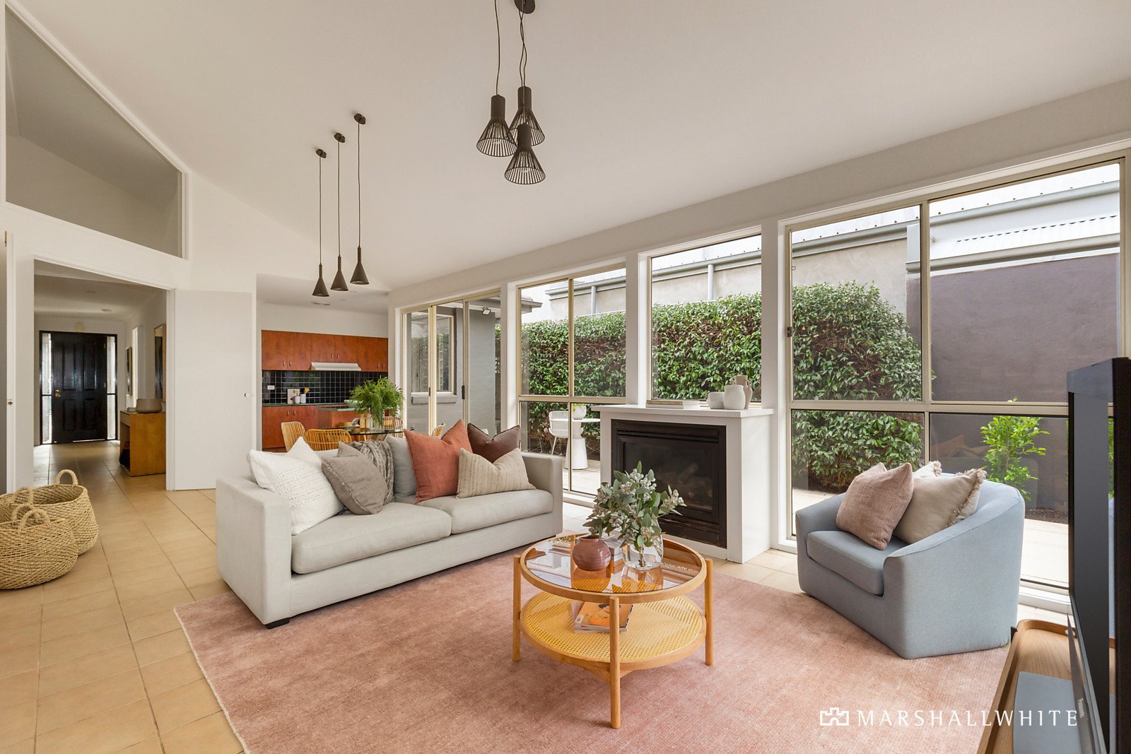 Soaring raked ceilings accentuate the sense of space while designer pendant lights add cotemporary refinement to the formal sitting/dining room and generous family room. It's a wonderful and expansive free-flowing space for entertaining with double doors for separation when required. Served by a well-appointed kitchen and warmed by a gas log fire, the family room opens out to a private paved north-facing garden. Bathed in natural light, the main bedroom with a walk-in robe and en suite with separate powder-room opens to an entirely private west-facing courtyard garden. Two additional bedrooms with built in robes and a central bathroom are in their own wing while a home office is also an ideal 4th bedroom.