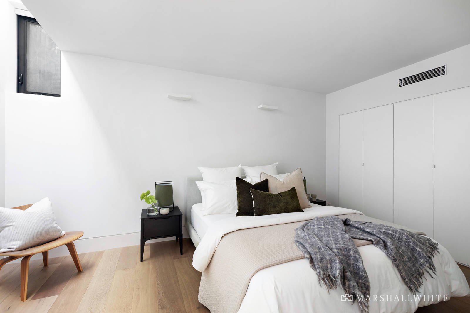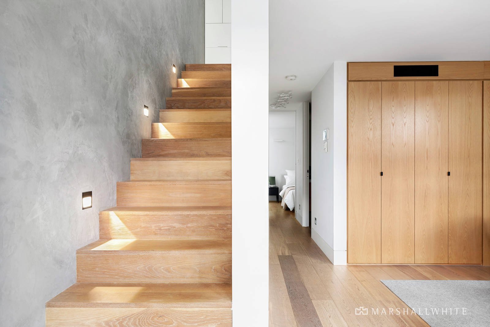 Created around form and function, soaring ceilings and oak floors introduce a spacious bedroom with built-in robes and fireplace followed by a second robe bedroom with leafy outlook. A cavity sliding door reveals the dining area with elegant open fireplace, stylish marble vanity bathroom and deluxe Miele-appointed kitchen with marble benches, integrated fridge/freezer and 2PAC cabinetry. Ahead, the sleek main lounge, where full-height glass slides open to a private, covered Bluestone dining and entertaining terrace with spectacular treetop and sunset views. A lockable cavity door leads downstairs to the study and second lounge area comprising floor-to-ceiling windows, inbuilt cupboard storage and dedicated desk zone, and a second bathroom adjacent to the fabulous main bedroom/parents'/teen retreat with lightwell feature.