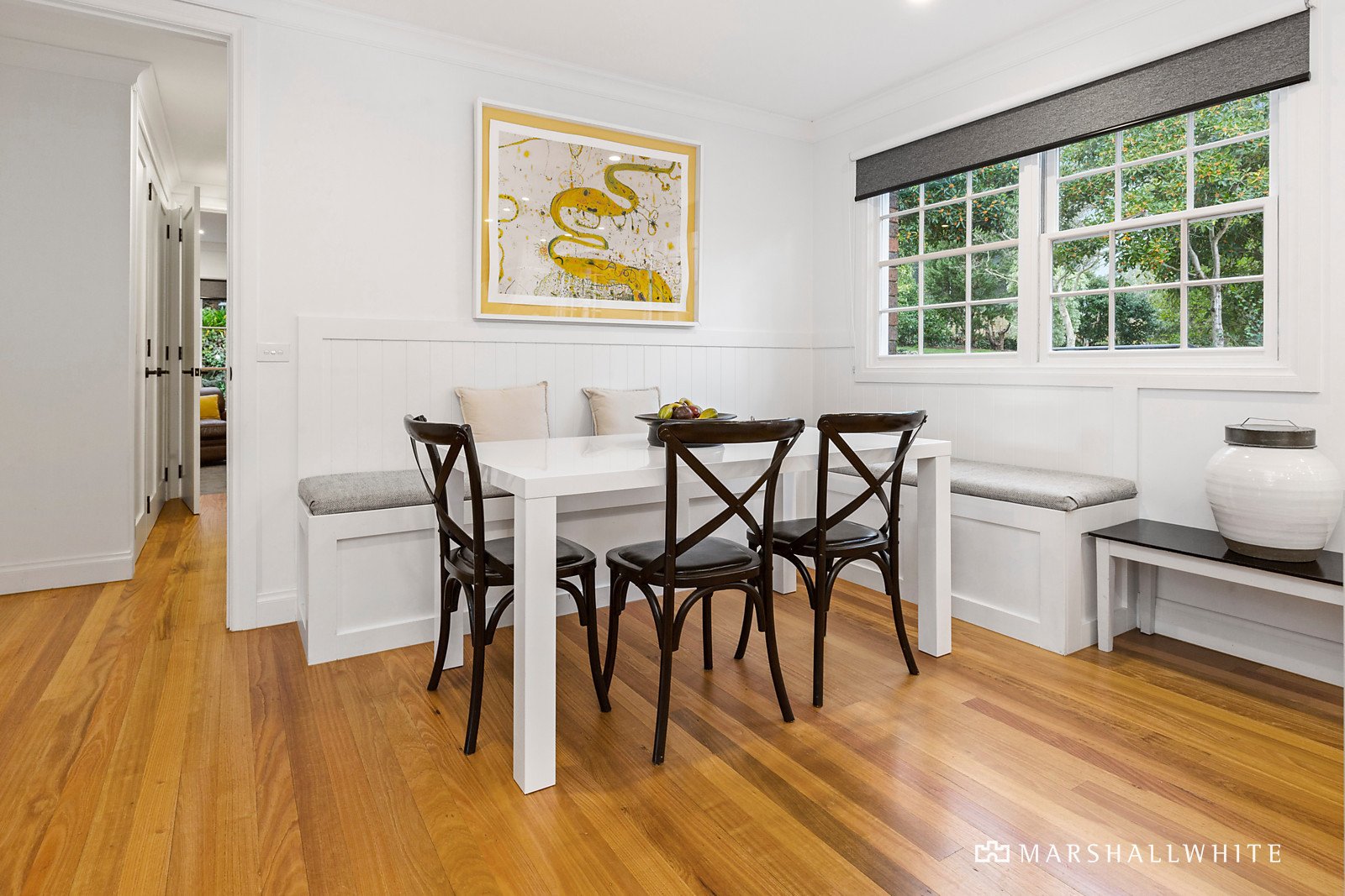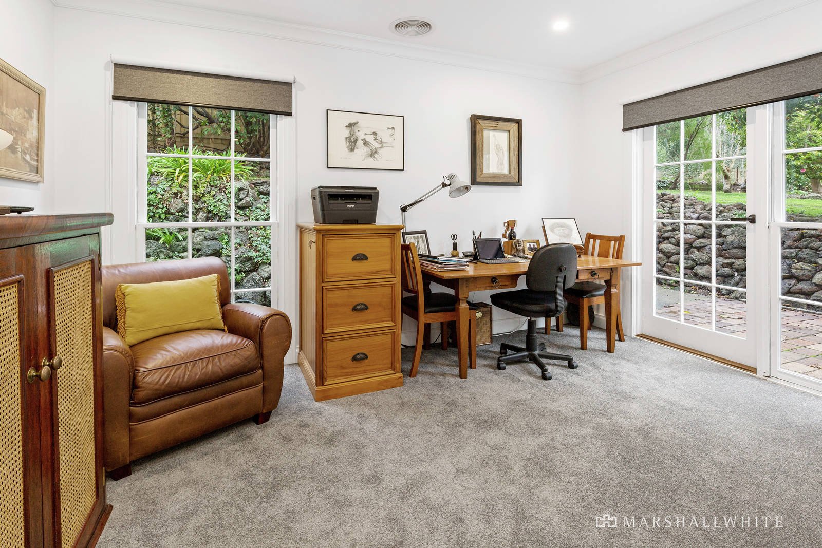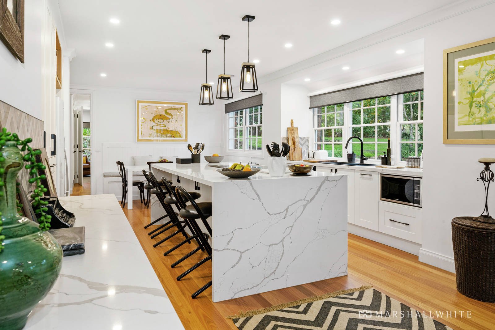Positioned well back on the large block behind automated gates, a newly laid driveway leads to the classic solid-brick single-level home with an impressive entryway featuring a bluestone vestibule and custom timber double entry doors. With a flexible layout that can readily adapt for grand-scale entertaining or relaxed family living, the home's light-filled dimensions are enhanced by polished Tasmanian Oak floorboards, multi-paned windows, French doors, and high ceilings. An open fireplace adds ambience to the light-filled main living room with lovely garden outlooks. The outstanding kitchen is resplendent in engineered quartz benchtops and top-of-range appliances including a Smeg induction cooktop and pyrolytic oven, while a corner banquette is perfect for casual dining with garden and pool views.