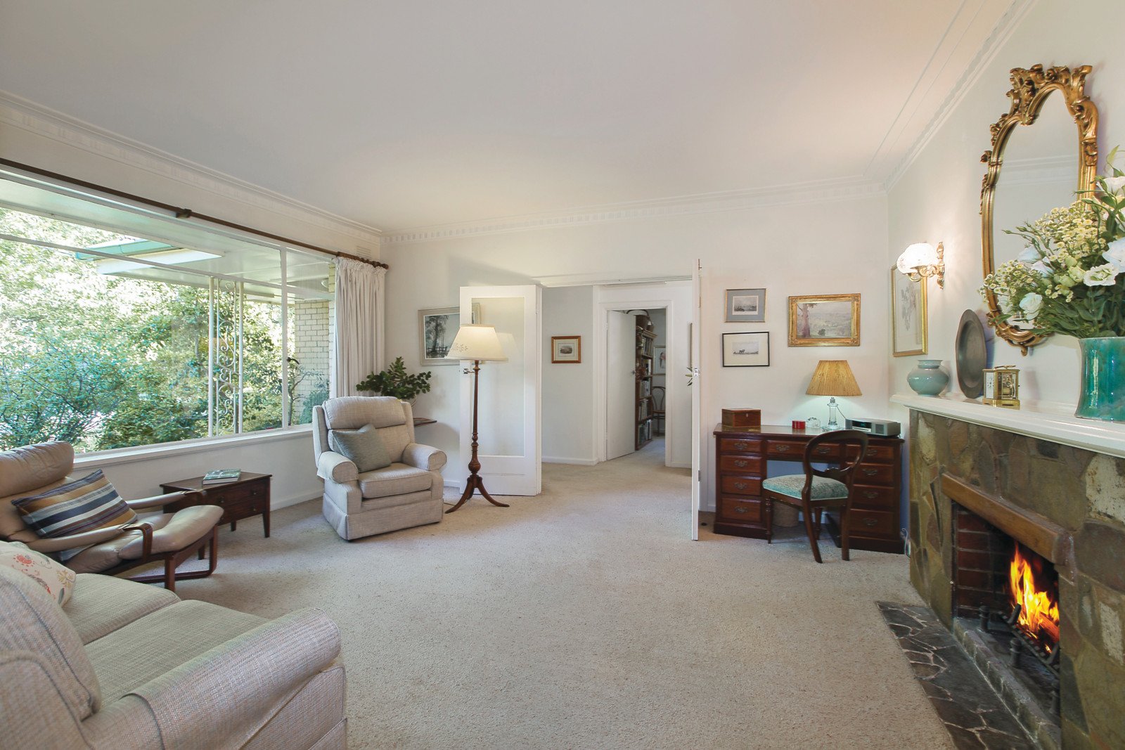 An abundance of natural light creates an inviting ambiance in the generous living room with a stone fireplace, separate dining room and den or 2nd living room. Three spacious bedrooms all with built in robes are accompanied by a pristine bathroom. The well appointed kitchen and sun room open to the beautiful deep private leafy garden.