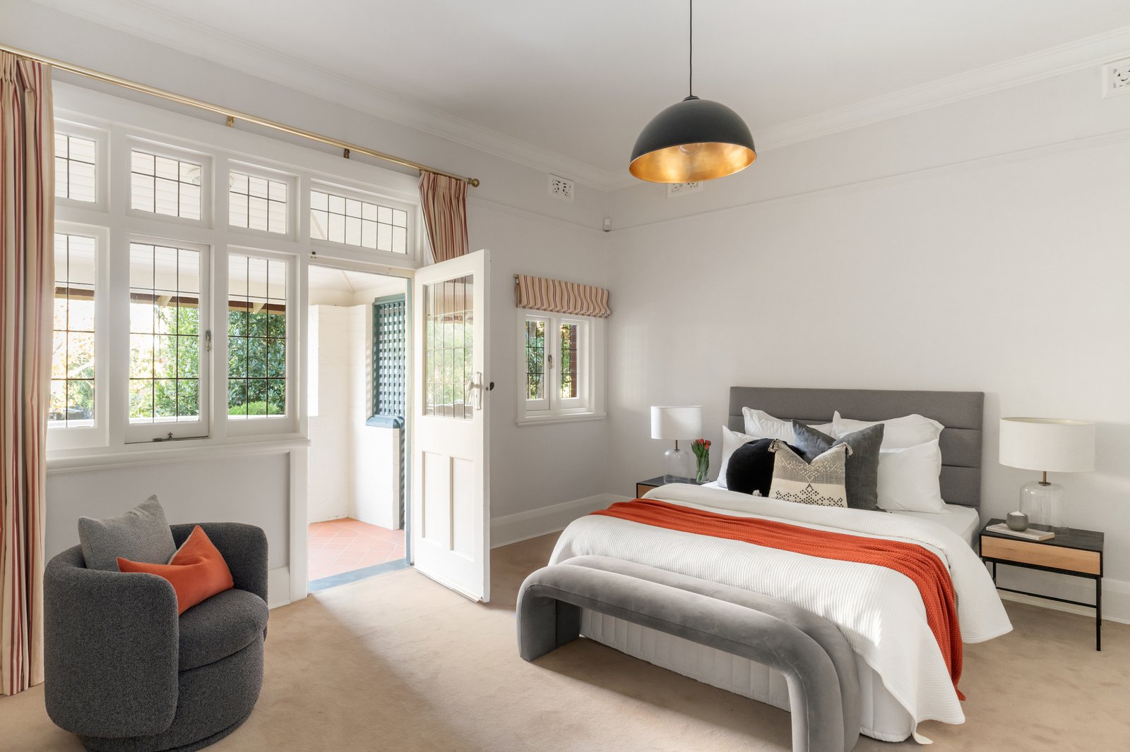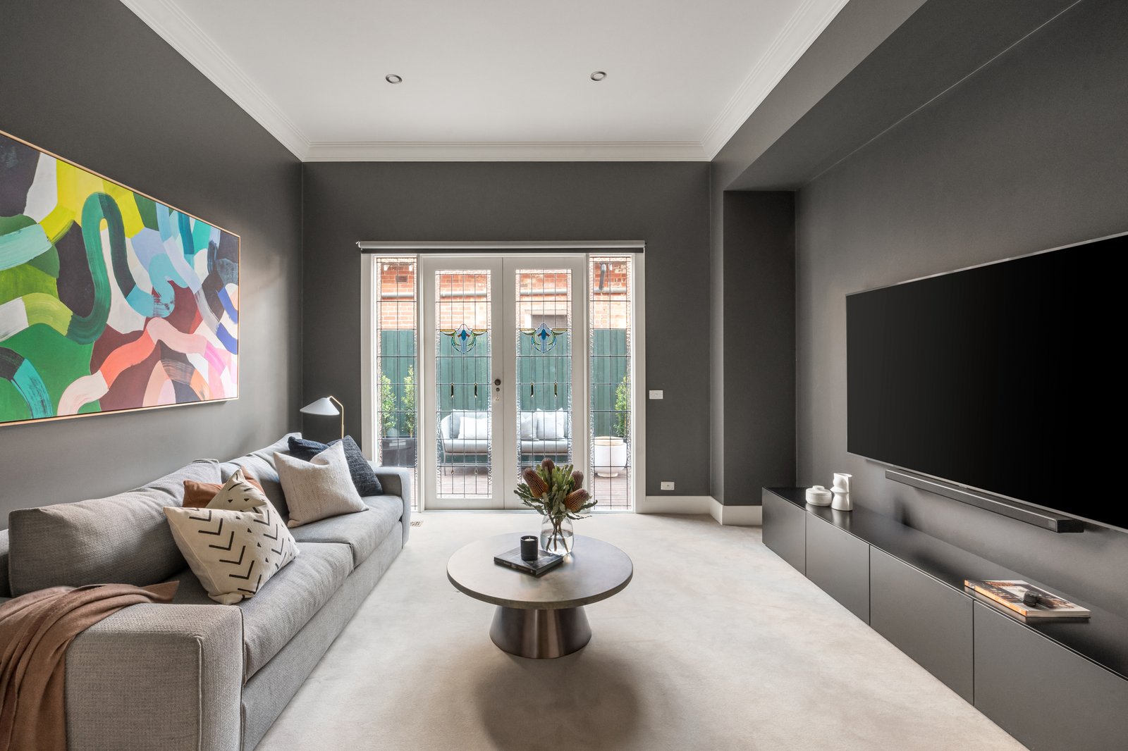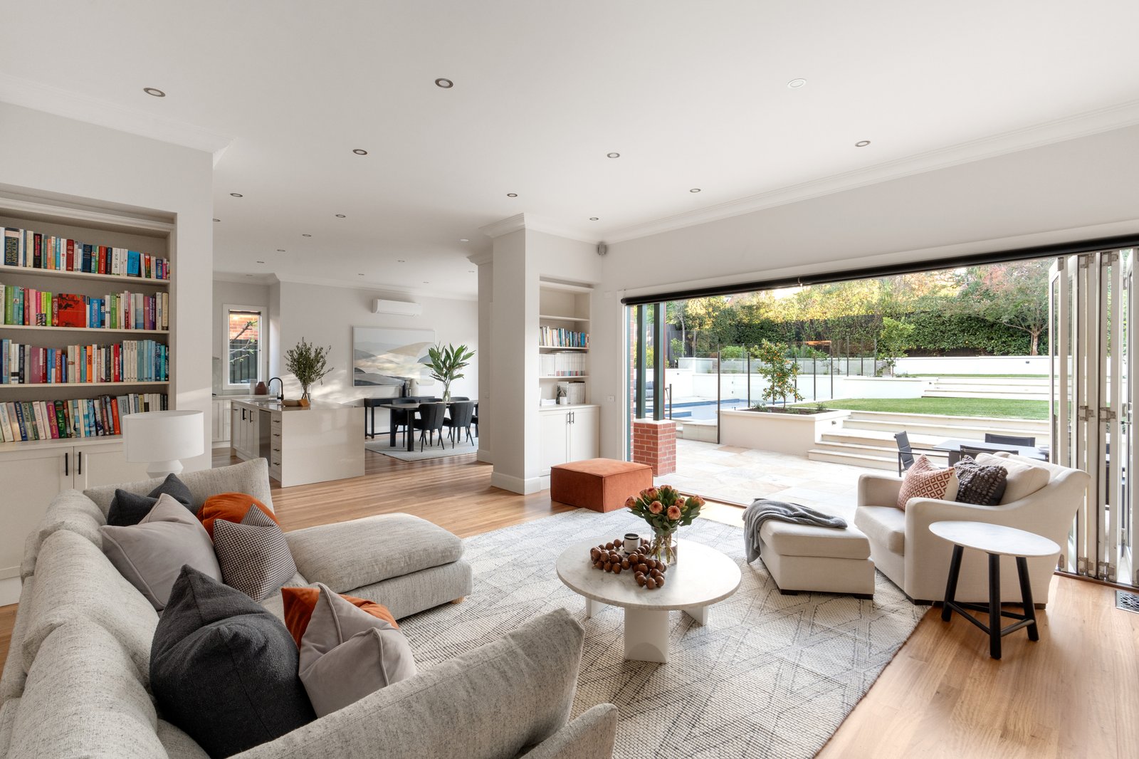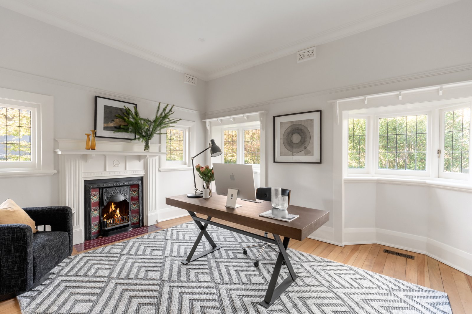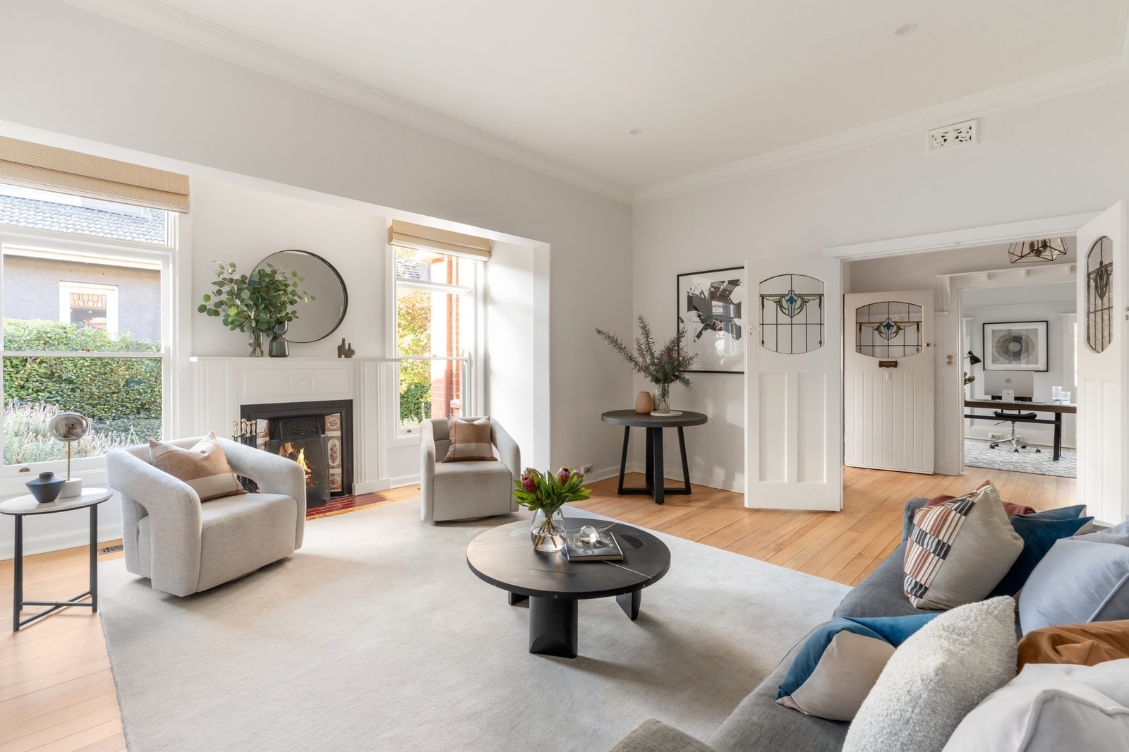 Beautiful original Kauri floors and ornate high ceilings distinguish the wide reception hall, refined executive study/library with fireplace, a gracious sitting room with open fire and elegant formal dining. An atmospheric home theatre room opens through stunning leadlight French doors to a side deck. Spectacular in scale, the sun-drenched living and dining areas surround a gourmet kitchen appointed with stone benches, Miele/Asko appliances and a butler’s pantry. Two sets of bi-fold doors seamlessly extend the living and entertaining options out to a large sandstone terrace and the deep private northwest garden with BBQ deck beneath a remote sun-awning, solar-heated pool, Astro turf sports court and a fabulous vegetable garden. A downstairs bedroom with fireplace, built in robe, verandah access and an adjacent bathroom is ideal for guests. Both front and rear stairs lead up to an abundance of light-filled family accommodation comprising a gorgeous main bedroom with walk in robe and lavish en suite, a second king bedroom with walk in robe and en suite, two additional bedrooms with walk in robes, a spacious retreat with study nook, north-facing balcony and a 4th stylish bathroom.