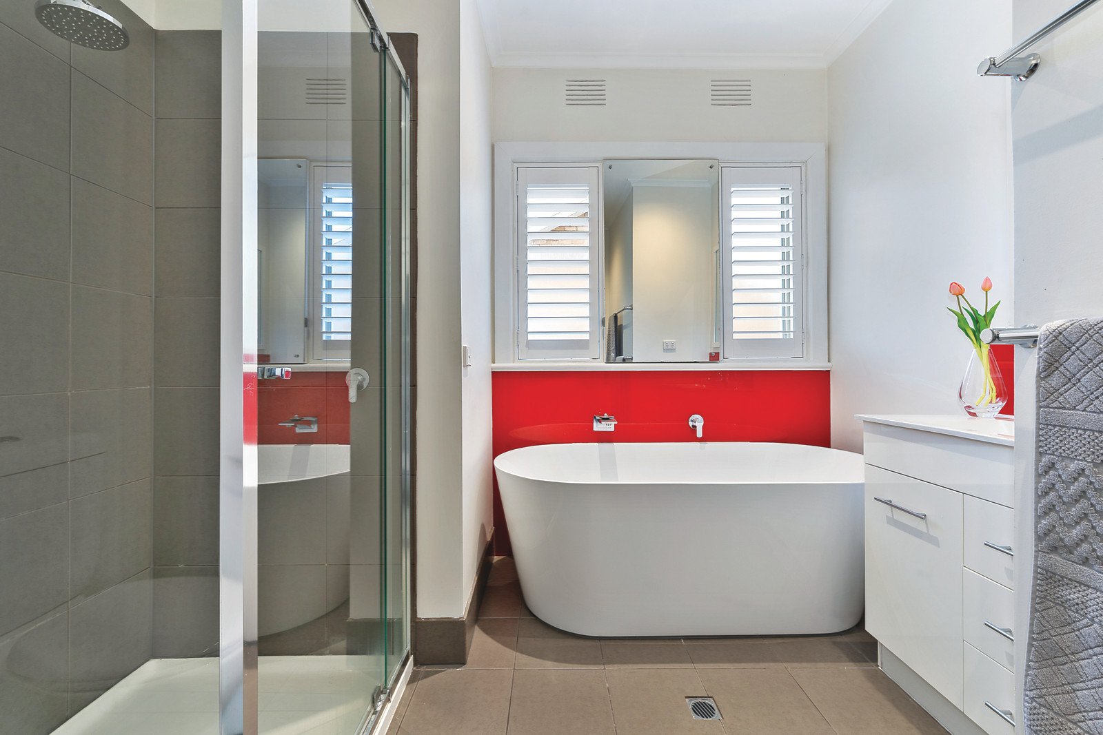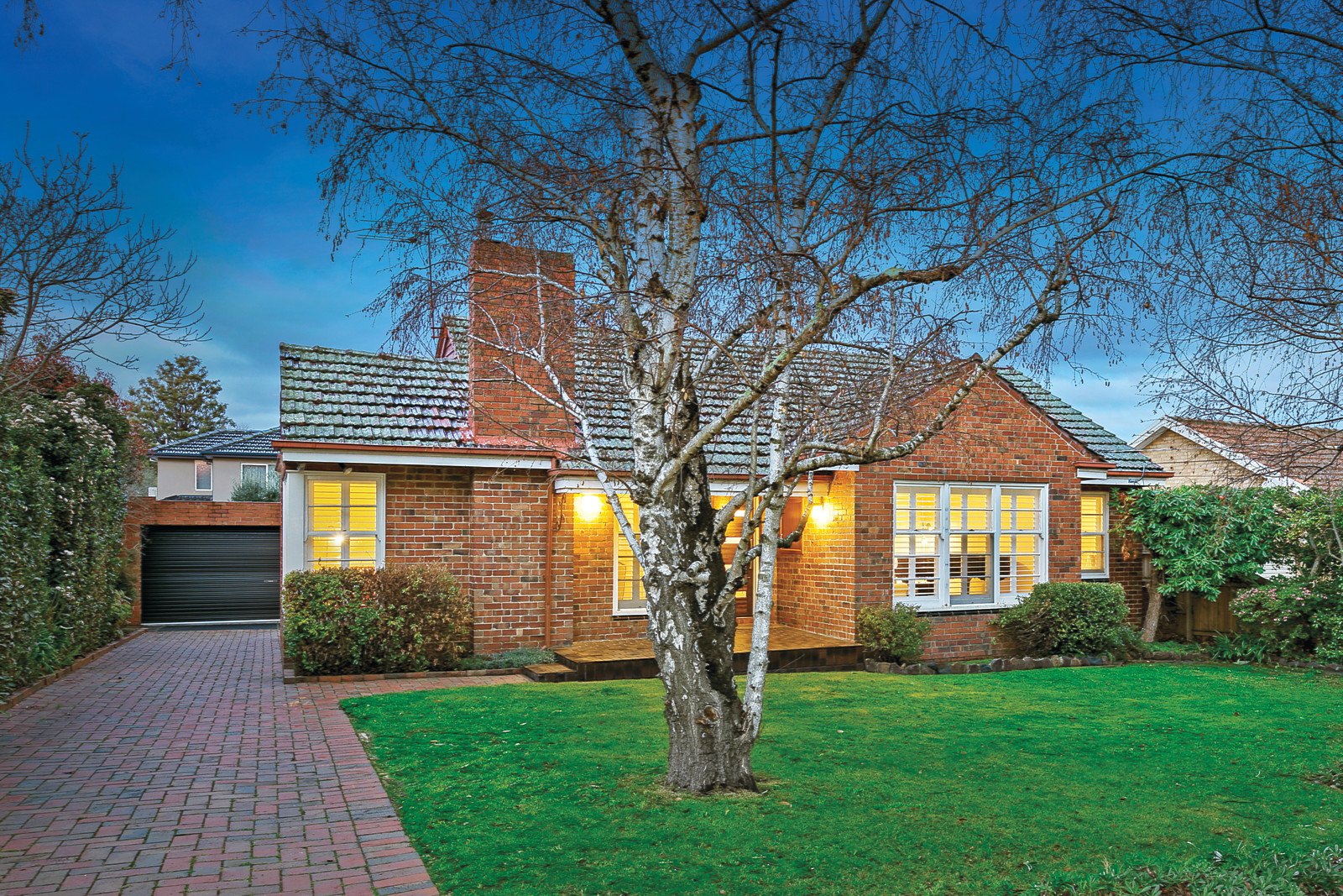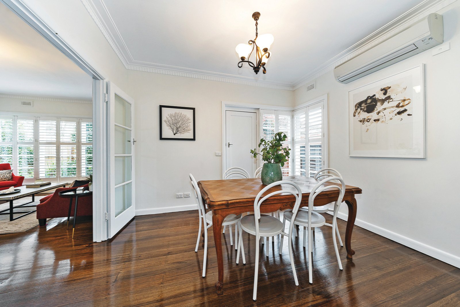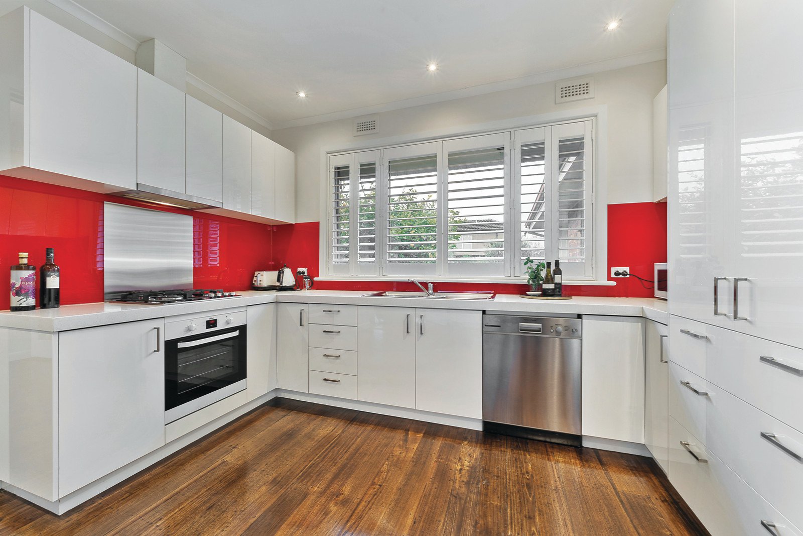 Dark timber floors and plantation shutters add an inviting contemporary edge to the wide entrance hall, generous living room and separate dining room. The large gourmet kitchen boasting striking red glass splash-backs, stone benches and a casual dining area overlooks the deep private northeast garden. The spacious main bedroom with a chic en-suite and built in robe is accompanied by three additional bedrooms (or two plus study) with built in robes and stylish bathroom with freestanding bath.