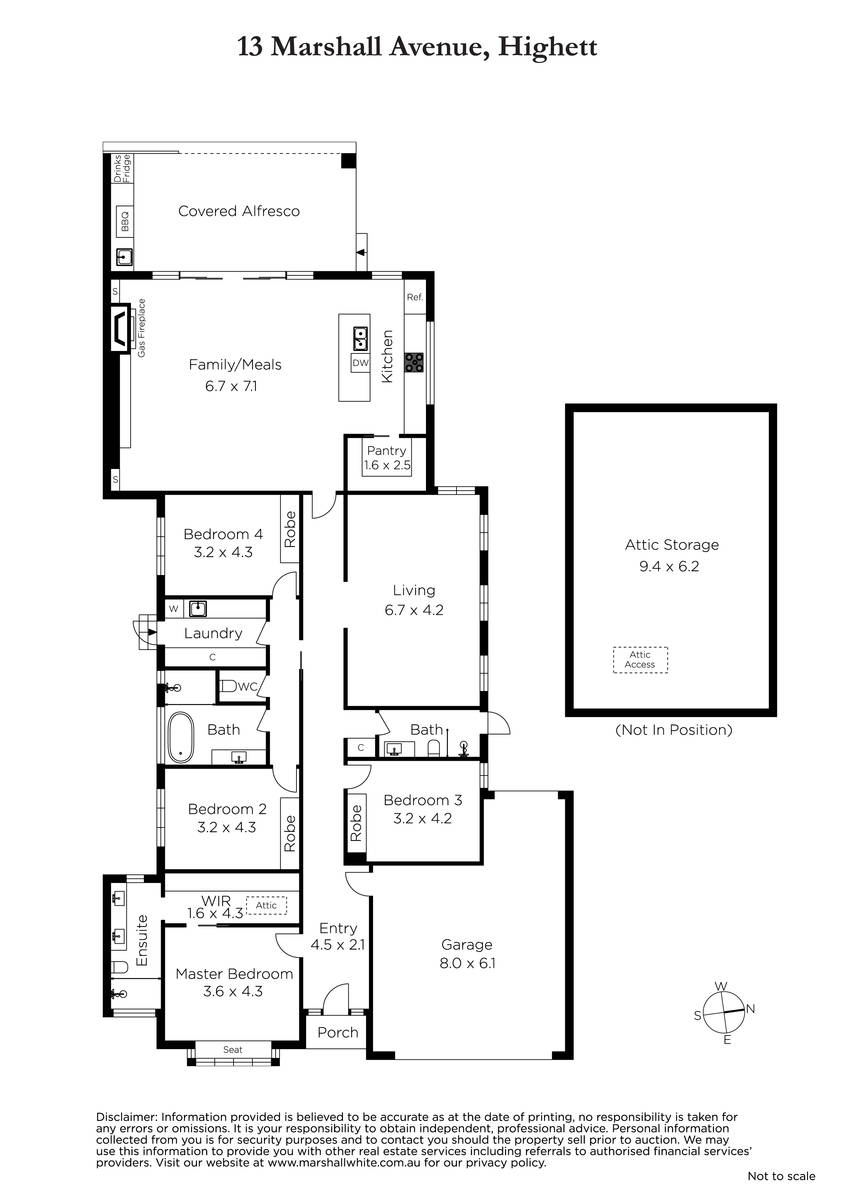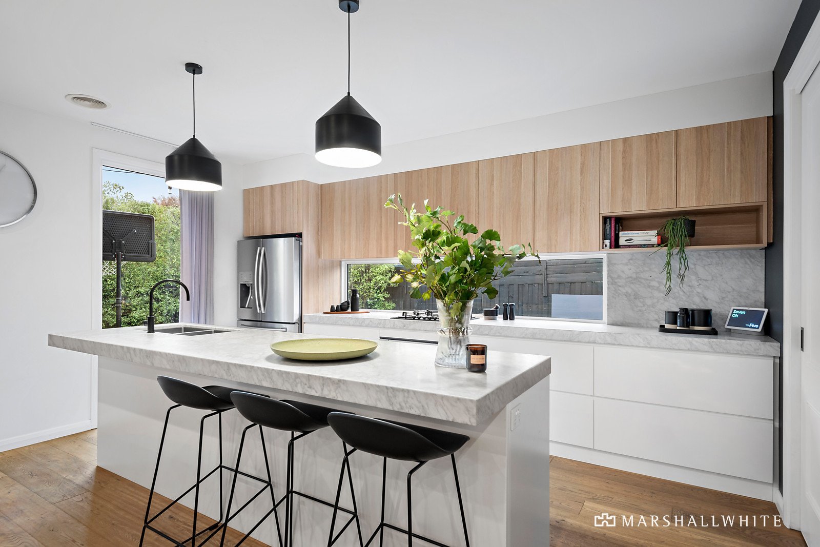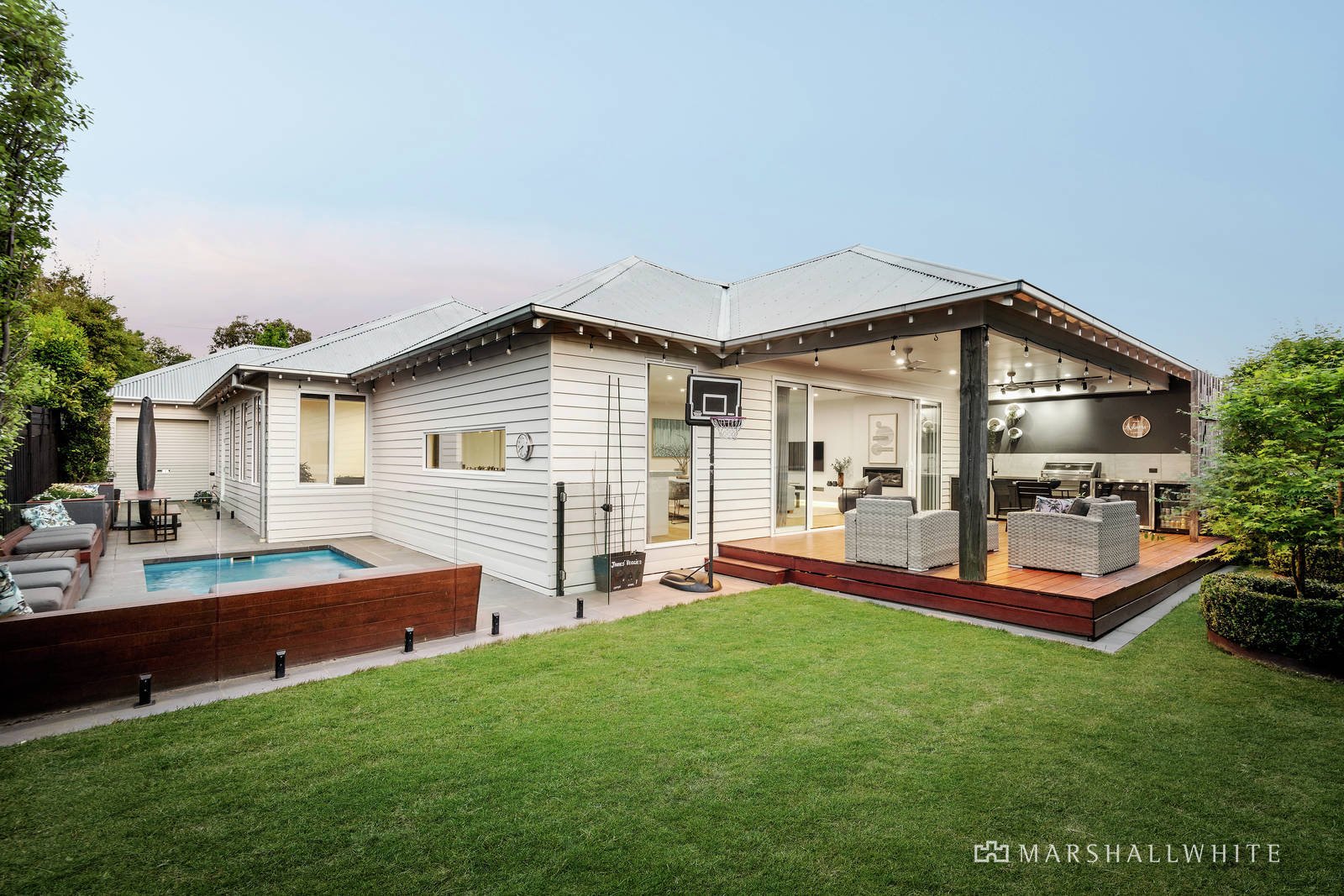 Picturesquely set behind a timber fence and elegant landscape-designed hedged gardens with bluestone edging, the single-level weatherboard home's classic Edwardian-inspired façade features a box bay window and shingle siding detail. Once inside, the contemporary splendour is evident with engineered oak flooring, plantation shutters, lustrous marble surfaces, and bespoke timber joinery enriching the calming coastal style aesthetic. The inspired layout flows intuitively, with the master suite featuring a box bay window seat, a walk-in robe and luxe ensuite, zoned at the front of the home. Another bedroom is serviced by a bathroom/powder room with shower, which has an external door, allowing for poolside bathroom access, while a further two bedrooms, all with built-in robes, adjoin the main bathroom, which has a free-standing tub elegantly set in front of a large picture window. There is a formal living/dining area separate from the open-plan zone with a gas log fireplace and the stunning marble kitchen is designed for large-scale entertaining with an island bench, Bosch appliances including a gas cooktop, oven and dishwasher, and a walk-in pantry. Glass sliding doors open out to the undercover alfresco deck where there is a built-in outdoor 'Cordon Bleu' kitchen with barbecue, sink and drinks fridge, while lighting, heating and a ceiling fan make this expansive area perfect for year-round entertaining. Set in bluestone-paved surrounds, the solar-heated swimming pool is positioned on the northerly side of the home and there is also a good-sized lawn area in the fully fenced, sunny backyard of the 587sqm (approx.) block.