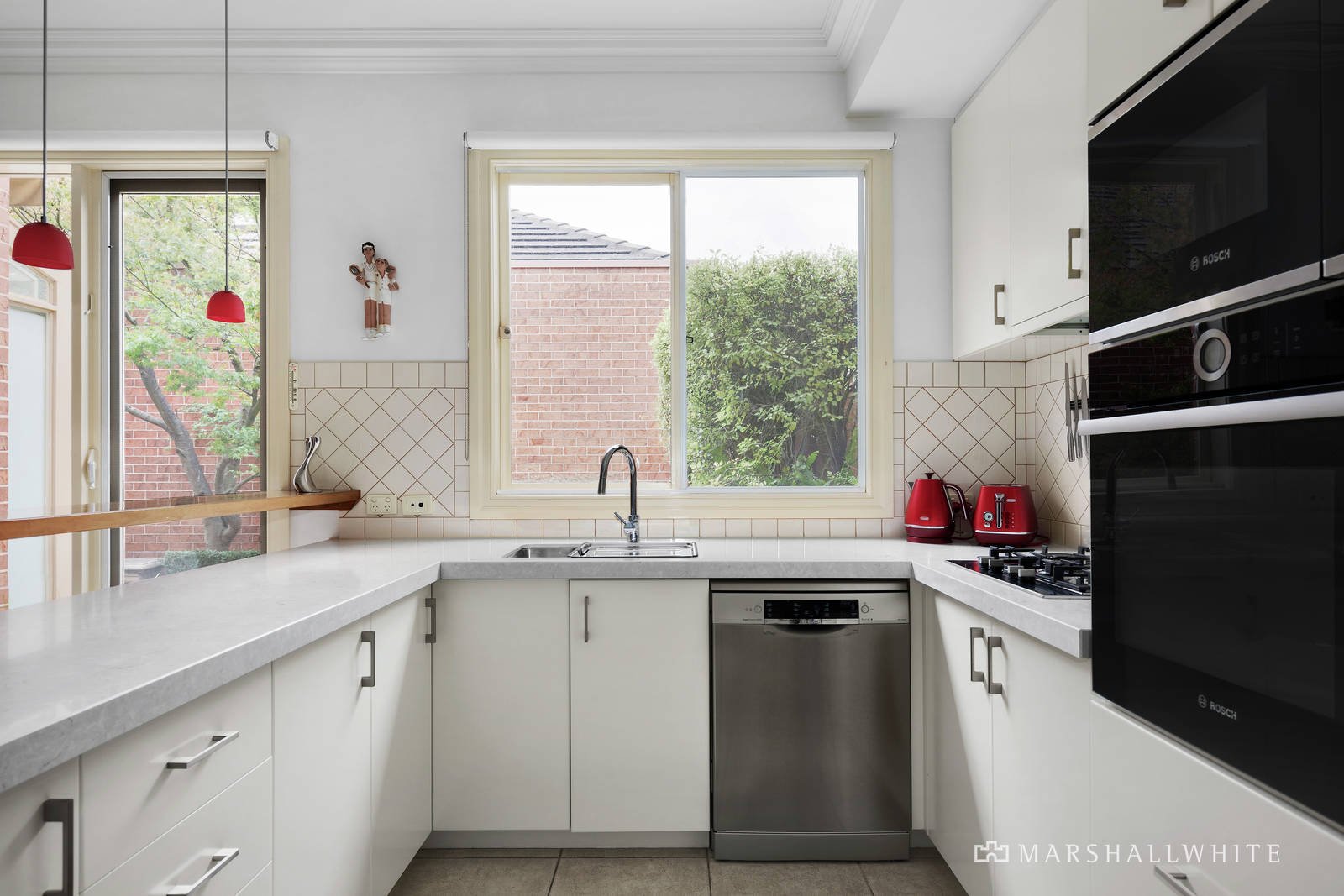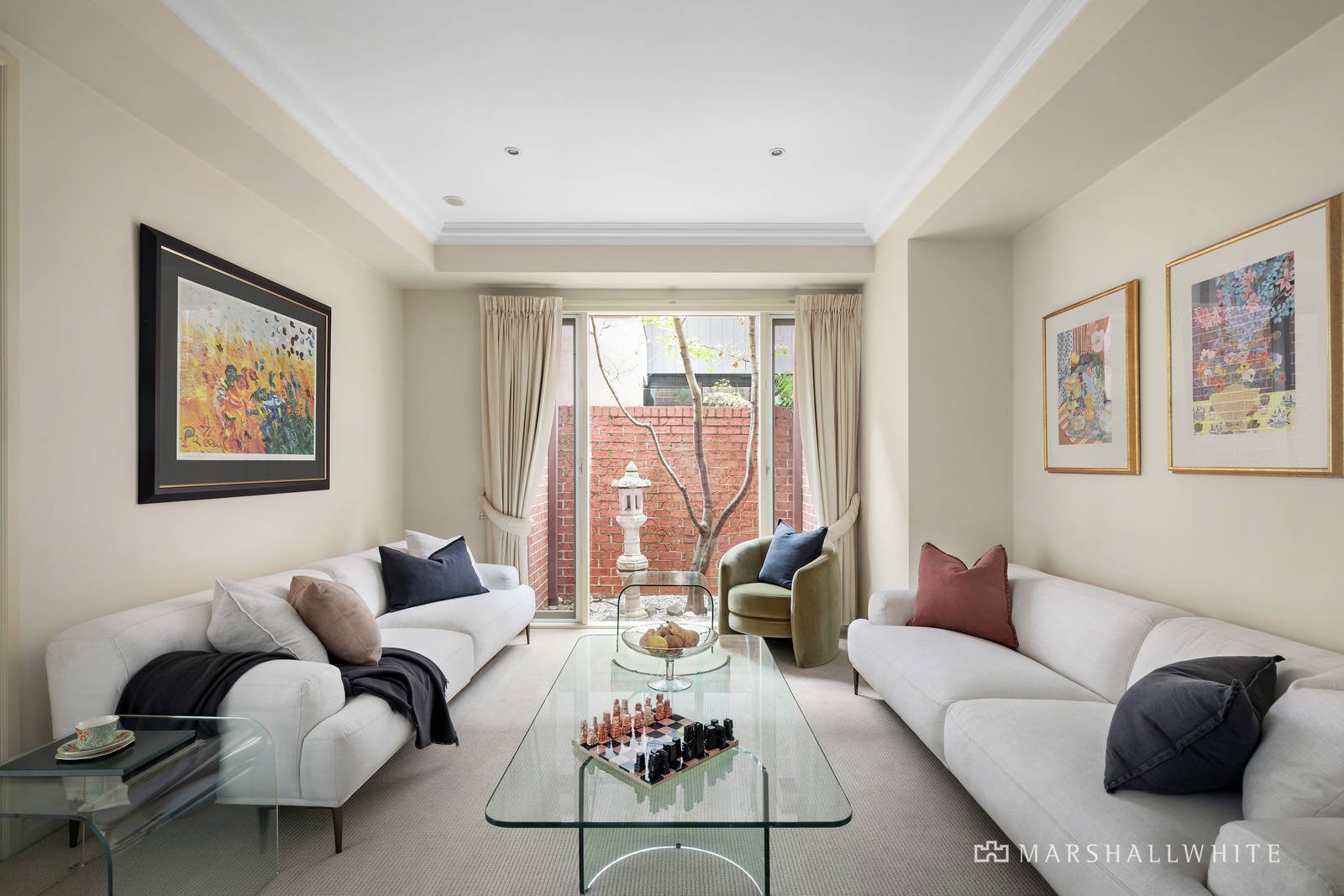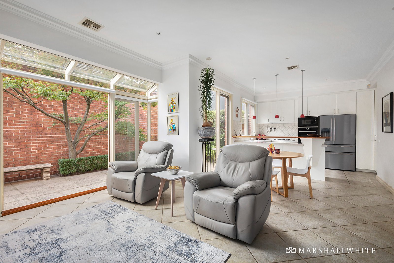 A generous entrance foyer introduces the beautifully proportioned formal sitting and dining room overlooking a tranquil lightwell. Northern light streams through the inviting living and casual dining room served by a gourmet kitchen appointed with stone benches and Bosch appliances. French doors open the living area out to a private north-facing landscaped garden courtyard, a picturesque leafy oasis for al fresco dining. Skylit stairs lead up to the light-filled main bedroom with en suite and walk in robe, two additional robed bedrooms and a stylish bathroom.