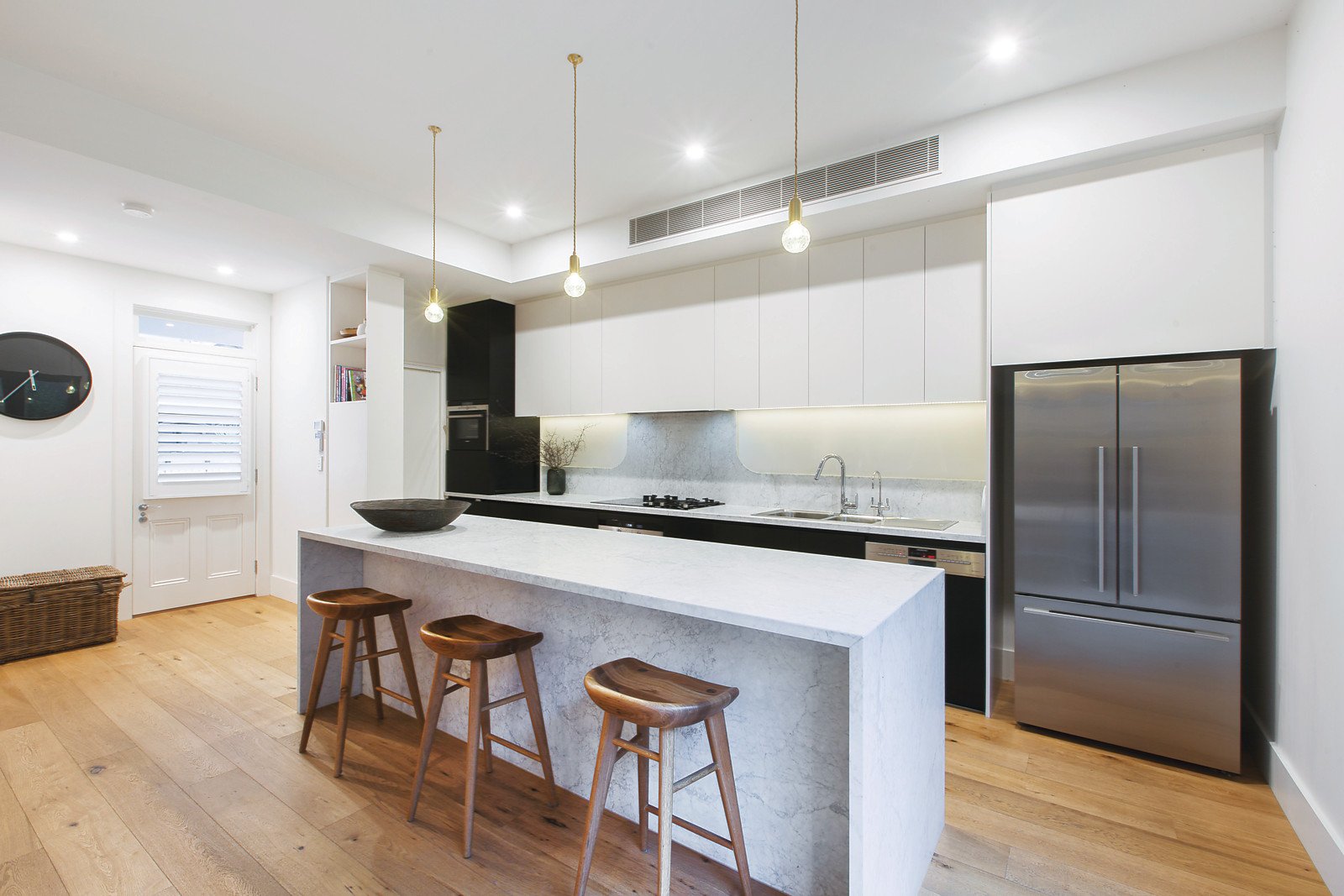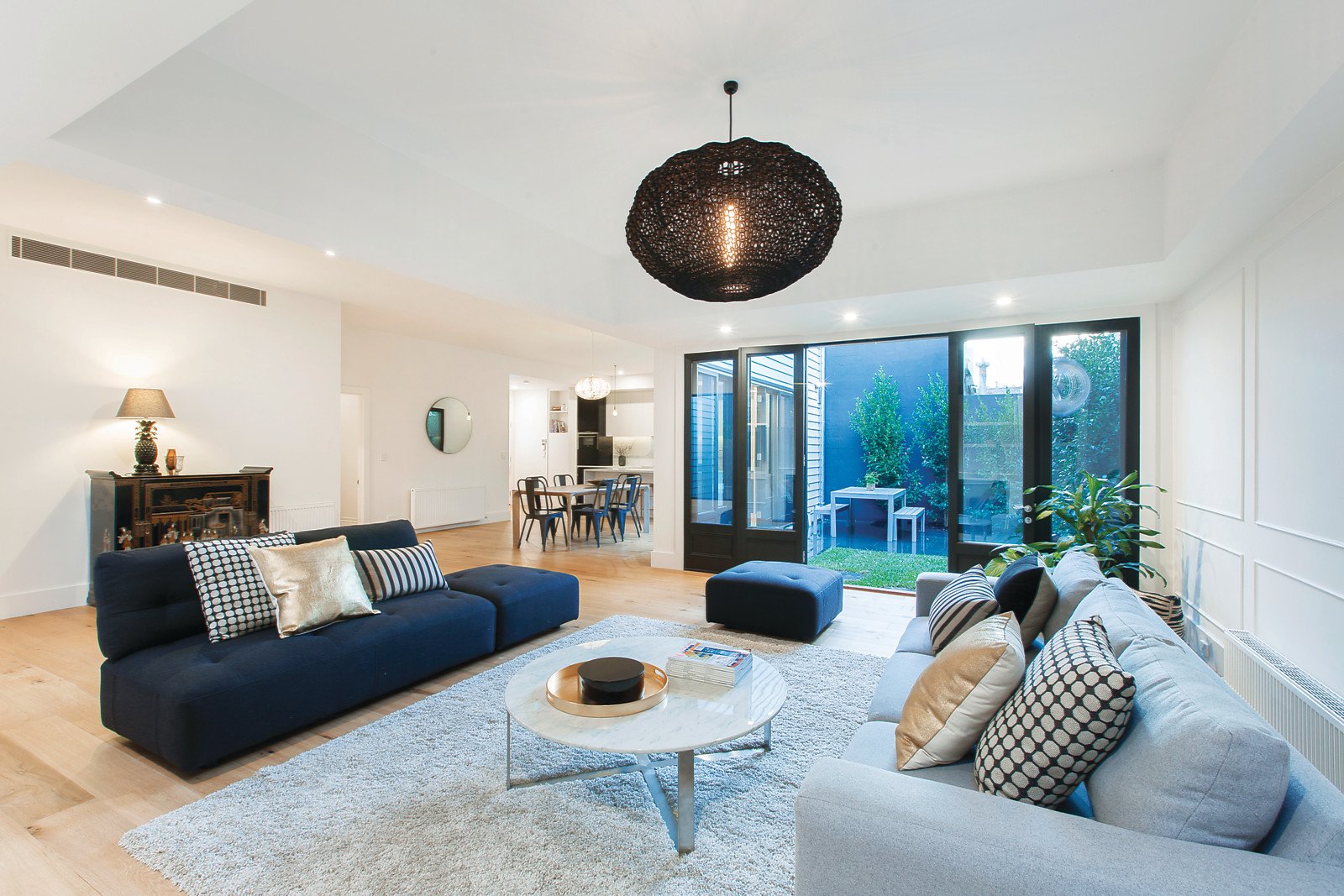 Dramatic high ceilings and wide oak floors make an immediate impression in the arched hallway leading to a fabulous media room/study or 4th bedroom with custom cabinetry. Spectacular in scale and style, the open plan living and dining room with open fireplace and state-of-the art Siemens kitchen with marble benches open through French doors to a private north-facing landscaped courtyard. The main bedroom with stunning stone en-suite, walk-in-robe and open fireplace enjoys downstairs seclusion. A sensational children's zone upstairs comprises two additional double bedrooms with built-in-robes, a study/playroom, large retreat and stunning bathroom.