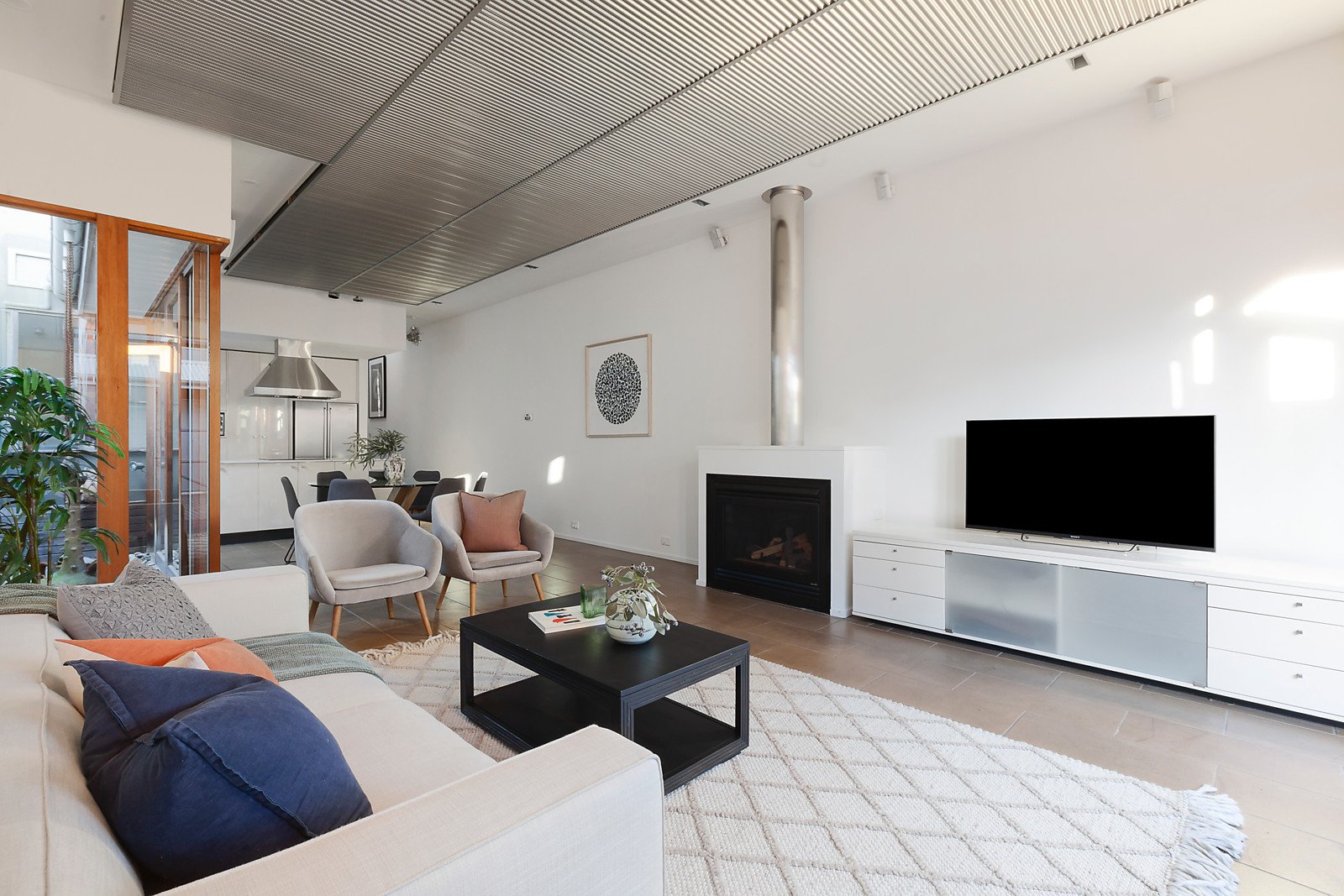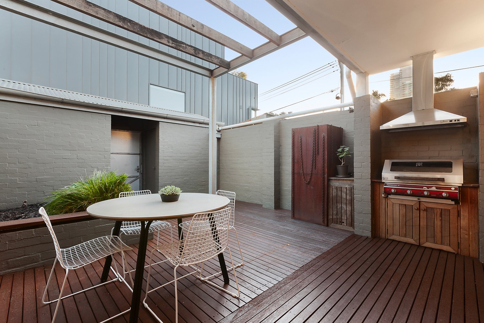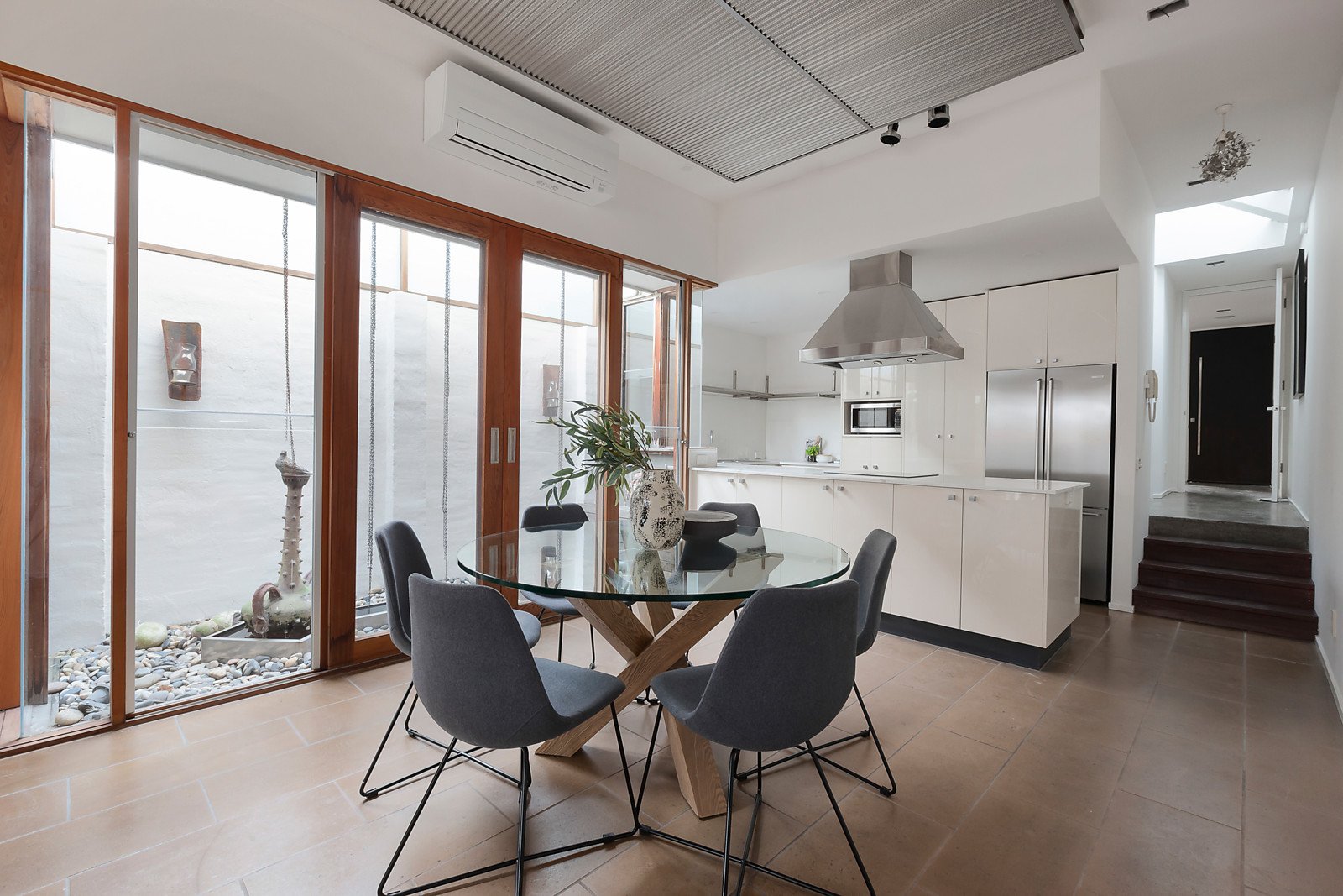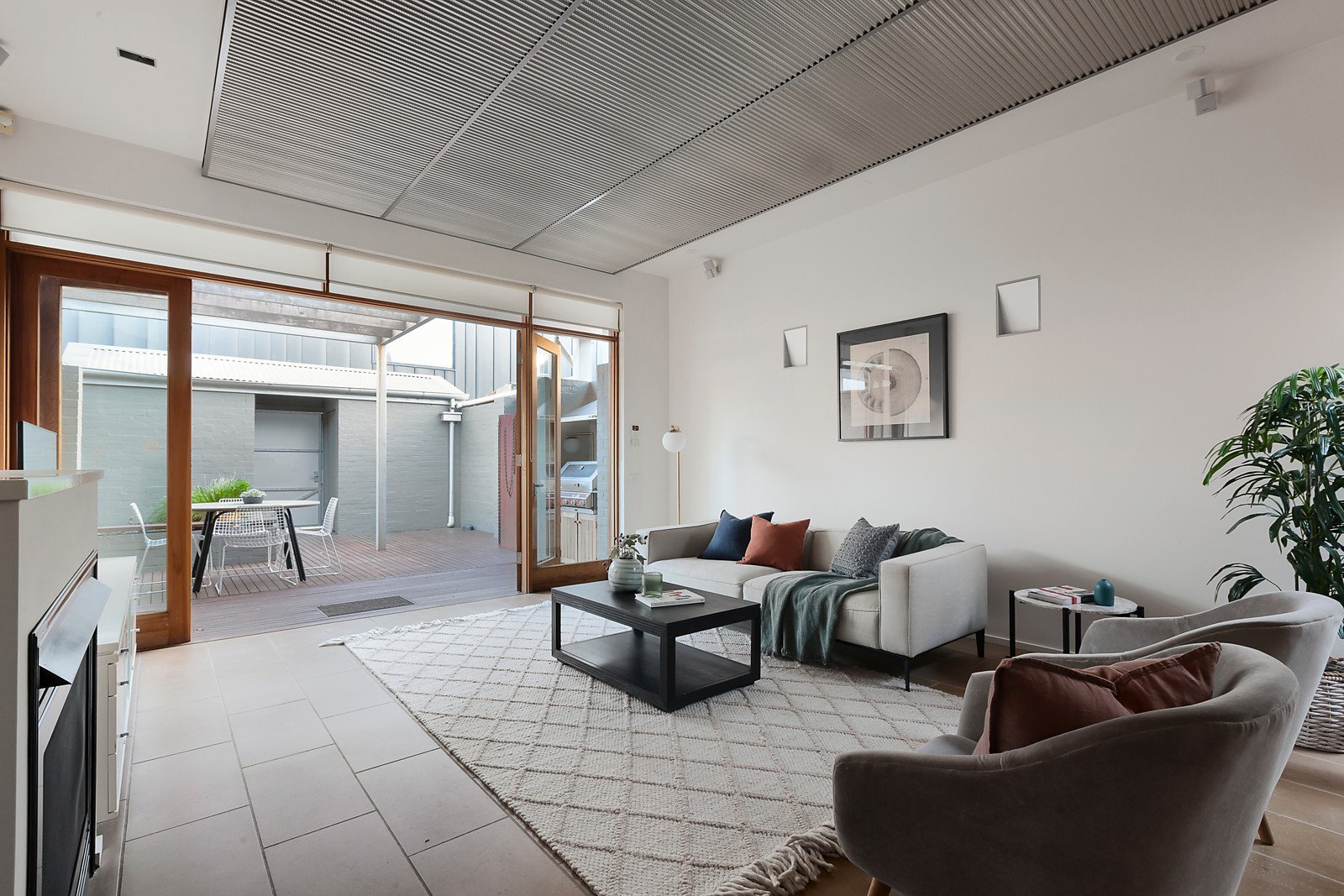 A state of the art design that has brilliantly stood the test of time in terms of both style and quality has created this unique, impressively versatile and aesthetically appealing contemporary residence delivering a coveted inner urban lifestyle walking distance to the South Melbourne market, Clarendon St shops and cafes, the Domain, Albert Park Lake, the Arts Precinct and the city. Distinguished by striking design elements including polished concrete and ceramic tile floors, a stainless steel acoustic ceiling and 2.4 metre high doors throughout, the versatile floorplan begins with a fabulous fitted study or alternatively a third bedroom with adjacent 3rd bathroom conveniently situated at the front for convenient use as a home office. The stylish kitchen featuring stone benches and quality appliances and sensational open plan living and dining room focused around a gas log fireplace and light-well boasting a running water feature opens through bi-fold doors to a private north-facing decked courtyard with covered BBQ terrace. Upstairs the beautiful main bedroom with stunning en-suite, walk in robes and north-facing balcony offering city views is accompanied by a second bedroom with en-suite and built in robes. Inner urban living at its most vibrant, this exceptional home is comprehensively appointed with slab heating, RC/air-conditioning, alarm, ducted vacuum, Bose surround sound, security intercom, security gate, lock up bike storage and right of way.