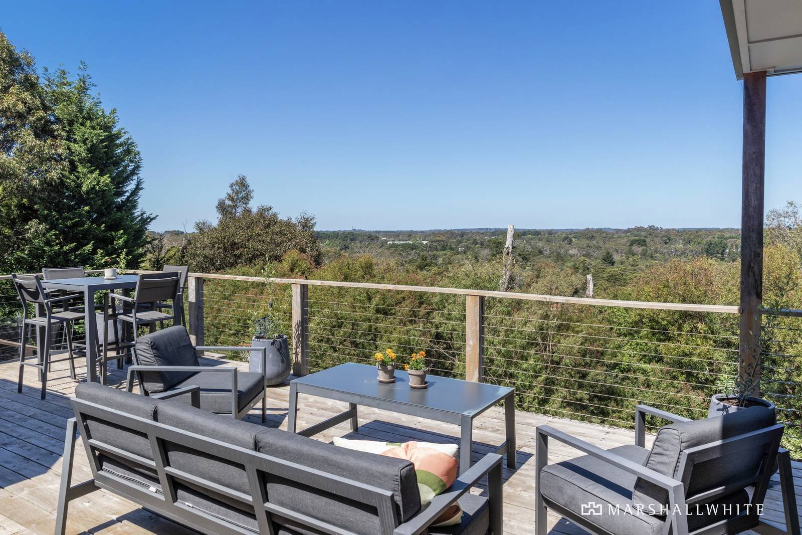 Perched high above Mount Eliza Regional Park, in a tranquil bushland setting commanding panoramic treetop vistas, this fully renovated family home celebrates its privileged natural lifestyle environment with an expansive, elevated entertaining deck and a solar-heated ionized swimming pool.