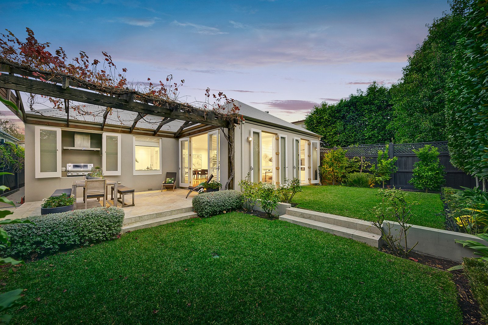 Exceptionally generous proportions accentuated by high ceilings and wide messmate floors are highlighted through the inviting entrance hall leading to elegant sitting room boasting limestone OFP, three lavish bedrooms all with designer en-suites and including the magnificent main with his/her WIRs, study and 4th stylish bathroom. The state of the art gourmet kitchen features Miele appliances, stone benches, butler's pantry and adjacent cellar/store room. Vaulted ceilings add an impressive scale to the sensational living and dining room (gas log fireplace) opening out to a refined private northwest garden with a wonderful vine covered BBQ terrace perfect for al fresco dining.