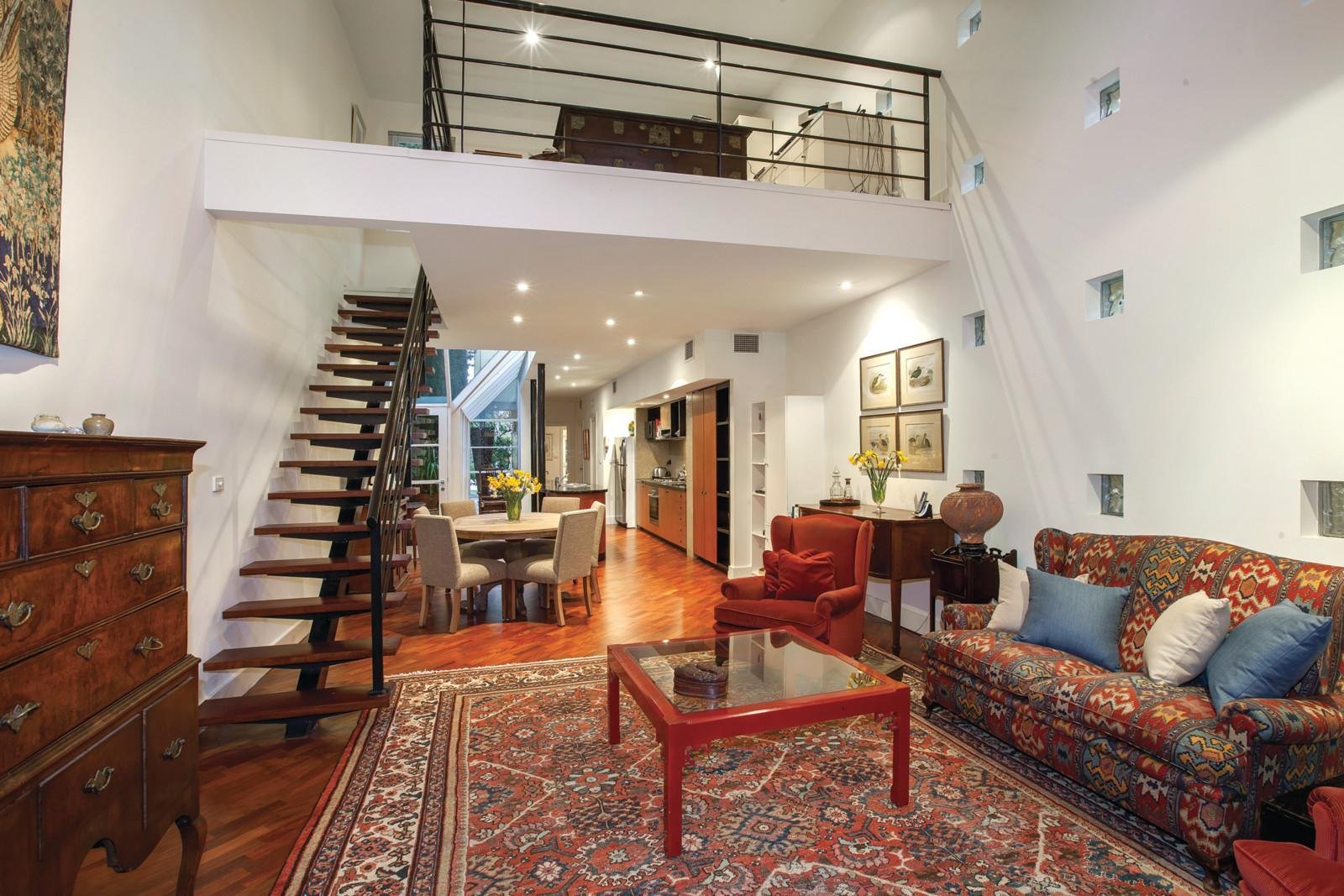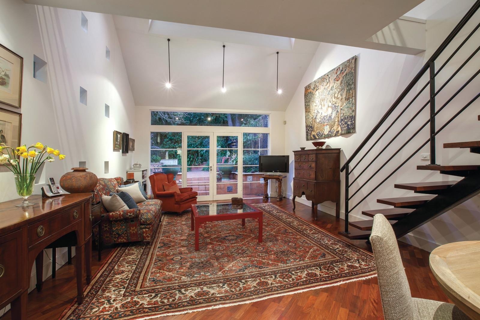 Brilliantly designed to bring garden aspects in, floor to ceiling glass and timber parquetry floors distinguish the generous living and dining room with striking gourmet Miele kitchen boasting an elegantly curved stone bench. French doors open to a completely private garden oasis with a fabulous entertaining terrace. A versatile bedroom or sitting room (OFP) with adjacent mosaic bathroom is also ideal as a home office with its own private entry from the northern courtyard. Two staircases lead upstairs to two spacious bedrooms, a stylish bathroom and clever mezzanine study.