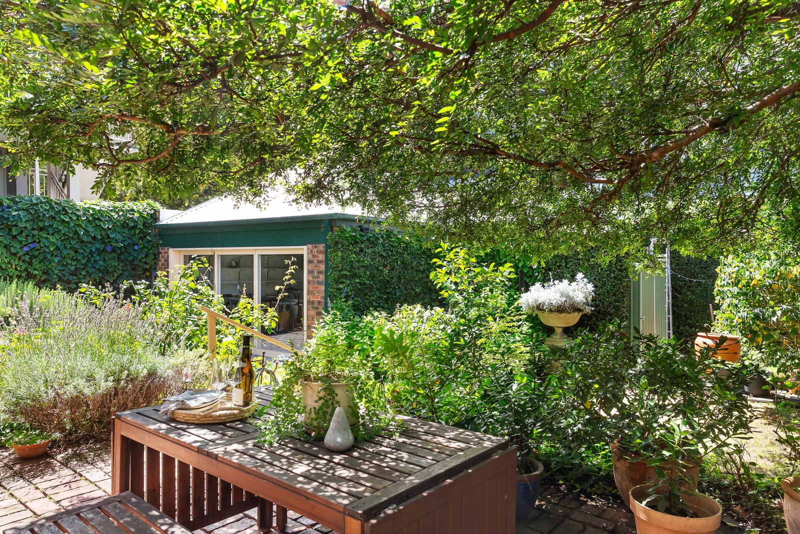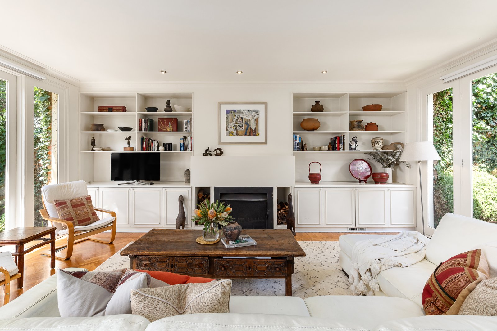Behind a tessellated verandah, the magnificent arched hallway featuring soaring ornate ceilings, leadlight windows and Baltic pine floors introduces an elegant sitting room with marble fireplace and French doors to a tranquil central courtyard with water feature. The palatial living and dining room with an alcove and open fire is served by a separate well equipped timber kitchen. Three sets of French doors take the living out to the leafy private northeast facing garden oasis and a versatile freestanding studio or home office. The generous main bedroom with fireplace, en suite and walk in robe is accompanied by two additional king-sized bedrooms with marble fireplaces and a bright bathroom.