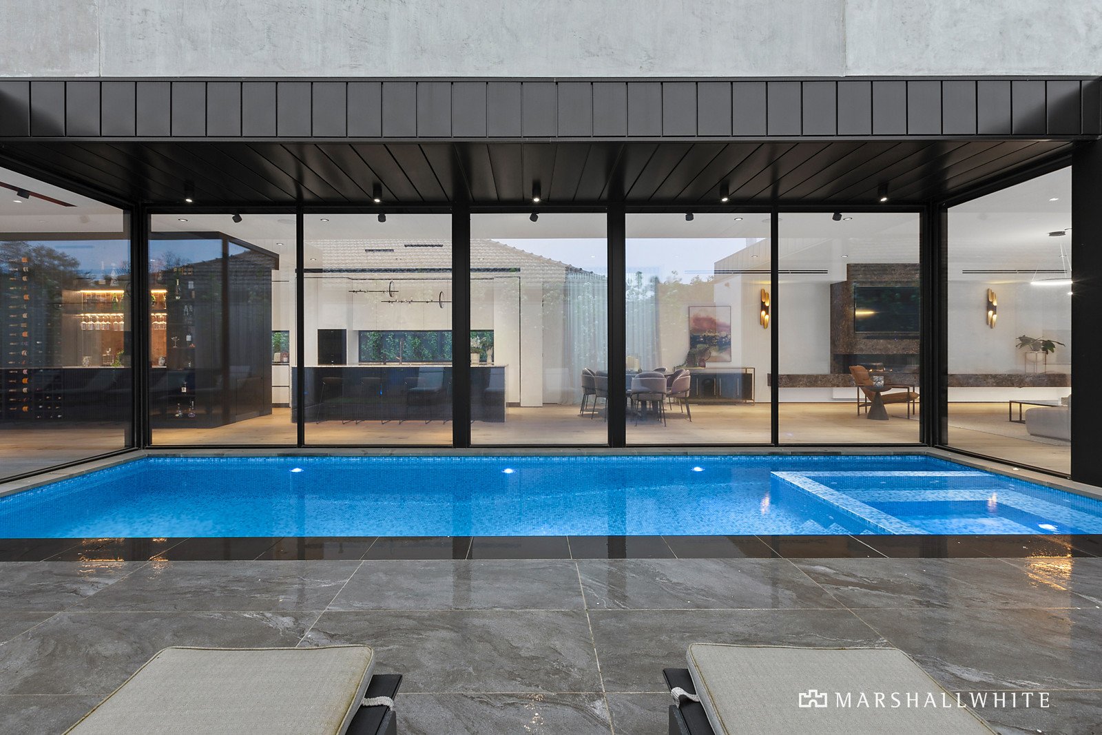 Perfect for entertaining in style, the central mosaic pool and alfresco zone is flanked by the open plan living spaces, where floor to ceiling windows and sliding doors create a wonderful connection with outside. A gas fireplace complements the living area, while designated spaces for dining, relaxing and cooking are accompanied by a suite of Miele appliances, comprehensive butler's pantry and marble island.
