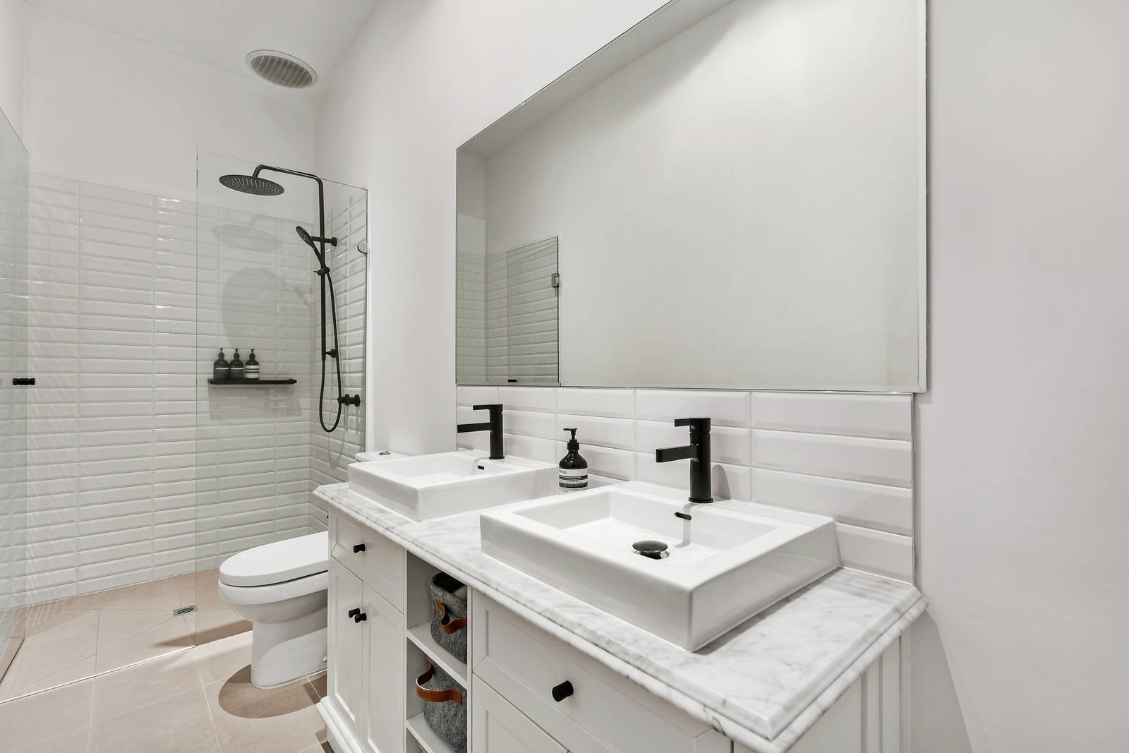 The crisp white interior has been completely renovated with contemporary designer style whilst retaining many of its prized period attributes including original iron lacework, tessellated tile & bullnose verandah, high ceilings and an arched polished timber hallway. Complemented by four bedrooms all with BIRs or 3 bedrooms and a separate living zone, two pristine bathrooms, laundry plus a light filled large home office. Delivering flexible accommodation or space the stunning rear extension with vaulted ceilings and large glass areas has ample room to entertain; incorporating a superbly appointed kitchen with stone bench-tops and prestige Miele appliances. The spacious living and dining area opens out through double doors to a north-west facing terrace and private hedged garden - perfect for indoor/outdoor relaxation, barbeques and alfresco dining. Other features include alarm, plantation shutters, reverse cycle heating and cooling, Heat 'n Glo FP (living), landscaped gardens and a cubbyhouse.