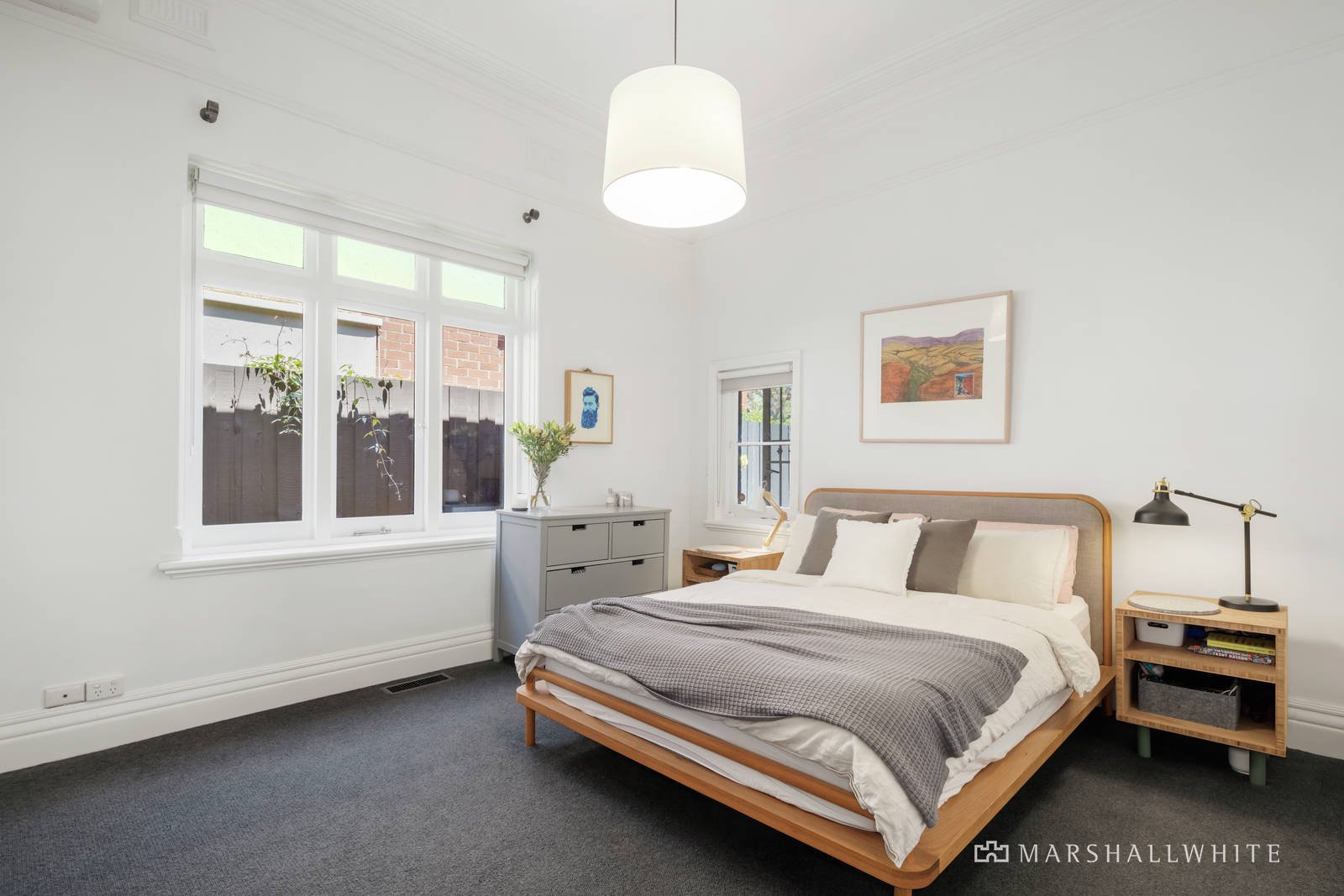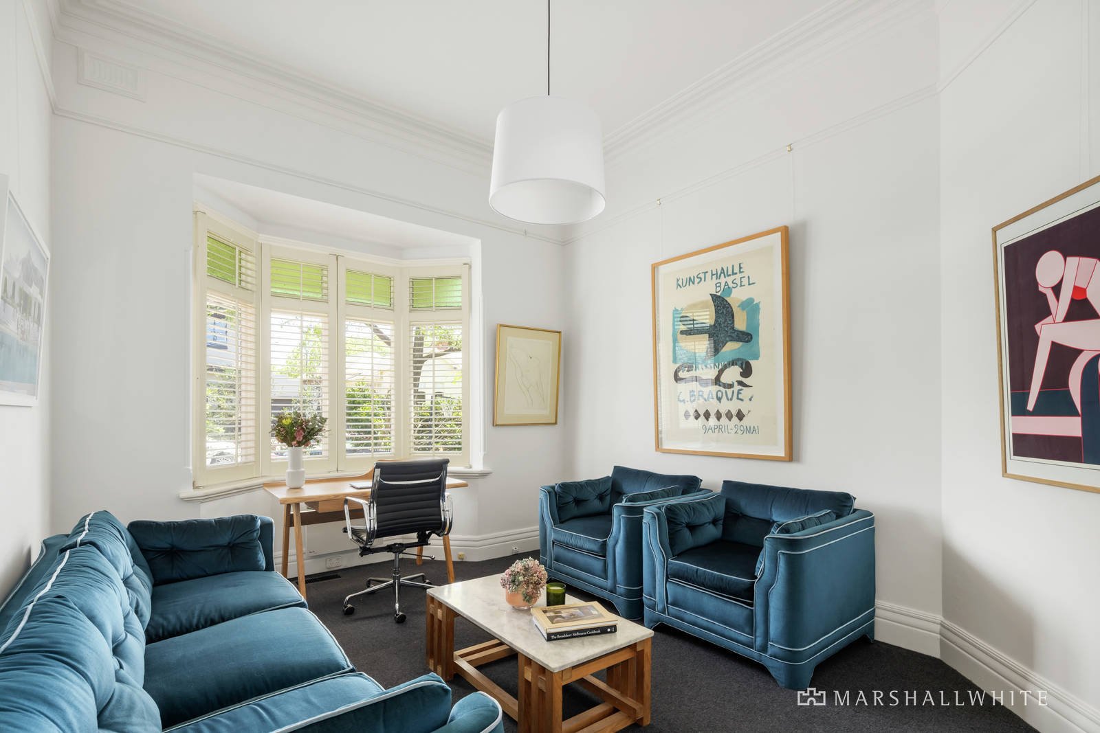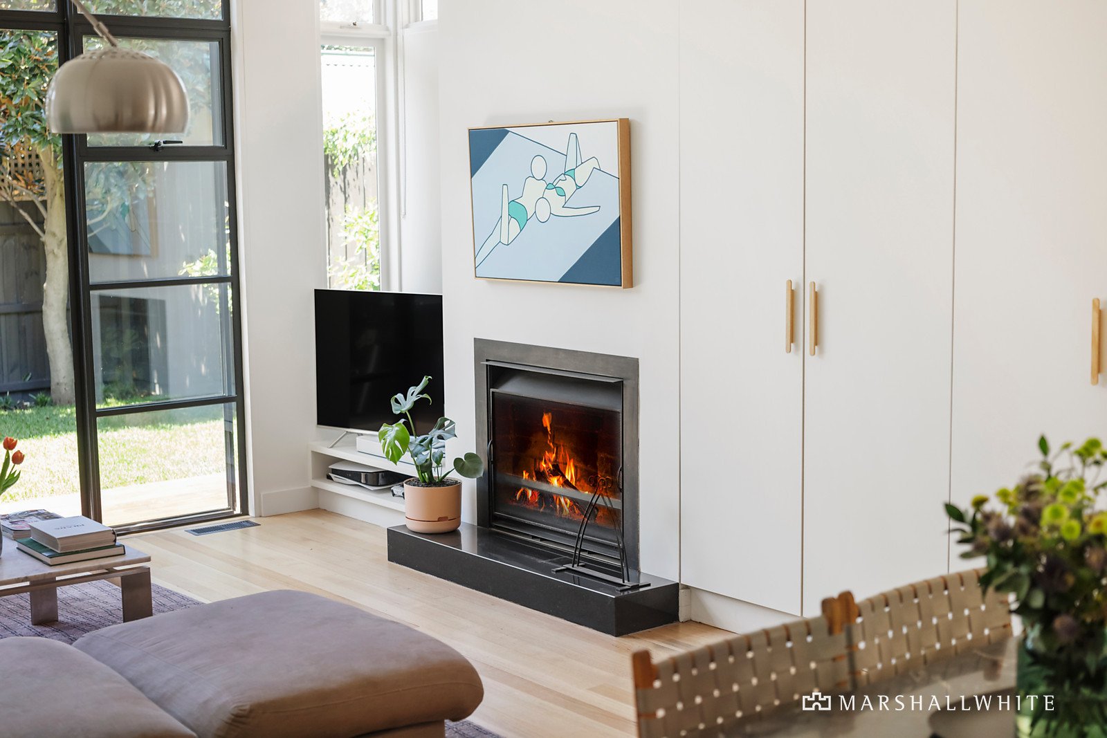 Glorious period features including high ceilings create an irresistible first impression in the L-shaped hallway with Baltic pine floors and the elegant sitting room or third bedroom with a bay window study nook. Two gorgeous double bedrooms with open fires and built-in robes are accompanied by a stylish bathroom. The high ceilings have been maintained through the expansive open plan living and dining room boasting an open fire and sublime gourmet kitchen with white stone benches and an Ilve oven. A full bank of black steel framed windows and doors open to the private landscaped northeast garden with a deck and paved terrace, framed by a row of Magnolias.