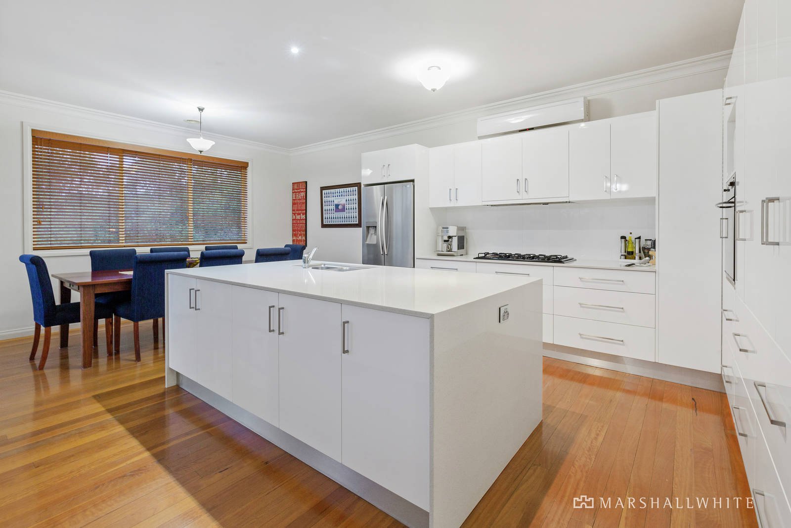 The warm hardwood hallway opens to a light filled kitchen, dining and living space with gas fireplace. The beautifully appointed kitchen boasts a huge stone waterfall island bench with cupboards on both sides, wall oven, 900mm gas cooktop, integrated dishwasher and abundant soft close cabinetry. Facing the dining space and with easy access to the adjoining decked alfresco with tree top views, this will certainly be a celebrated space.