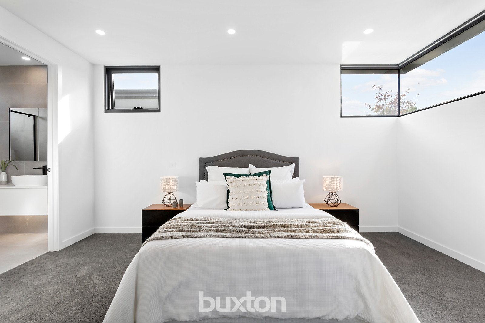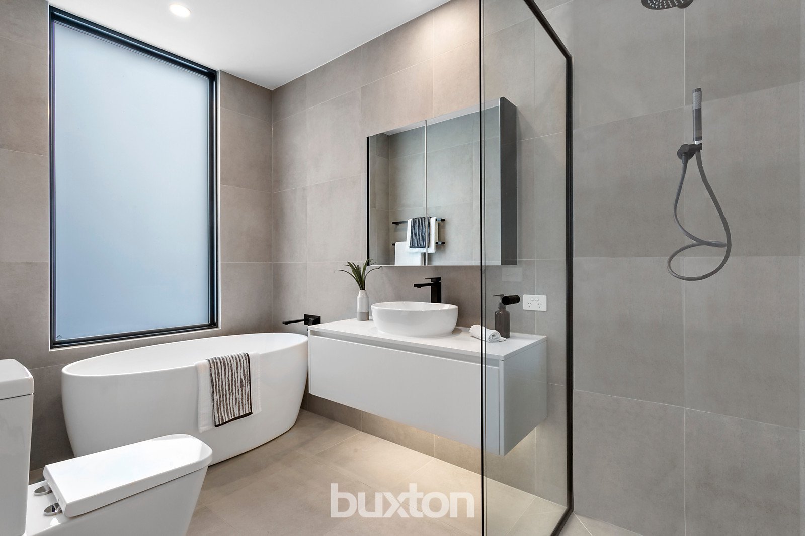 For superior comfort, the upstairs main bedroom boasts a walk-in robe and seductive ensuite fitted with floor-to-ceiling porcelain tiling. A similarly styled central bathroom with beautiful free-standing tub accompanies two further robed double bedrooms. Quality features abound, including a powder room, high ceilings, double glazing, contemporary oak floorboards, heating/air-conditioning, ducted vacuum, security, video intercom and an auto garage.