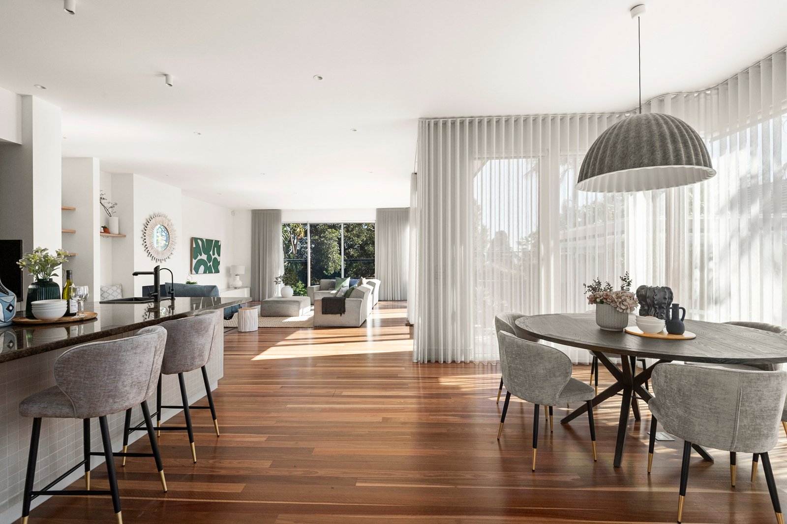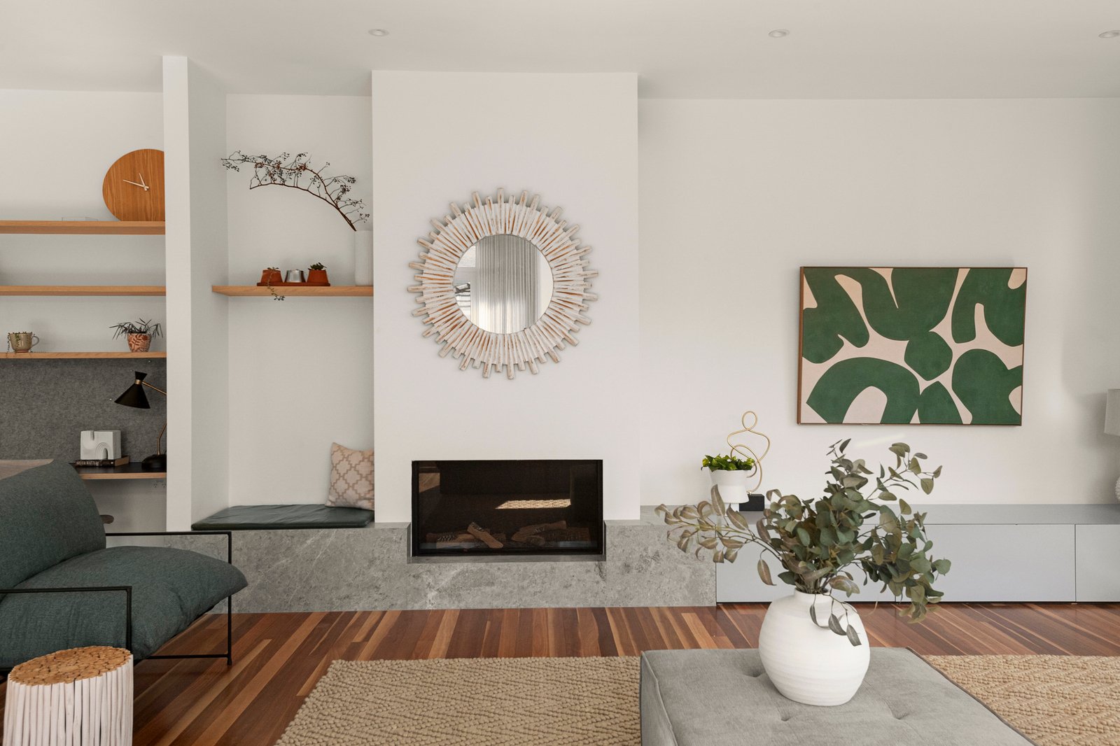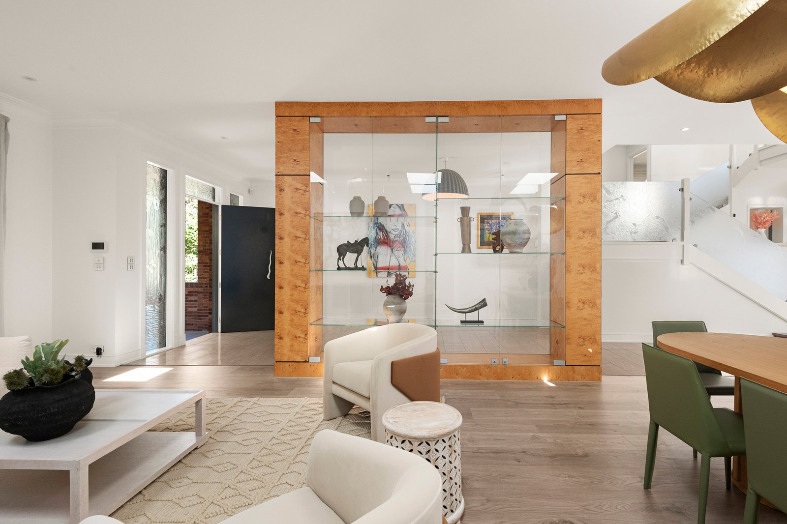 Serene, beautifully considered interiors are anchored by elegant windows that welcome abundant northern light and elevated garden outlooks throughout, while the split-level design creates a natural sense of separation and flow across every stage of family life. The open plan living and dining room features a gas fireplace, study nook and gorgeous elevated garden views, stepping out to a north facing terrace, while a formal living room provides an additional zone for quiet retreat.