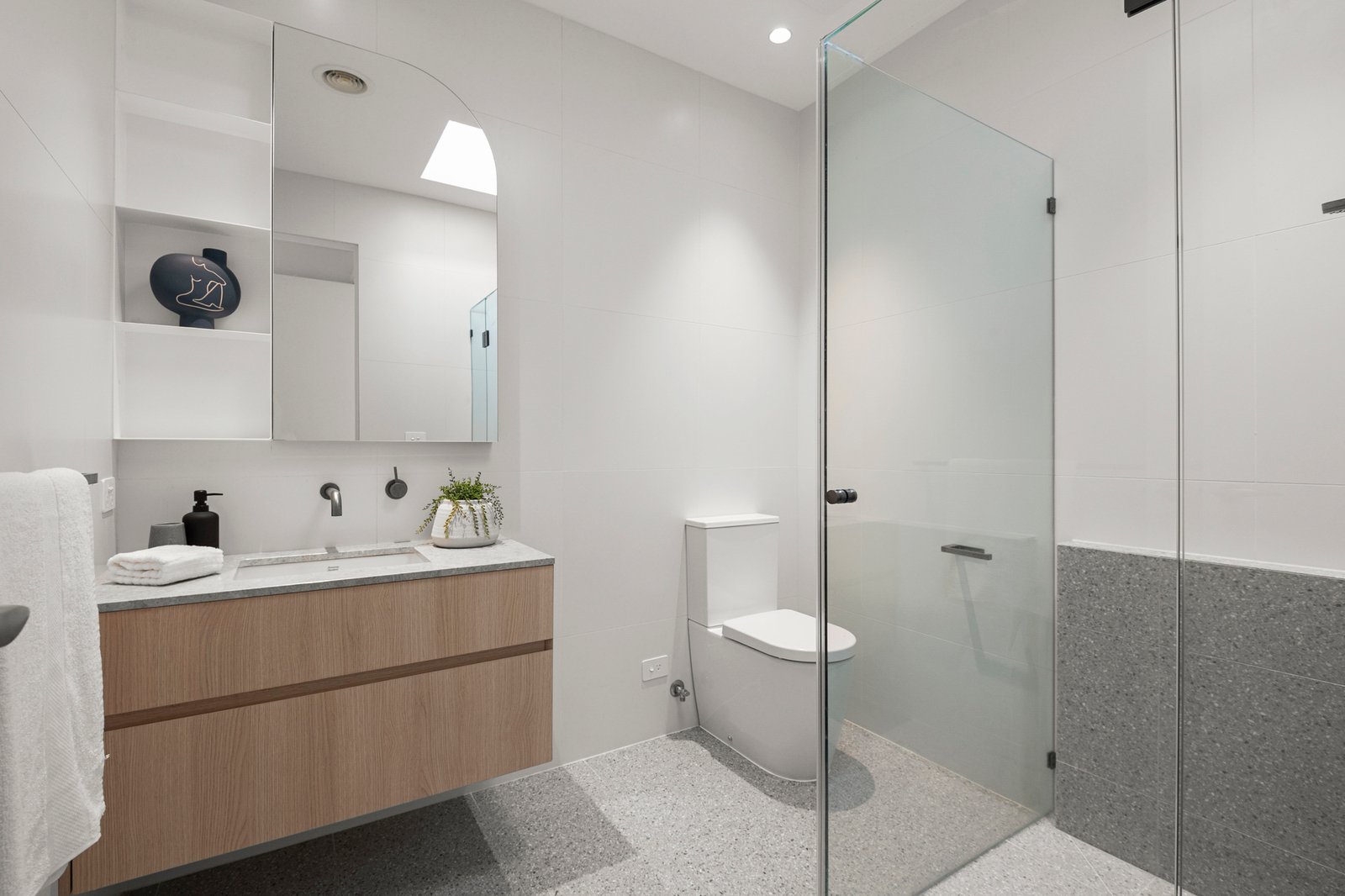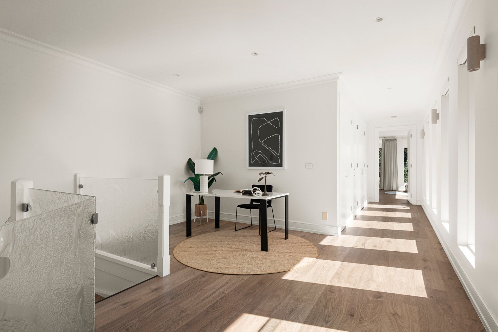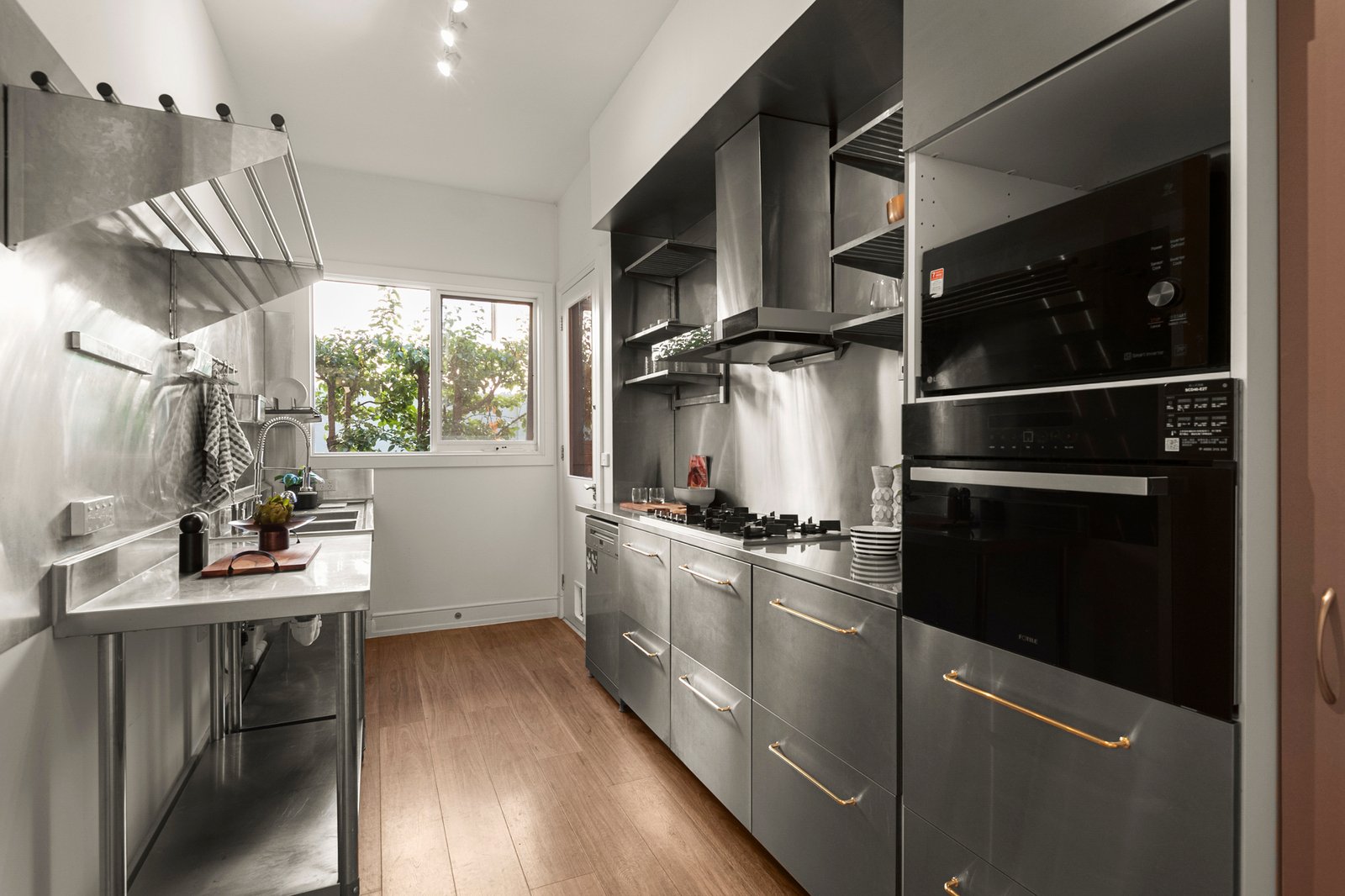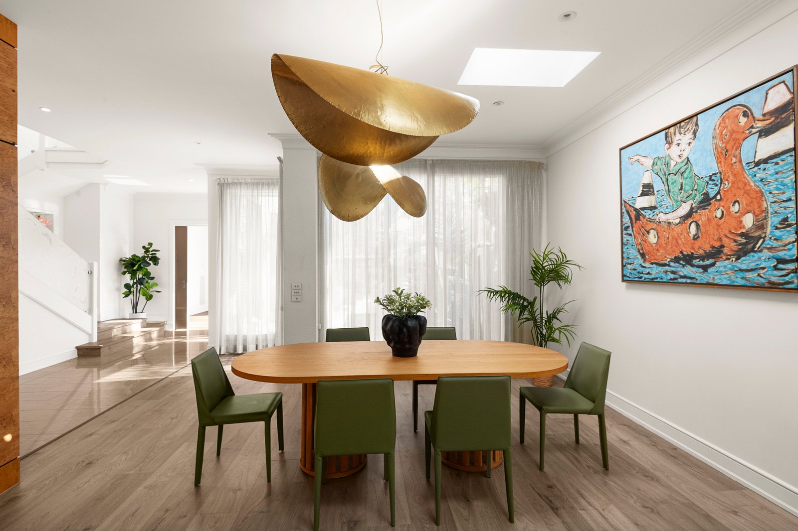 Serene, beautifully considered interiors are anchored by elegant windows that welcome abundant northern light and elevated garden outlooks throughout, while the split-level design creates a natural sense of separation and flow across every stage of family life. The open plan living and dining room features a gas fireplace, study nook and gorgeous elevated garden views, stepping out to a north facing terrace, while a formal living room provides an additional zone for quiet retreat.