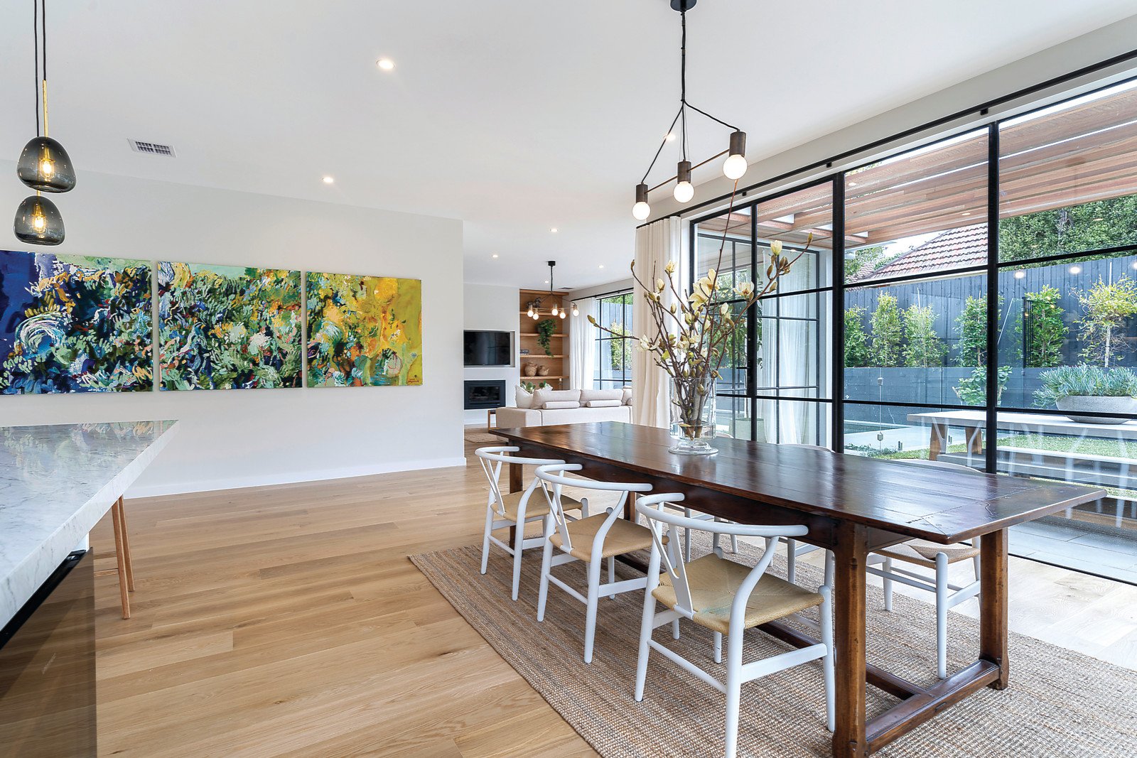 Wide American Oak floors and bespoke joinery add a contemporary aesthetic to the ornate original ceilings in the very wide entrance hall and elegant sitting room with open fireplace. A state of the art gourmet kitchen is appointed with Miele appliances, integrated fridge/freezer, marble benches and a butler's pantry. The expansively proportioned living and dining spaces with a gas fireplace open through full height black steel framed doors to a stunning northwest private landscaped garden with pergola covered BBQ terrace and heated pool. The downstairs main bedroom with a lavish en-suite and walk in robe and a second downstairs bedroom with built in robe and stylish bathroom are matched by a sensational upstairs children's zone comprising three additional double bedrooms with built in robes, a large retreat, fitted study and third designer bathroom.