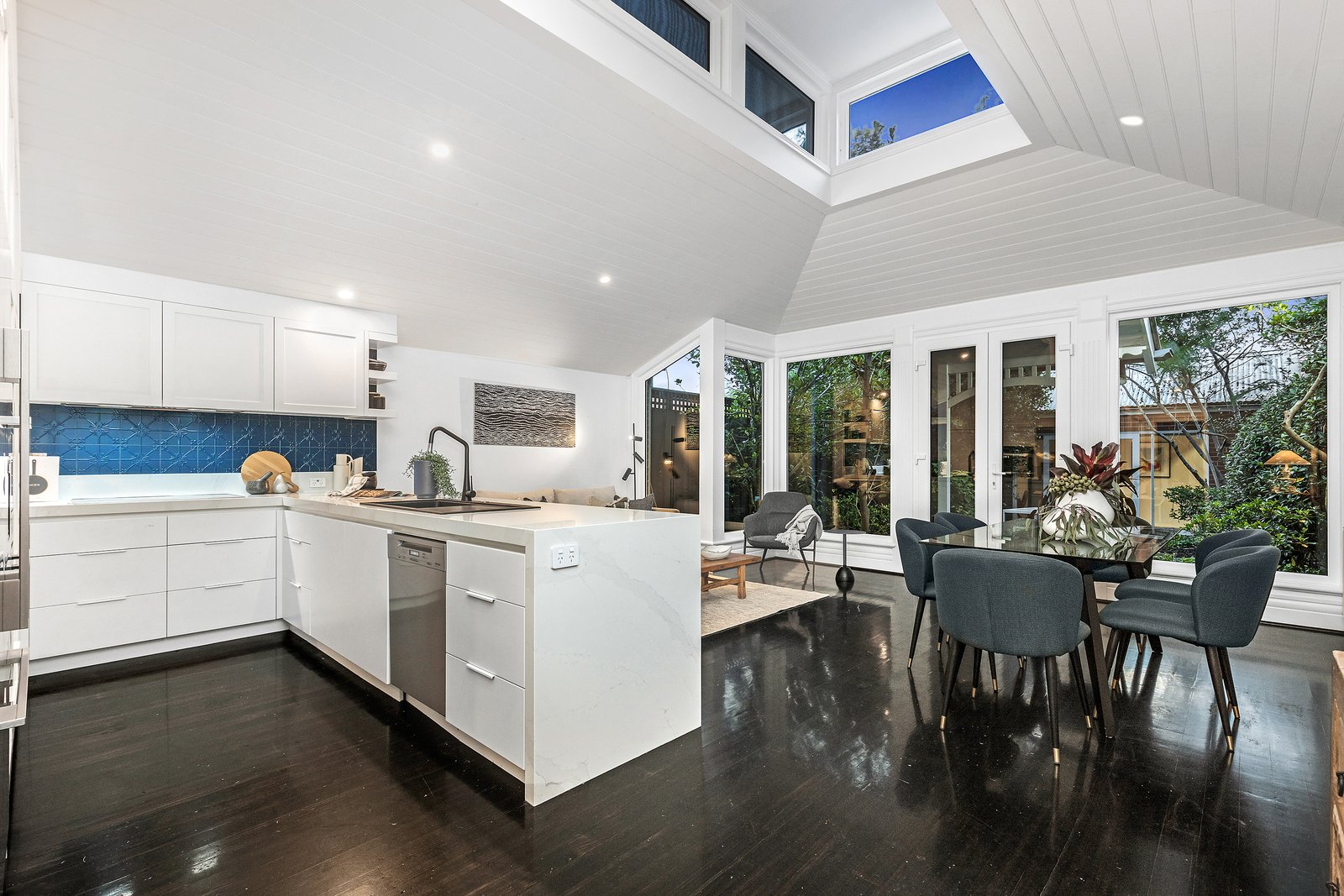 Oriented to capture year-round greenery, the gourmet kitchen, with stone benches and all-Miele appliances, caters to every need, opening through French doors to lush, private gardens. Also overlooking the garden, the garage doubles as a studio/home office, offering an excellent option for those seeking additional space.