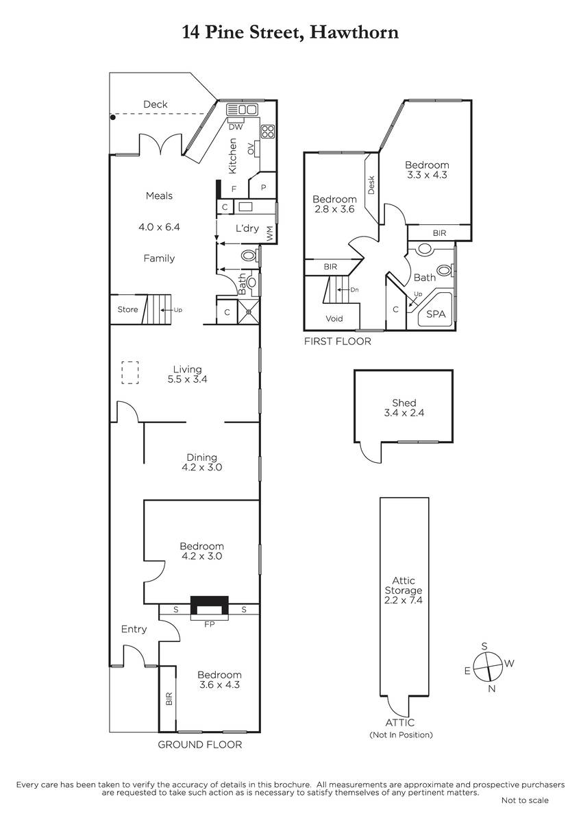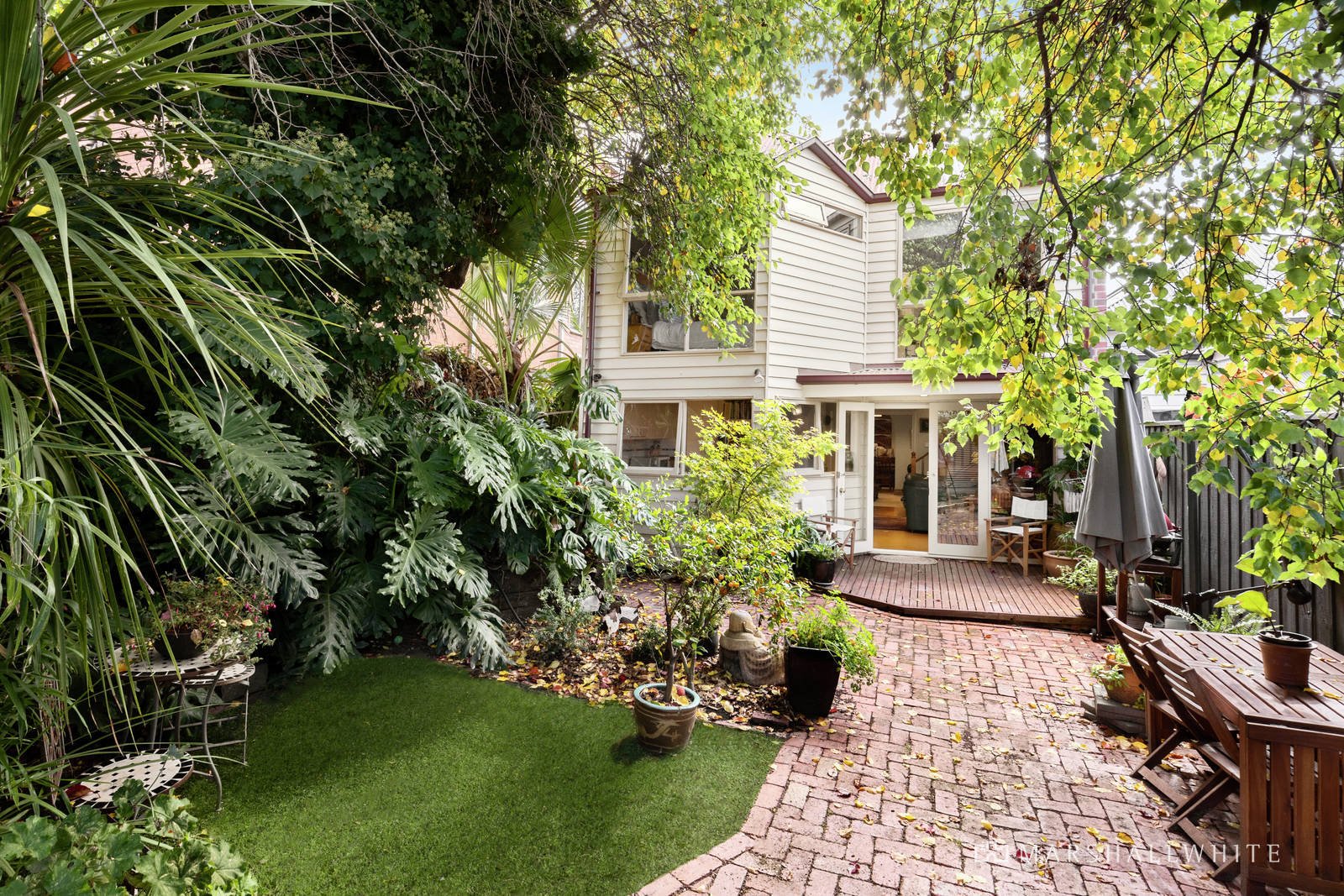 Glorious high ceilings are highlighted in the wide entrance hall featuring decorative fretwork, elegant formal dining room and a gracious living room. The casual family room and well-appointed kitchen with European appliances opens to the leafy private garden with car access via a rear right of way. A beautiful main bedroom with fireplace and robes, a second double bedroom and a bathroom are downstairs while two additional light-filled bedrooms with robes and a bathroom with spa-bath are upstairs.