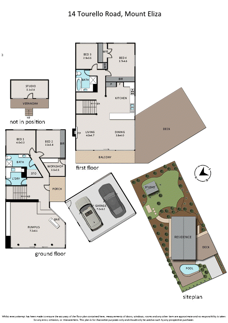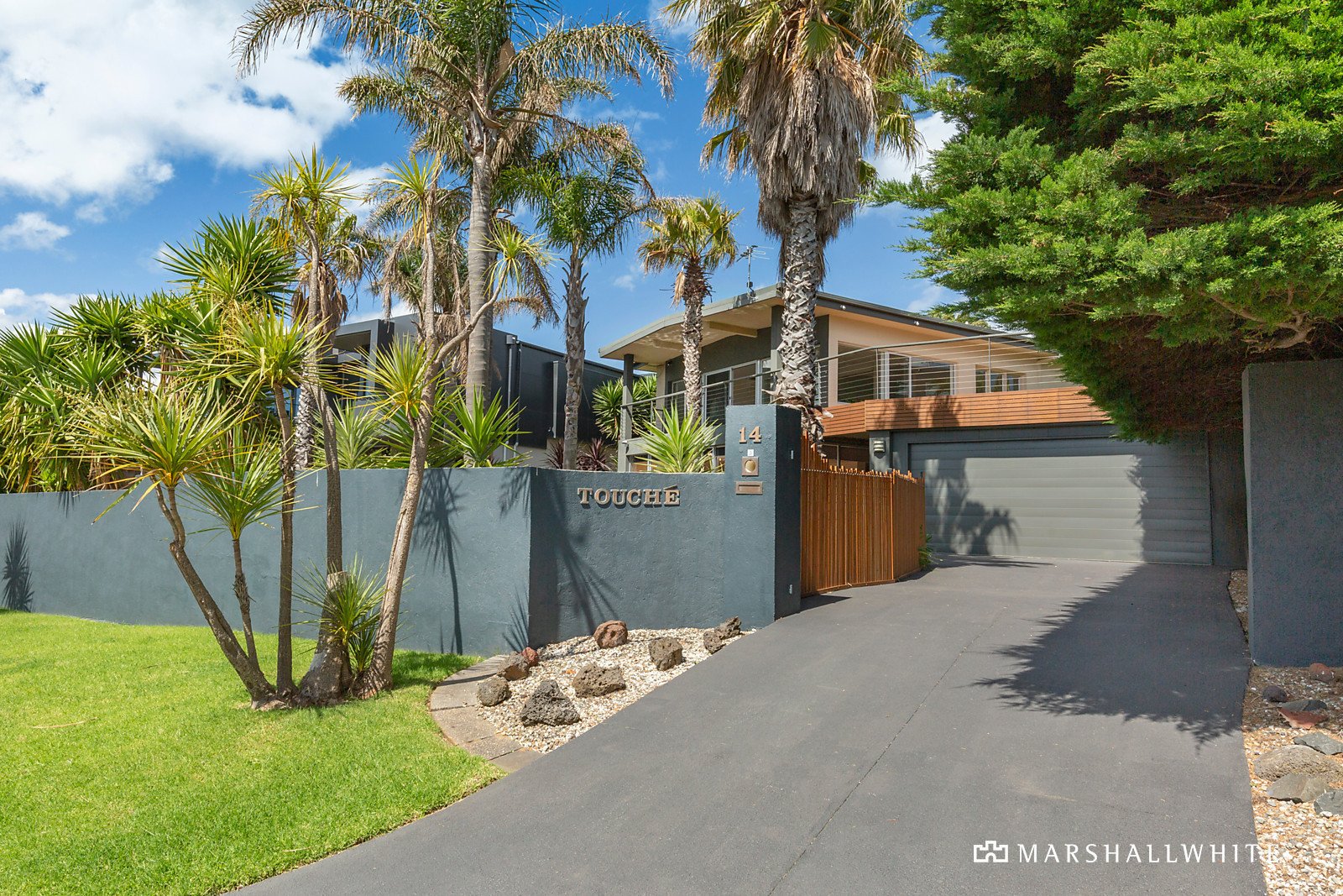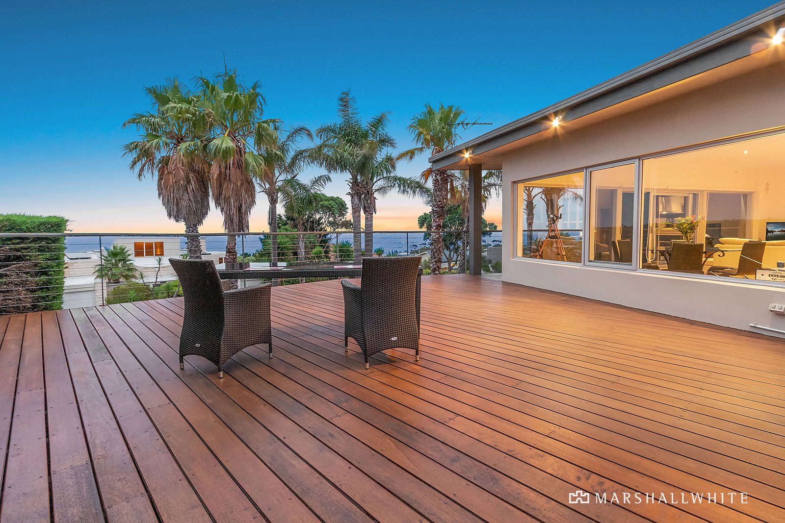 A spectacular resort-style home with lagoon pool and detached home office/studio, set against a backdrop of tall palm trees and panoramic views across Port Phillip Bay.