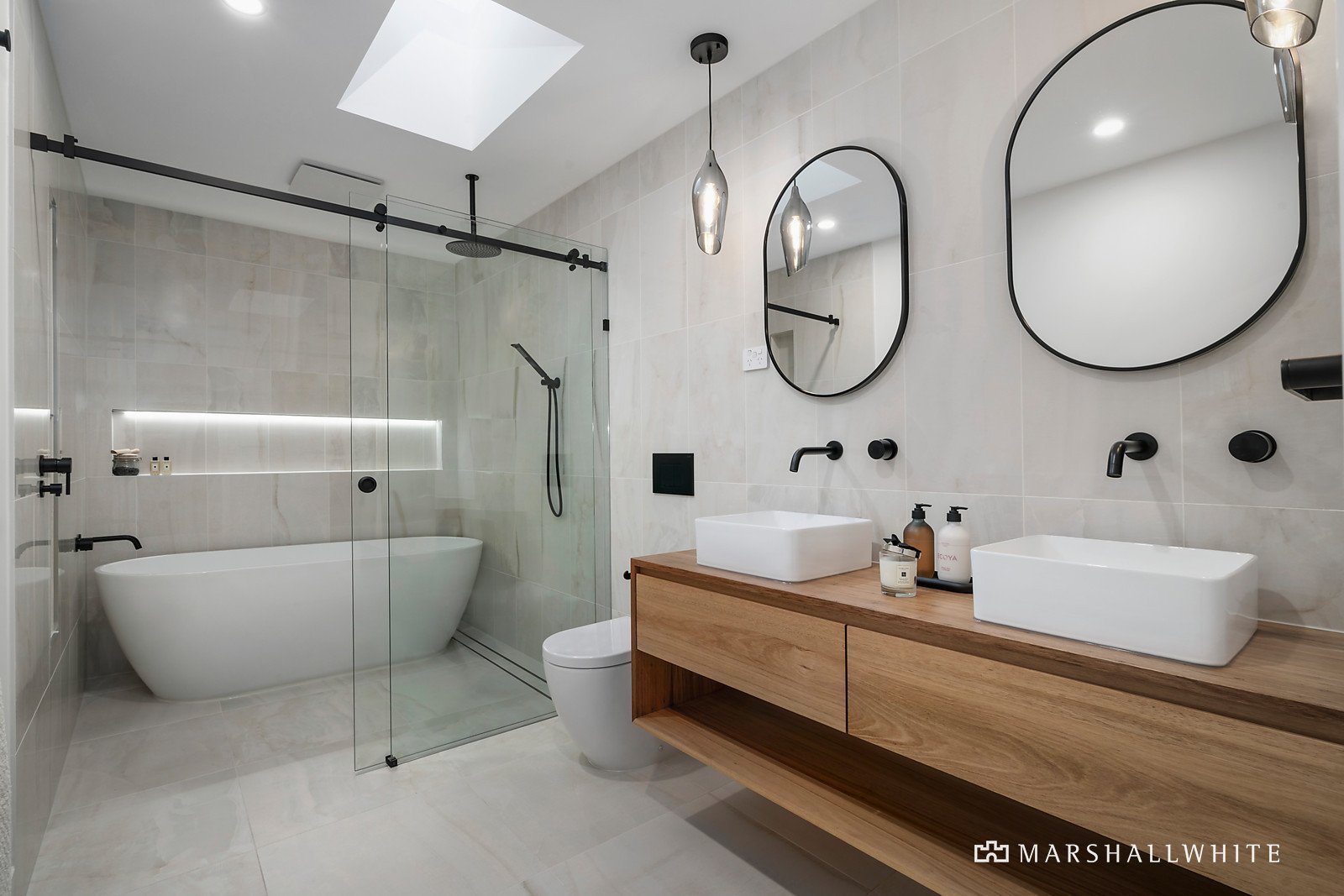 Entirely private, the sumptuous main bedroom sits within its own elevated wing, exuding an air of refinement through wall-to-wall panelling, concealing walk-through robes and a luxurious sky-lit ensuite with a freestanding tub. Two additional bedrooms with ensuites are set within a separate first-floor wing, including the large second primary suite with abundant storage and luxe ensuite.